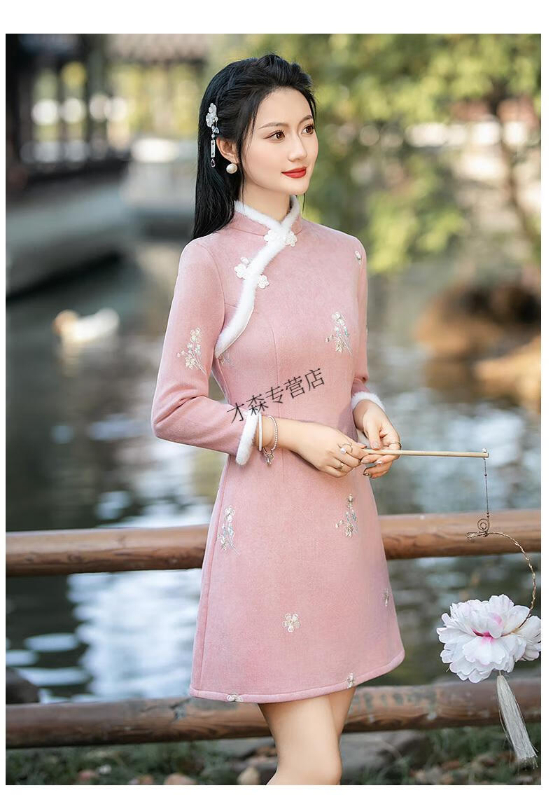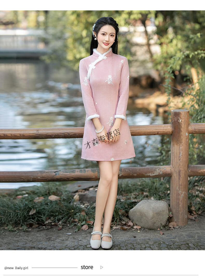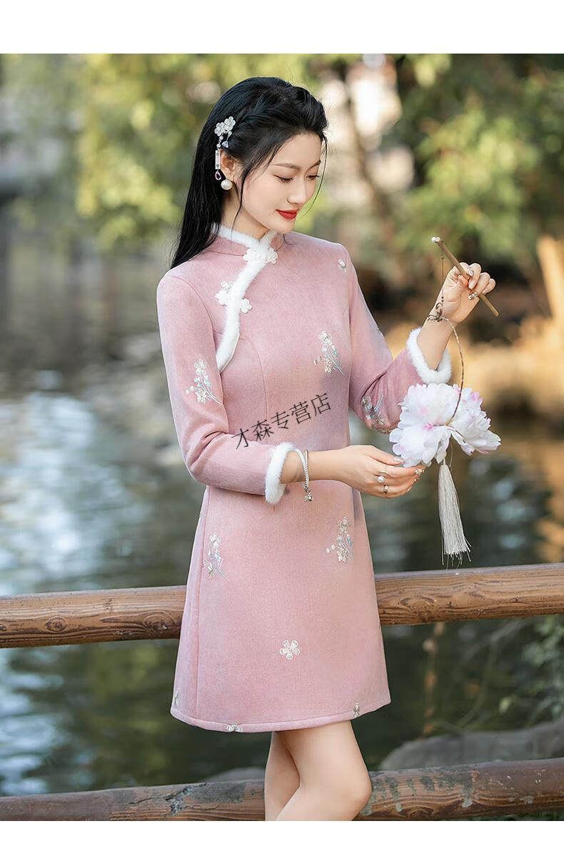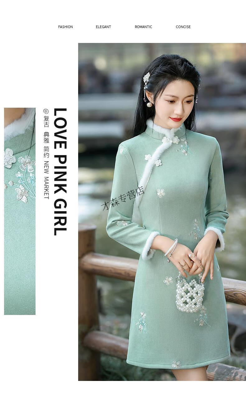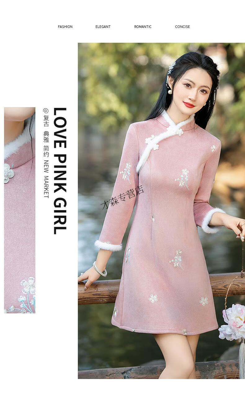 Pierre Cardin velvet thickened embroidery 150 small a version improved cheongsam 2025 winter new long-sleeved literary youthful style beige embroidery suede plus velvet M 85-95Jin Jin is equal to 0.5 kg