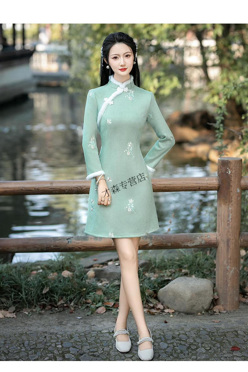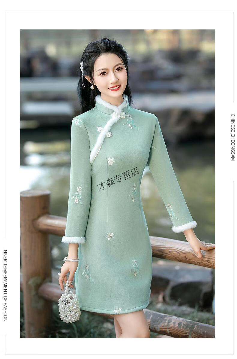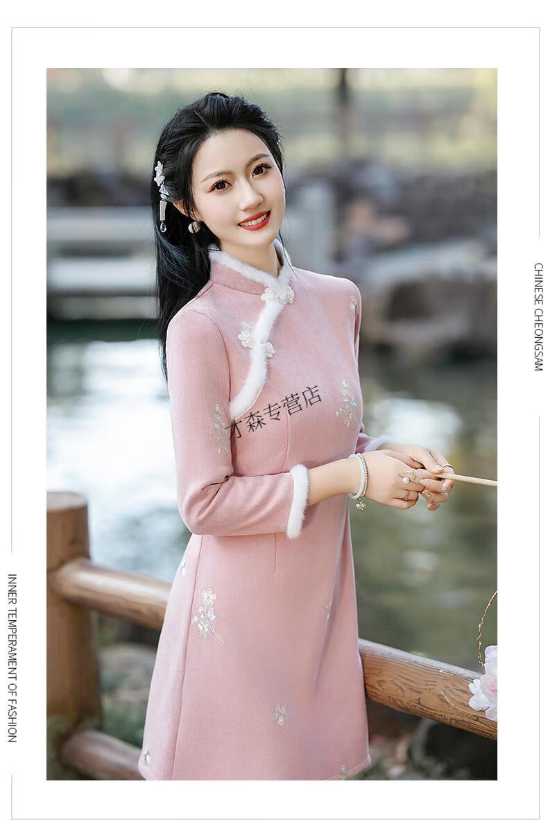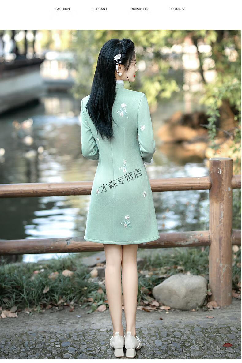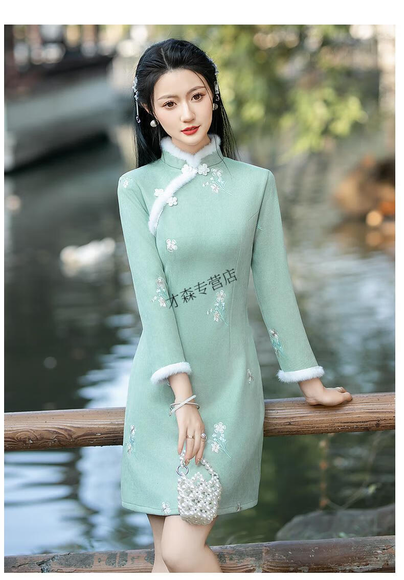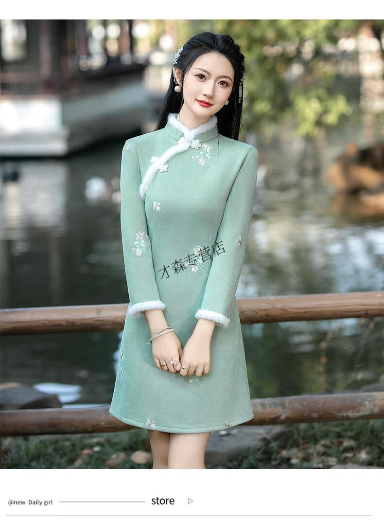 Pierre Cardin velvet thickened embroidery 150 small a version improved cheongsam 2025 winter new long-sleeved literary youthful style beige embroidery suede plus velvet M 85-95Jin Jin is equal to 0.5 kg