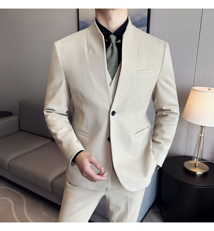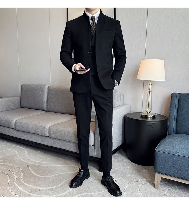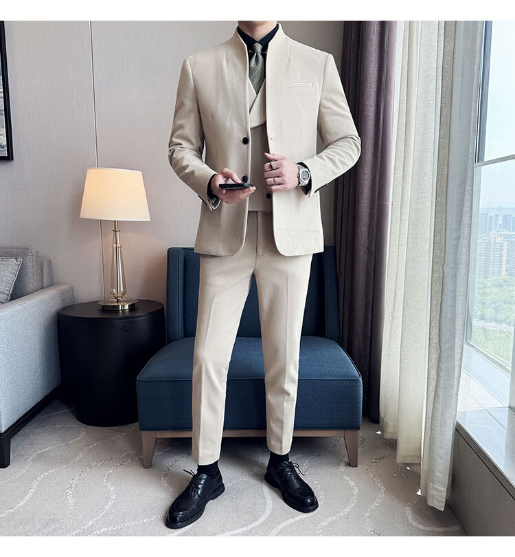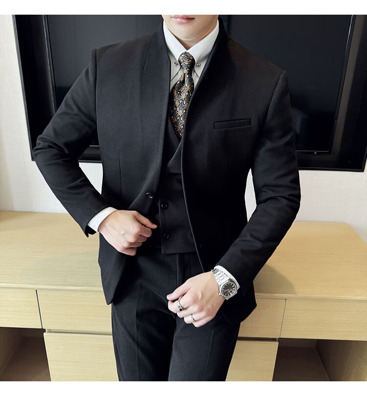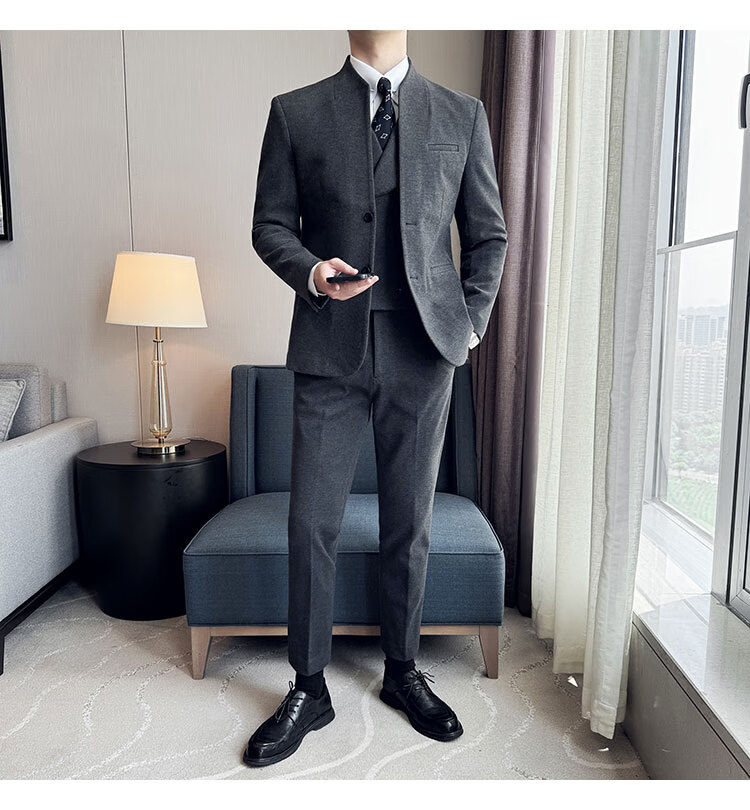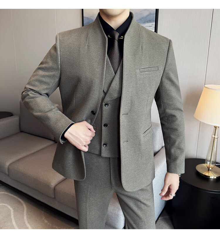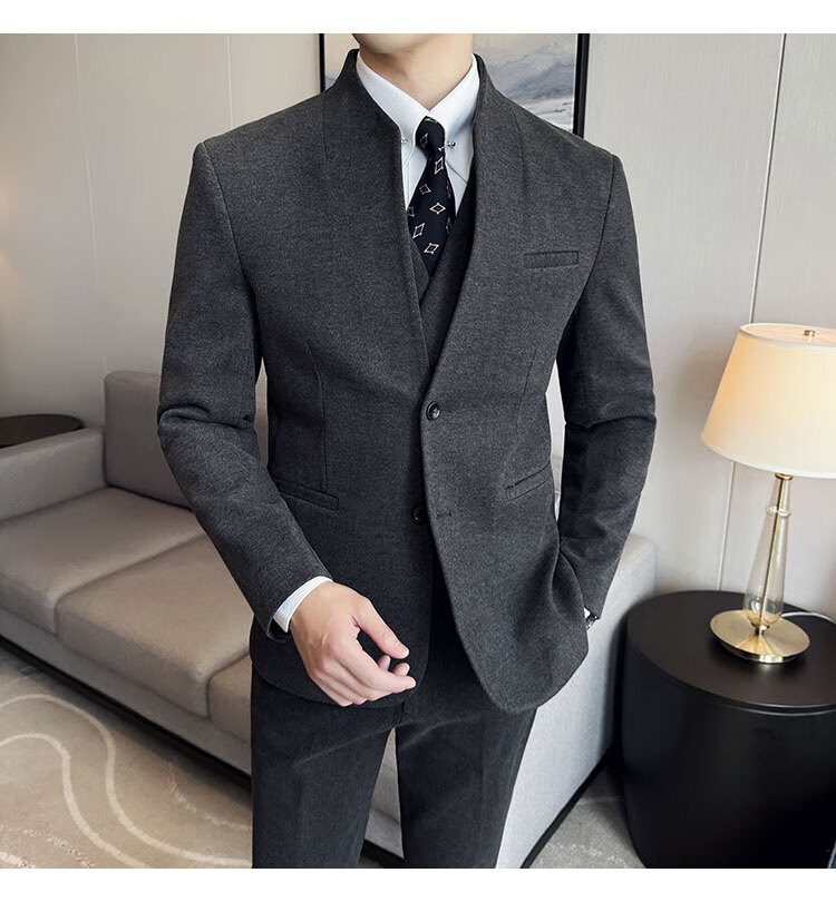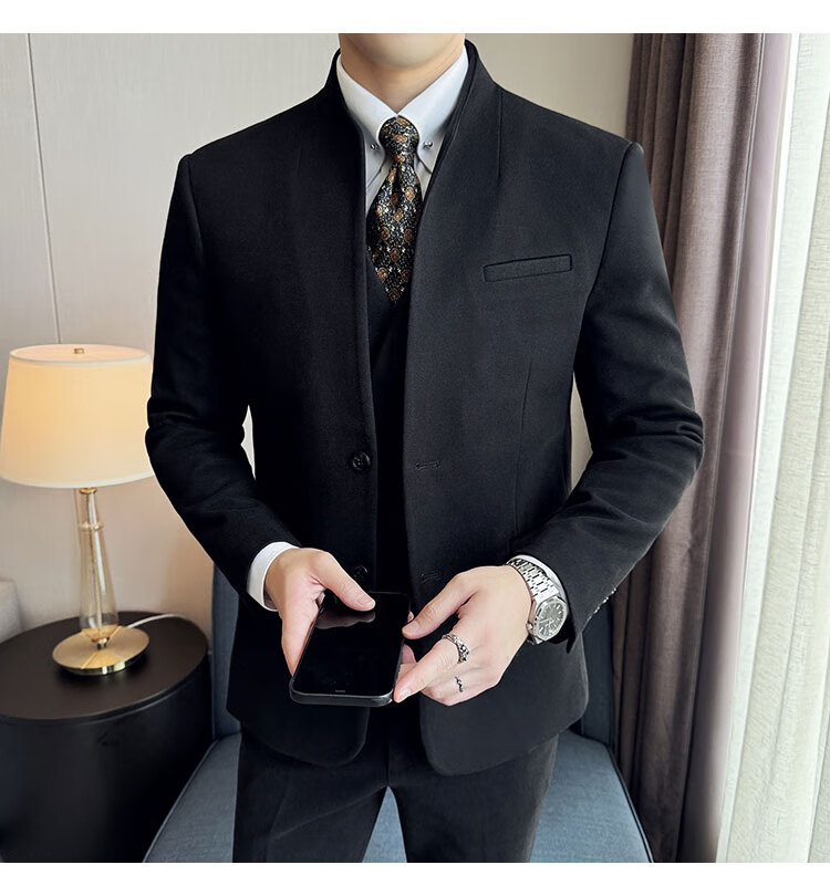 Luo Meng Chinese style stand collar woolen suit suit men's autumn and winter thickened coat trendy handsome casual slim suit three-piece suit brown three-piece suit (suit + vest + trousers) 2XL 135-145Jin Jin equals 0.5 kg