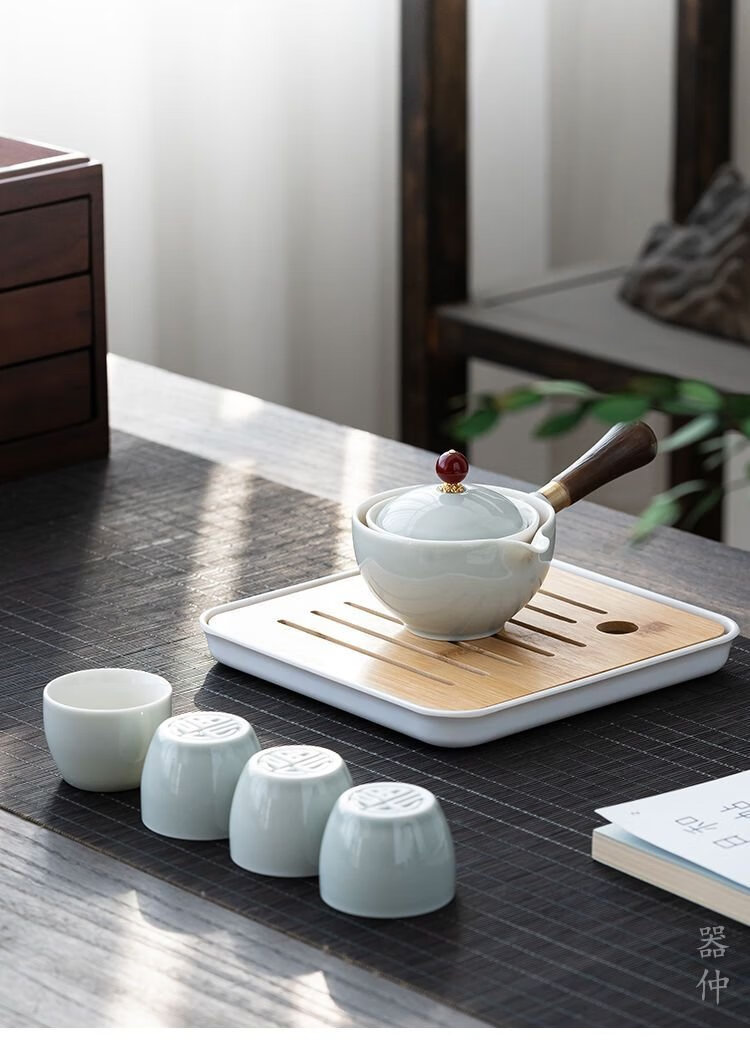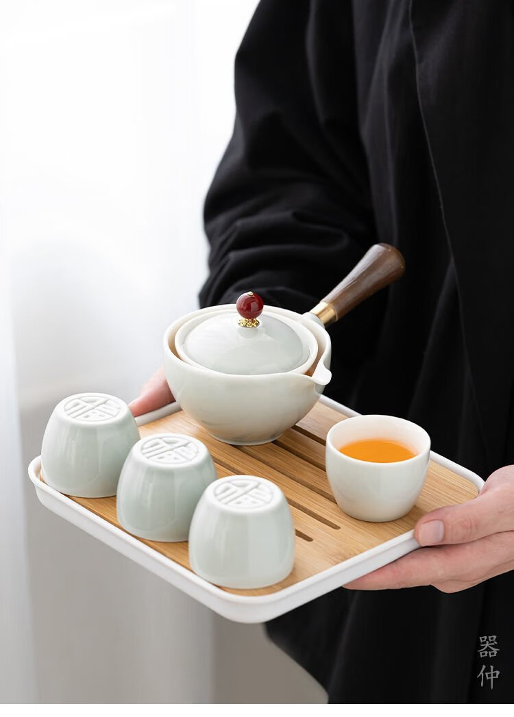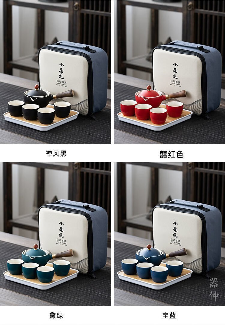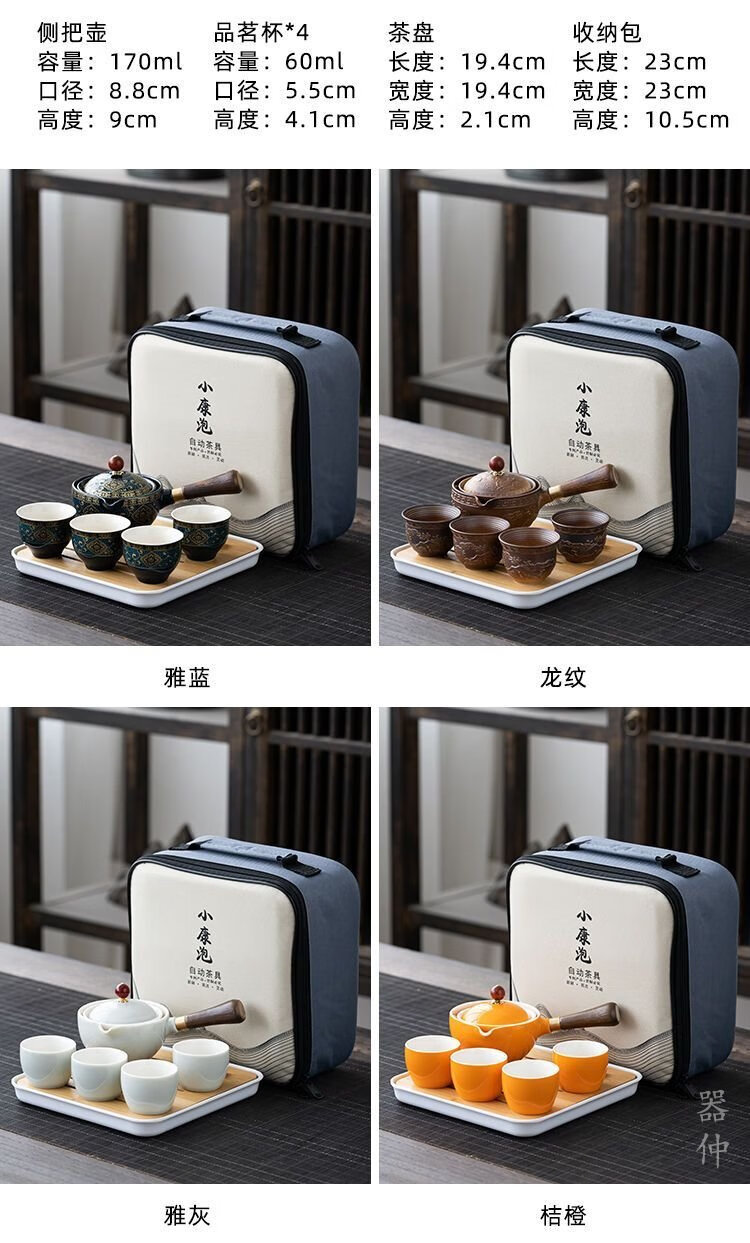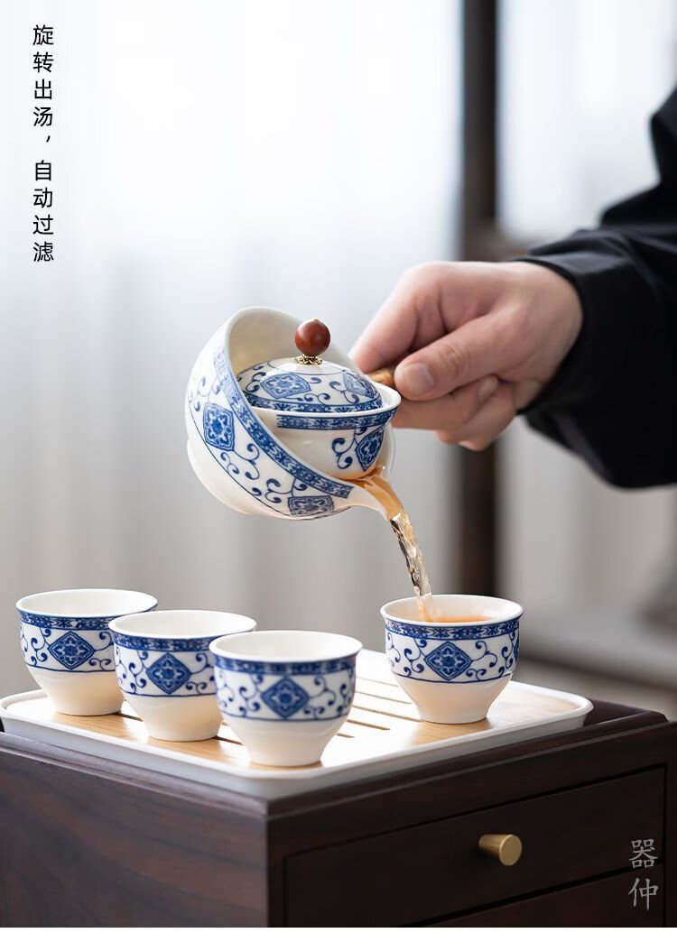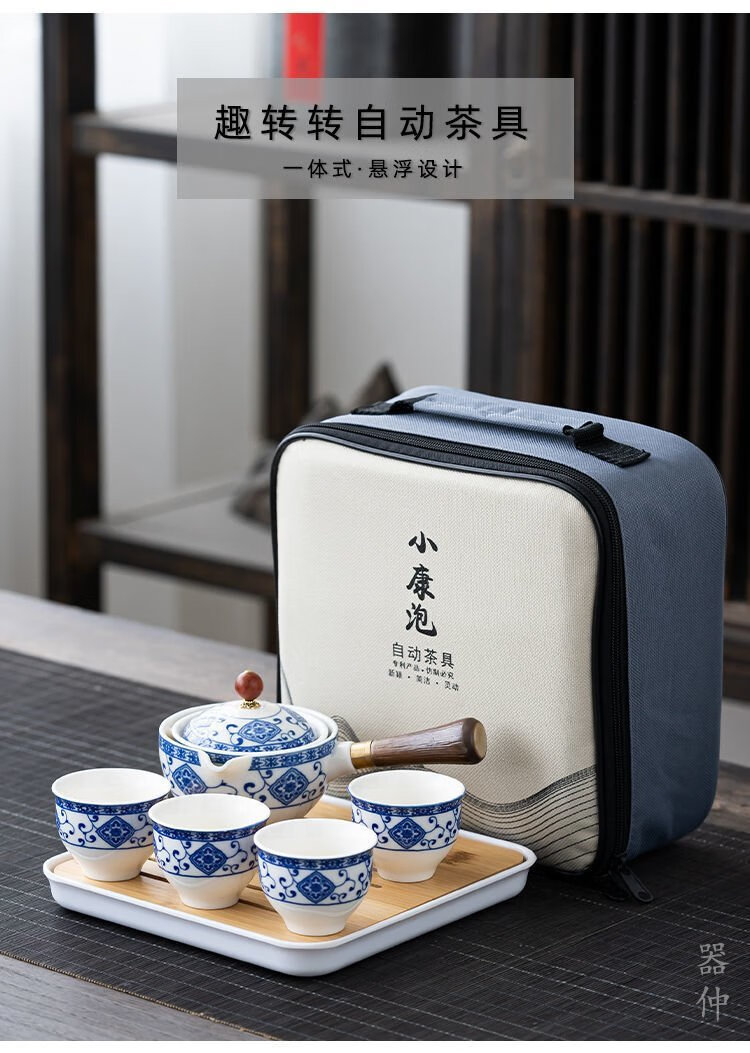 The lazy person's 360-degree fully automatic teapot, new Kung Fu tea set, side handle tea maker, travel portable Xiaoyao teapot, blue and white porcelain, single cup, 4 pieces