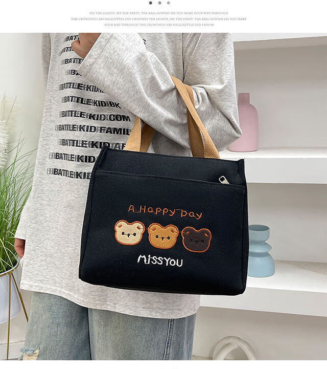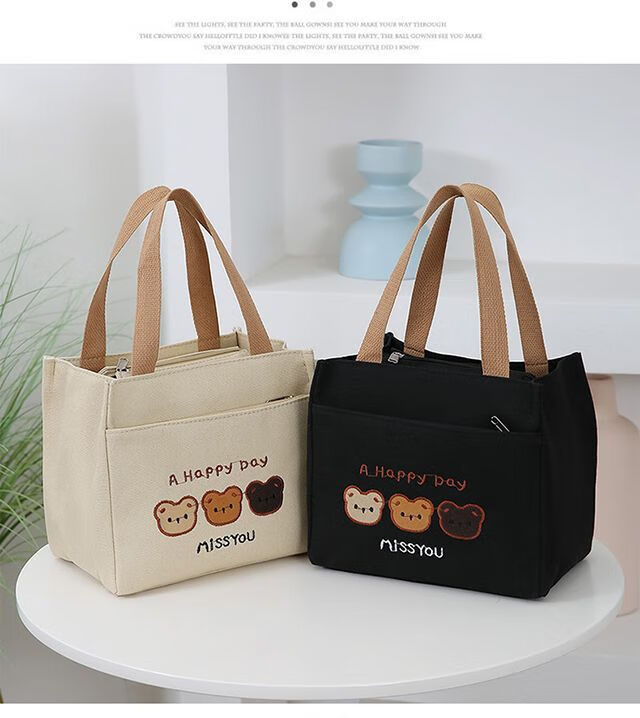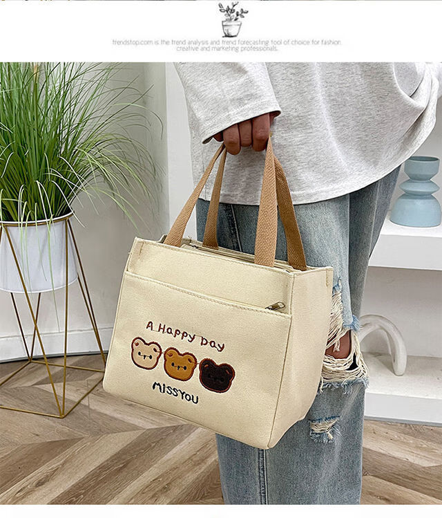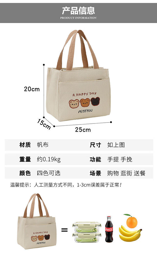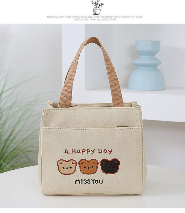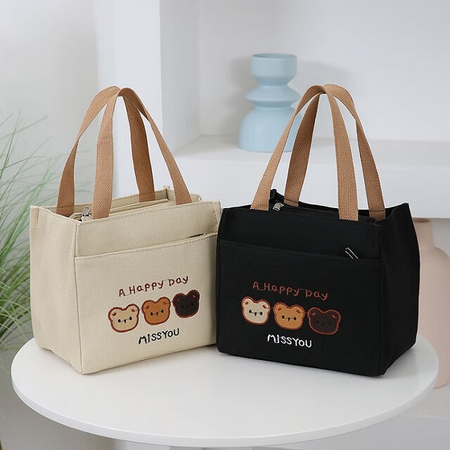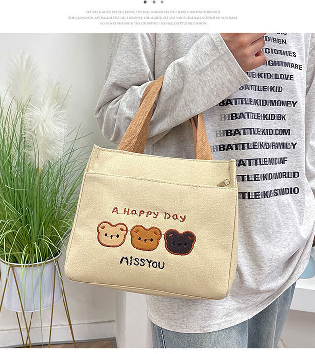 Pengjing Chinese Valentine's Day Canvas Lunch Box Handbag Canvas Bag Work Lunch Box Large Capacity Simple Simple Office Worker Student Versatile Mummy Three Bears Bag Khaki