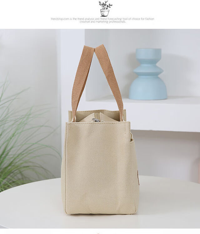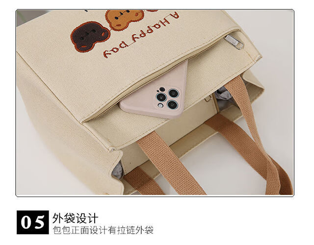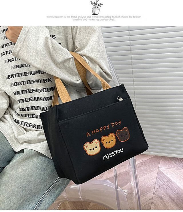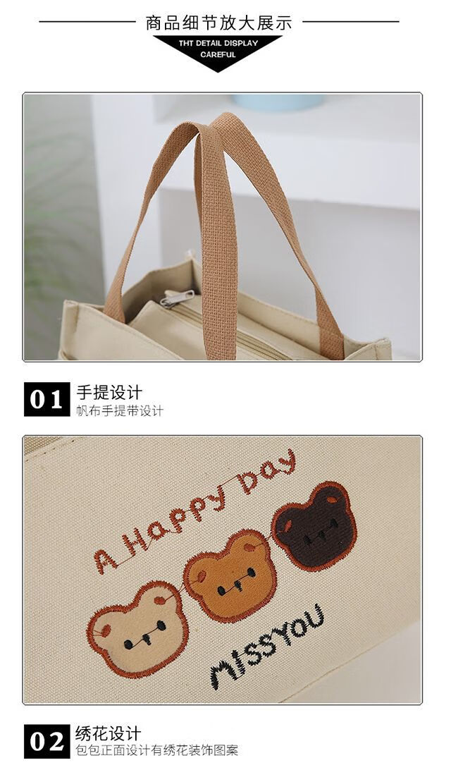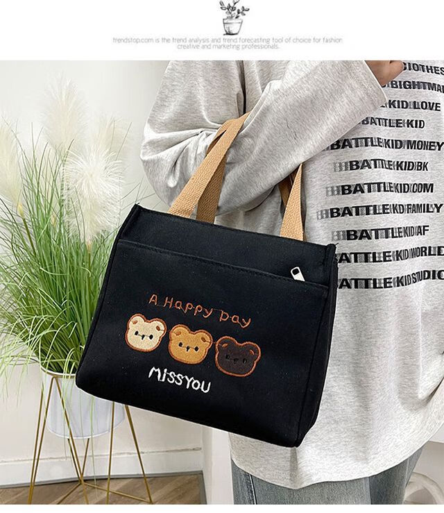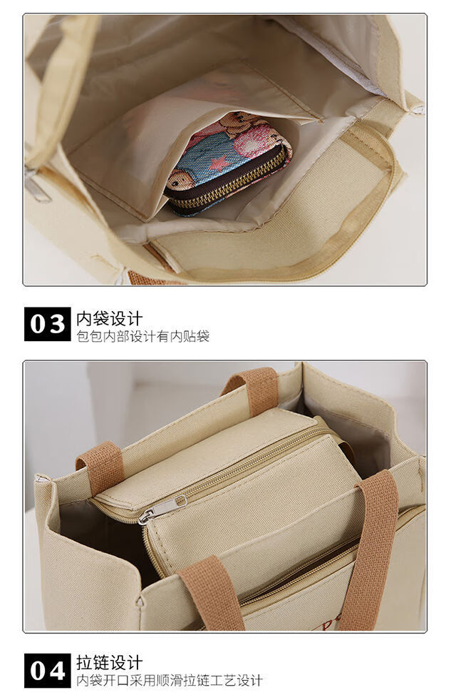 Pengjing Chinese Valentine's Day Canvas Lunch Box Handbag Canvas Bag Work Lunch Box Large Capacity Simple Simple Office Worker Student Versatile Mummy Three Bears Bag Khaki