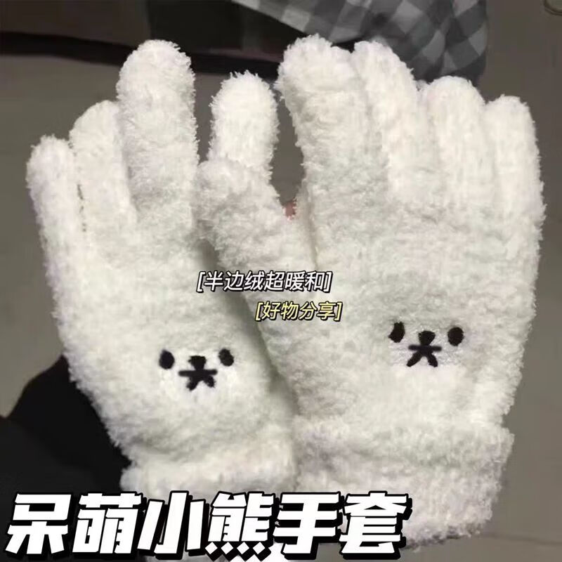 Haiyiduo cute plush bear gloves to protect against cold and warm student couple female 2024 new gloves for winter riding electric bicycles white bear gloves 1 pair