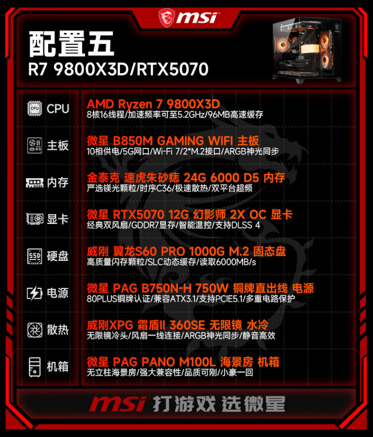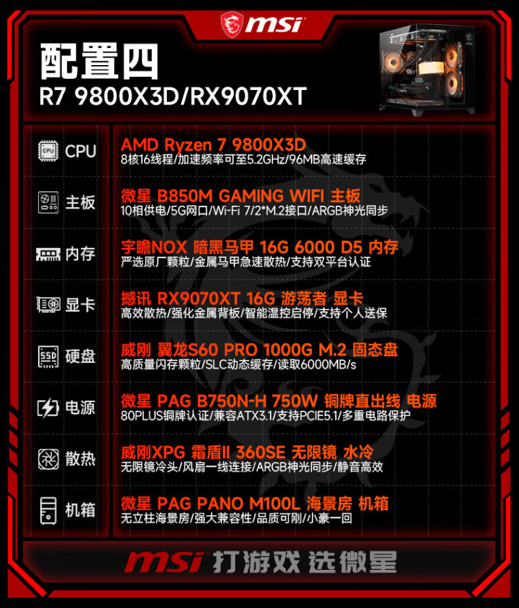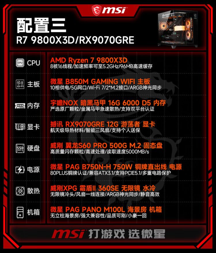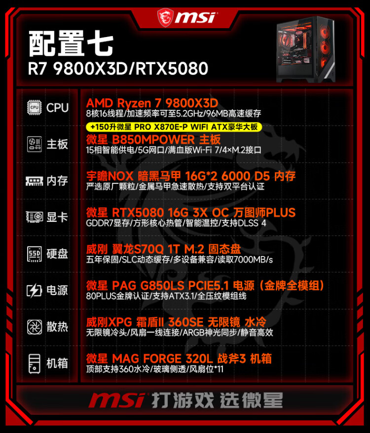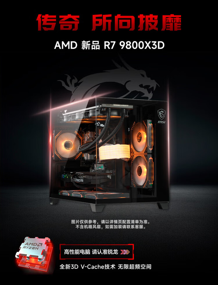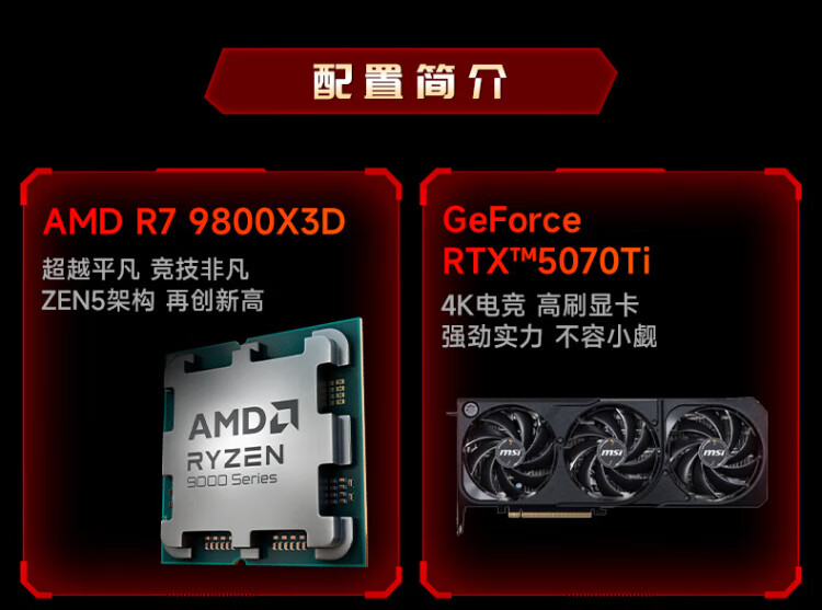 MSI AMD Ryzen 9800X3D/9070XT/5070Ti/5080 desktop assembly computer thousand frames e-sports game design modeling rendering host DIY complete machine configuration two 9800X3D丨24G丨1T丨core display