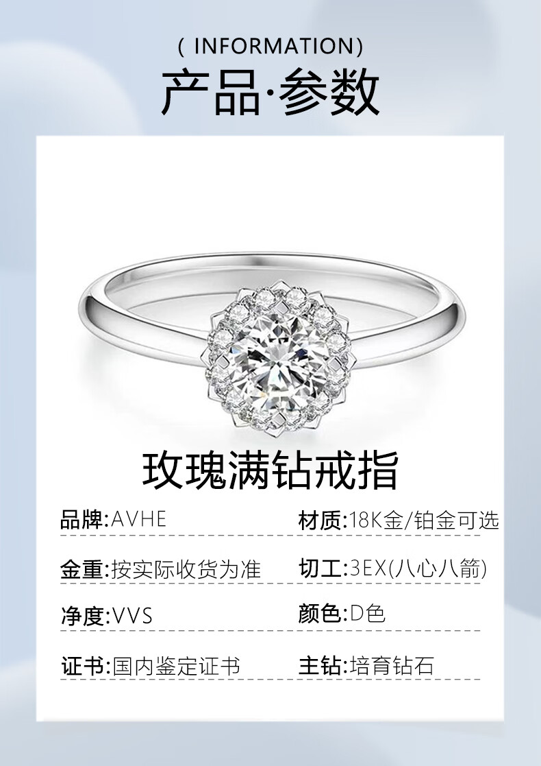 AVHE white platinum and platinum diamond ring for women, bouquet full of diamonds, artificial laboratory-grown diamonds, asking for a wedding gift for Chinese Valentine's Day, platinum rose full of diamonds - main stone 1 carat, ring size 9-20 optional