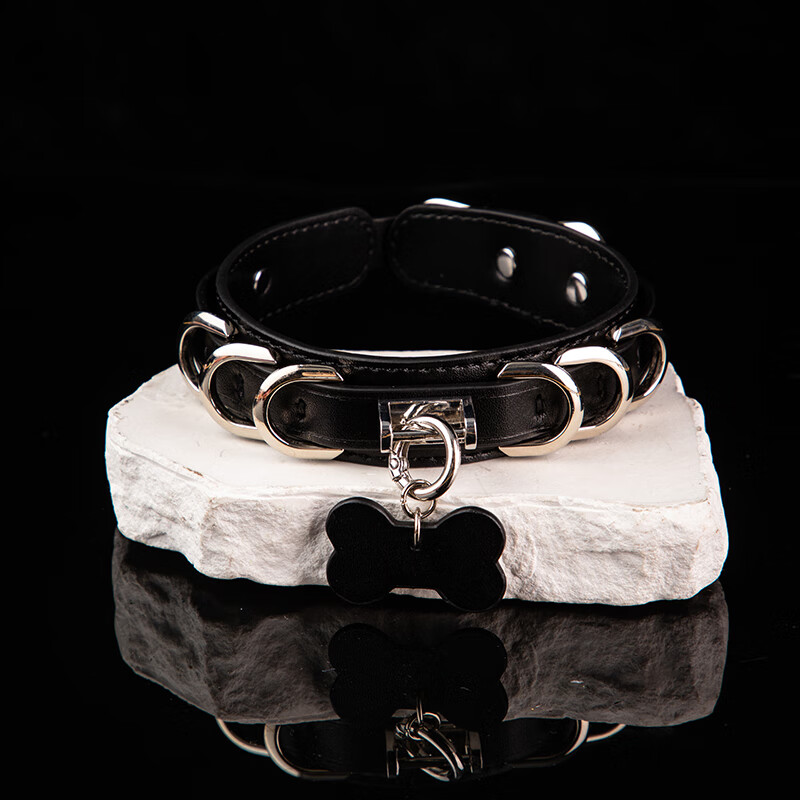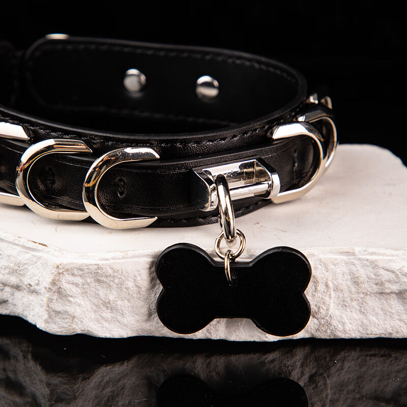 Genuine leather collar sm puppy bone tag bell choker female m custom lettering necklace k9 neck collar black bell model + traction chain