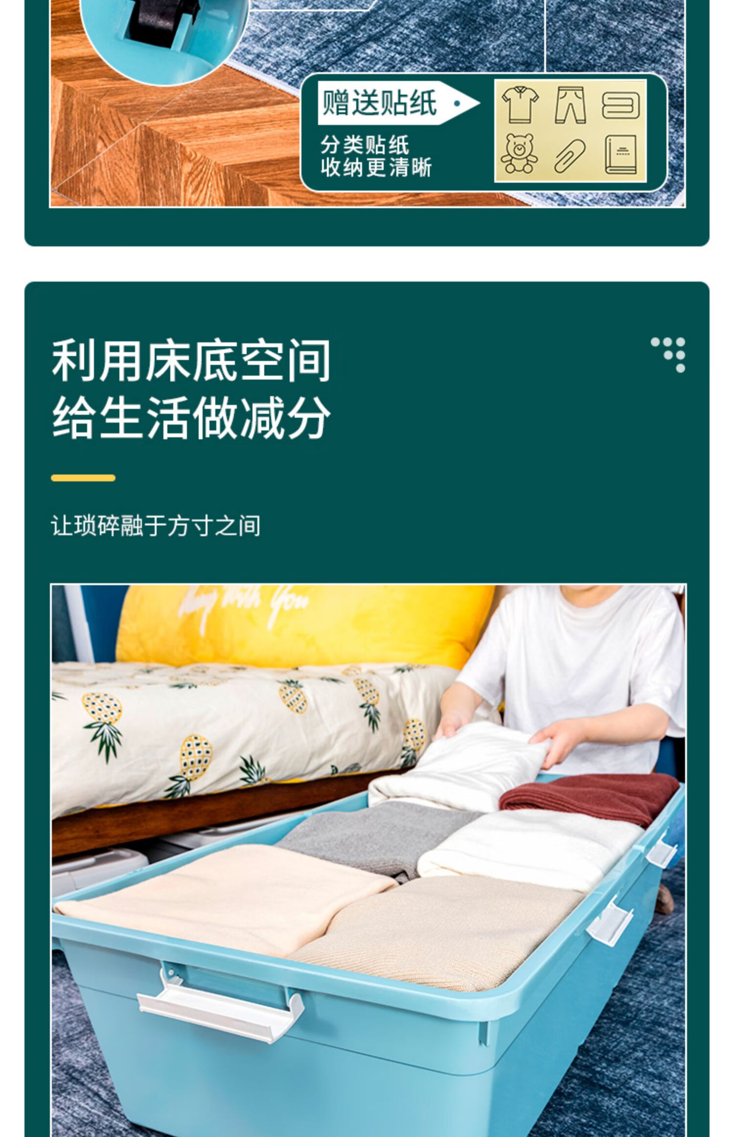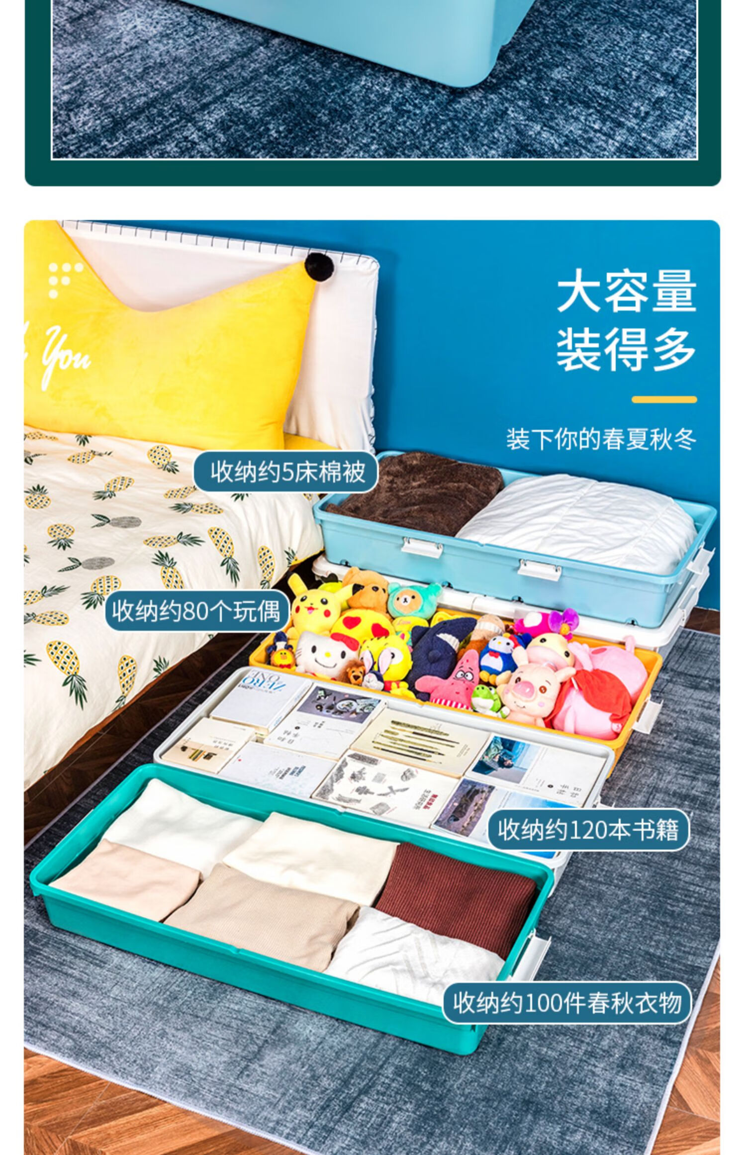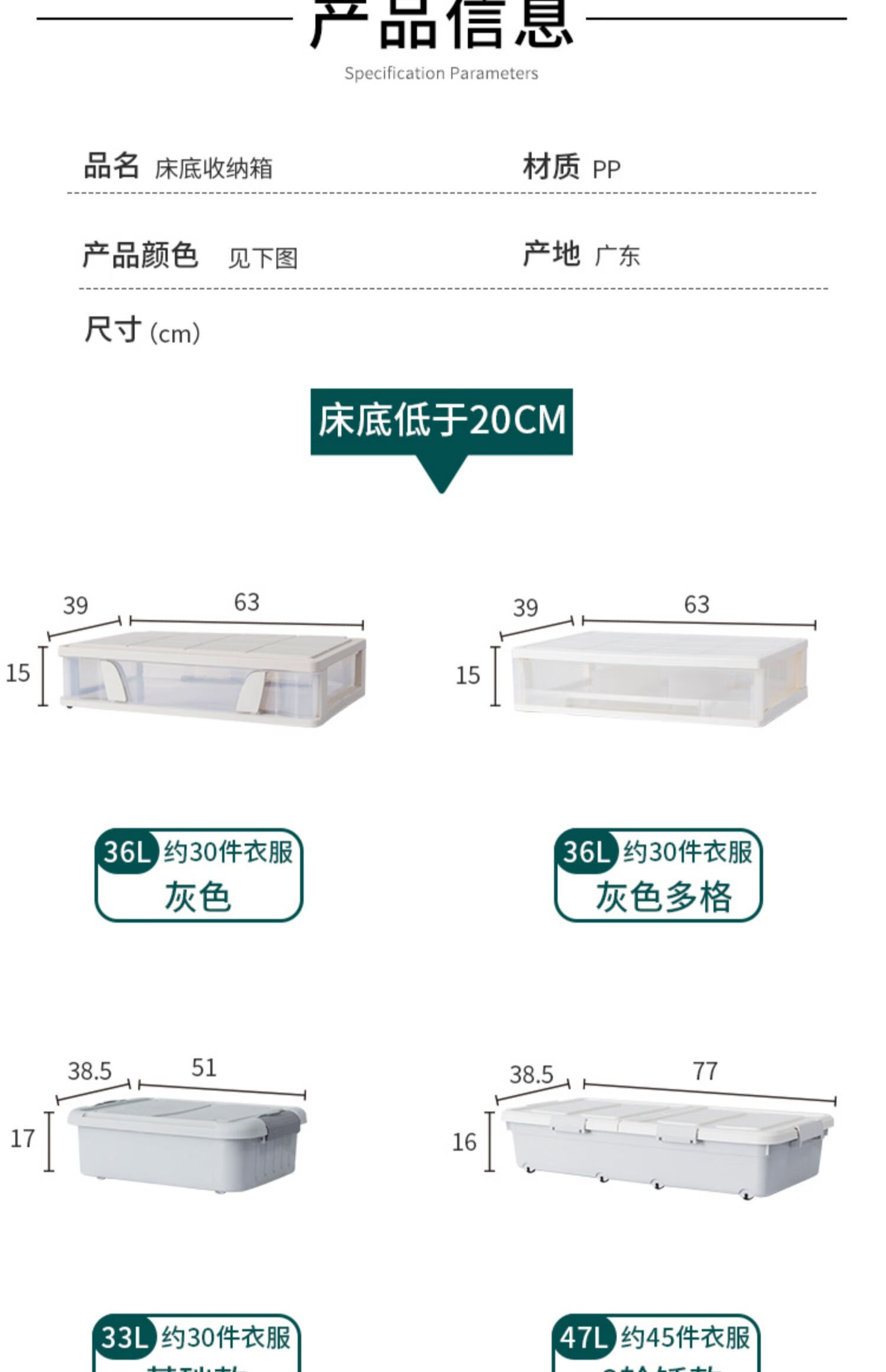 JOKOOAN bed storage box pulley quilt clothing storage box organization artifact flat plastic sealed under bed drawer large size 18.5cm high extended light gray wheel