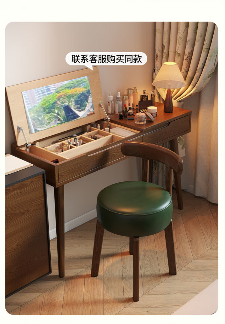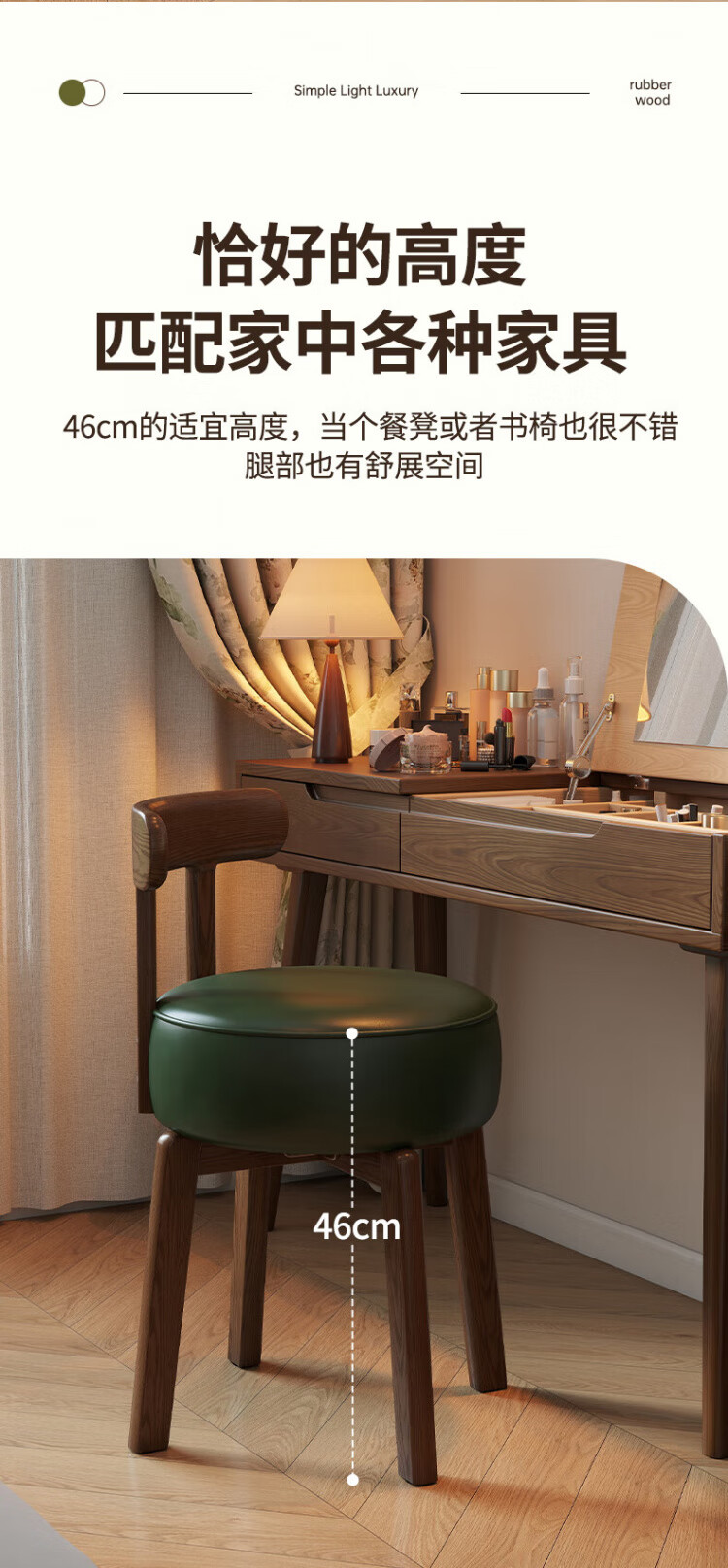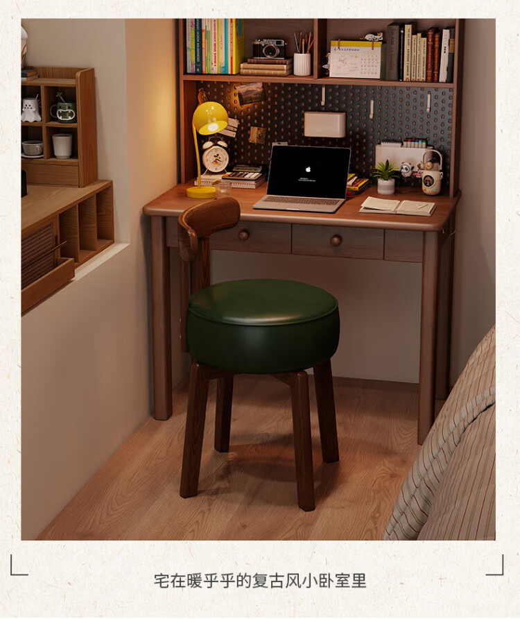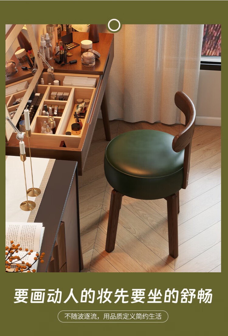 Menile mid-century style dressing chair solid wood rotatable makeup chair girls bedroom dressing table back chair retro stool light luxury solid wood walnut color frame + brown rotatable