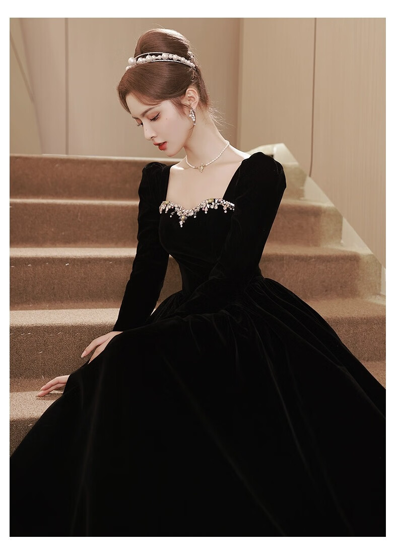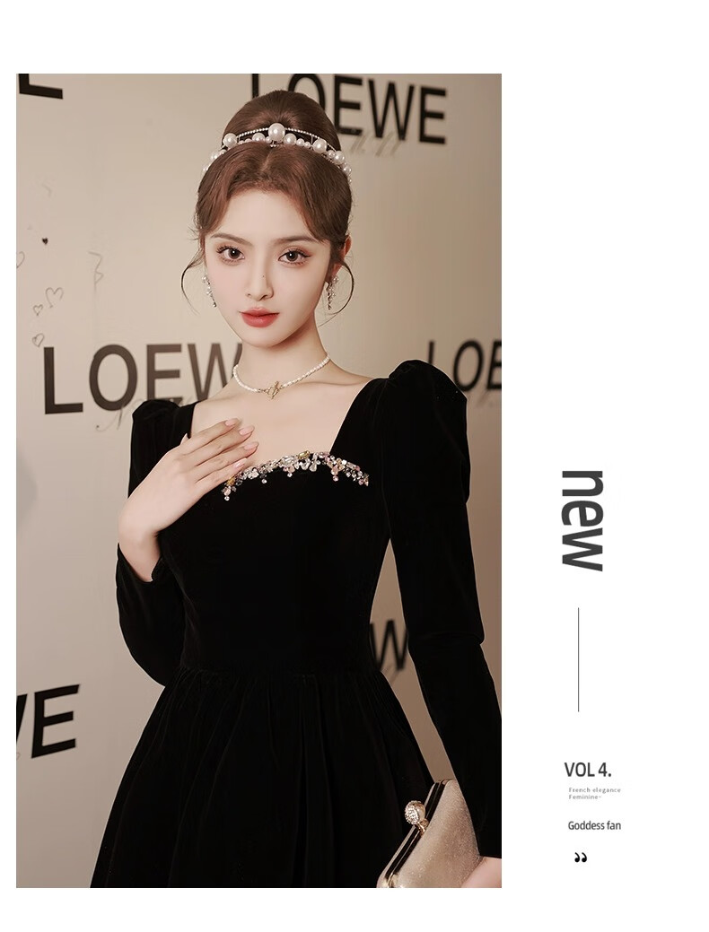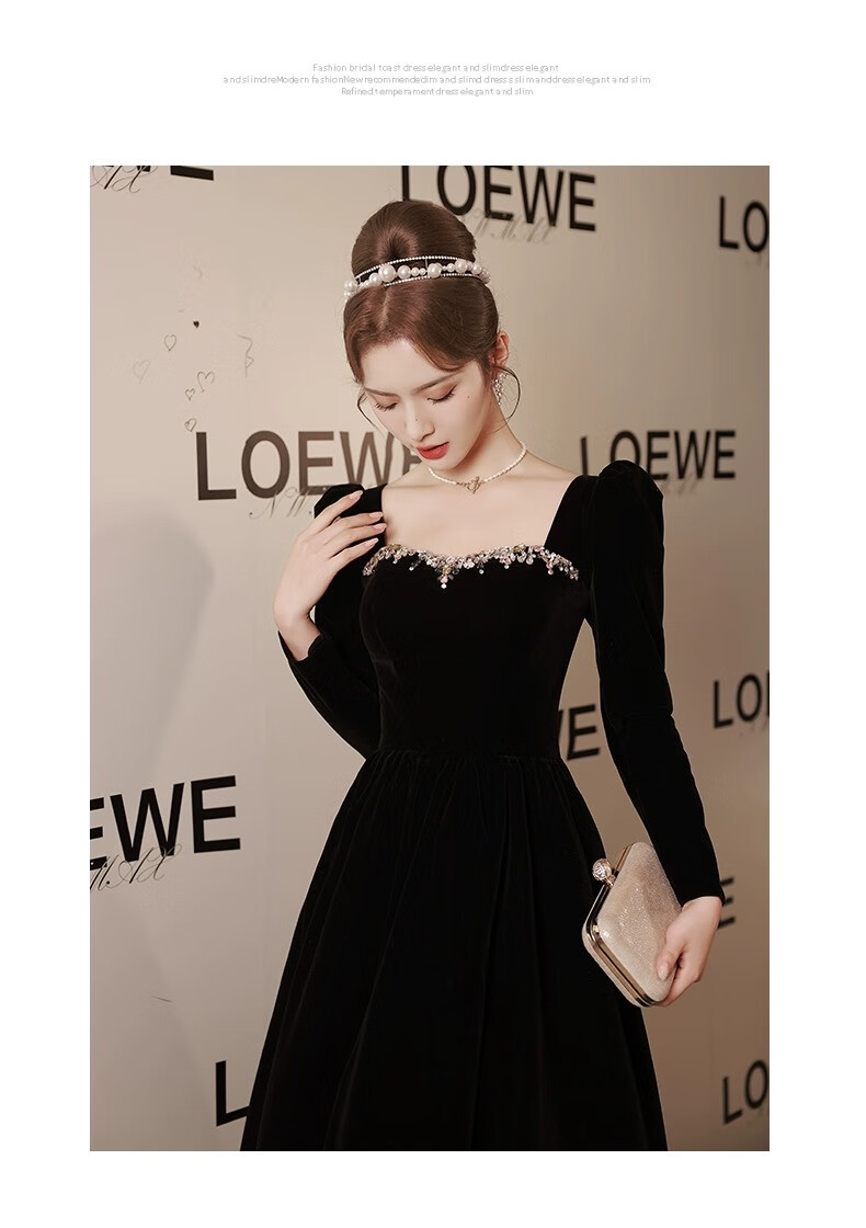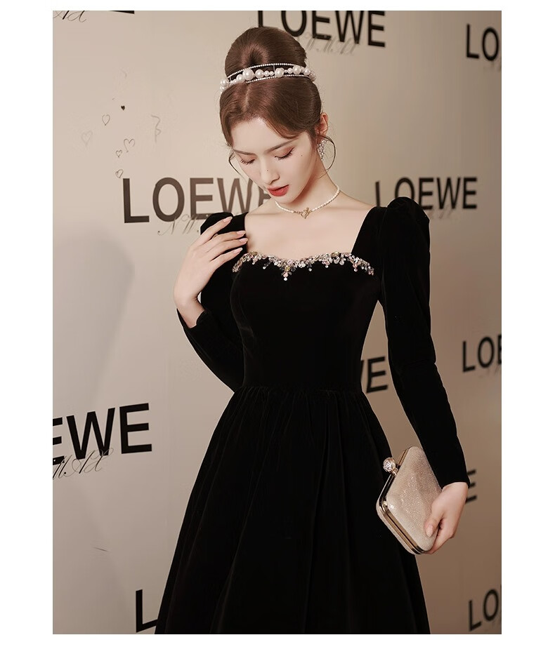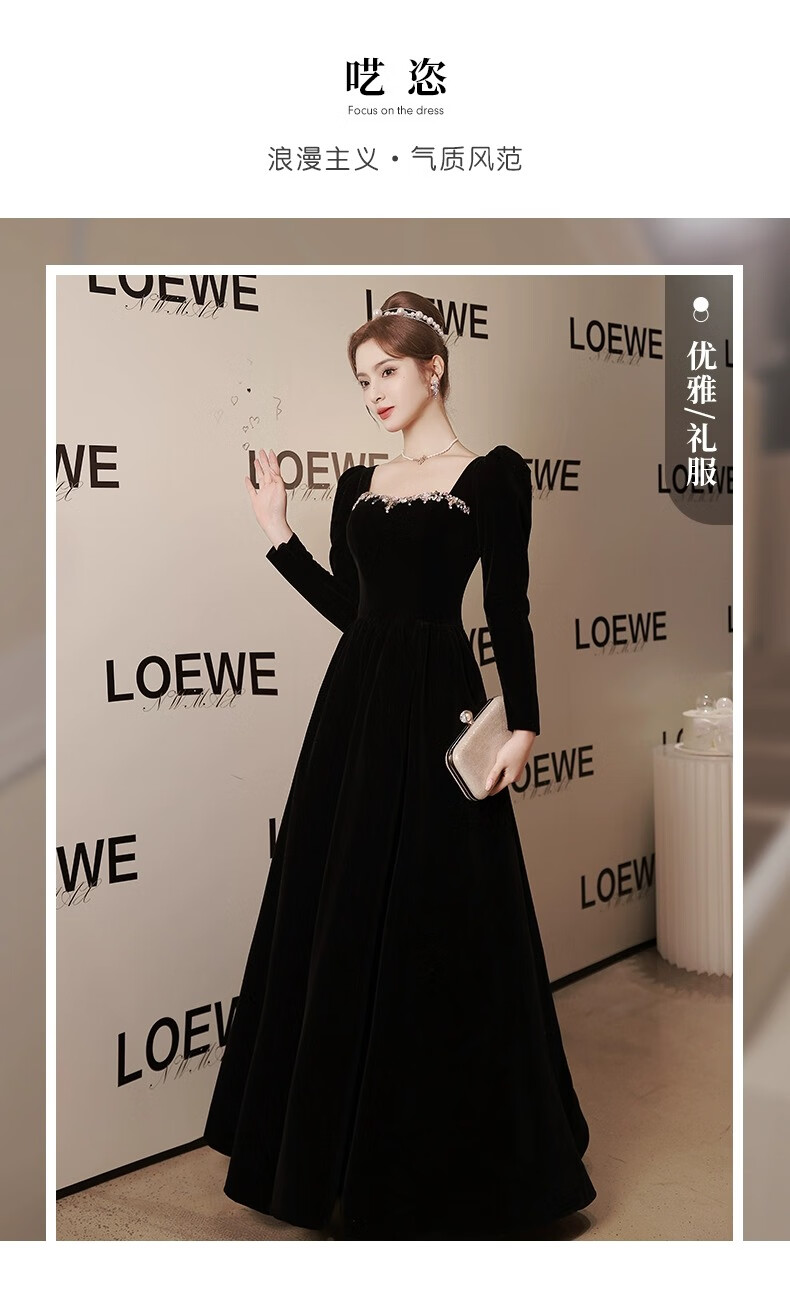 Libaixin black evening dress for women 2025 new style light luxury high-end temperament annual meeting adult ceremony velvet autumn and winter long-sleeved dress black S