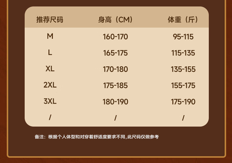 China (cm) 165 / 88-90 170 / 96-98 175 / 108-110 180 / 118-122 185 / 126-130