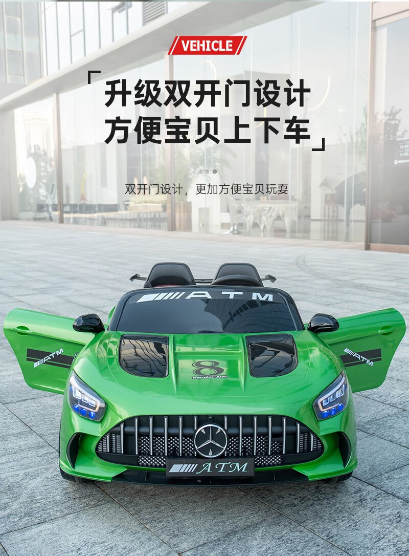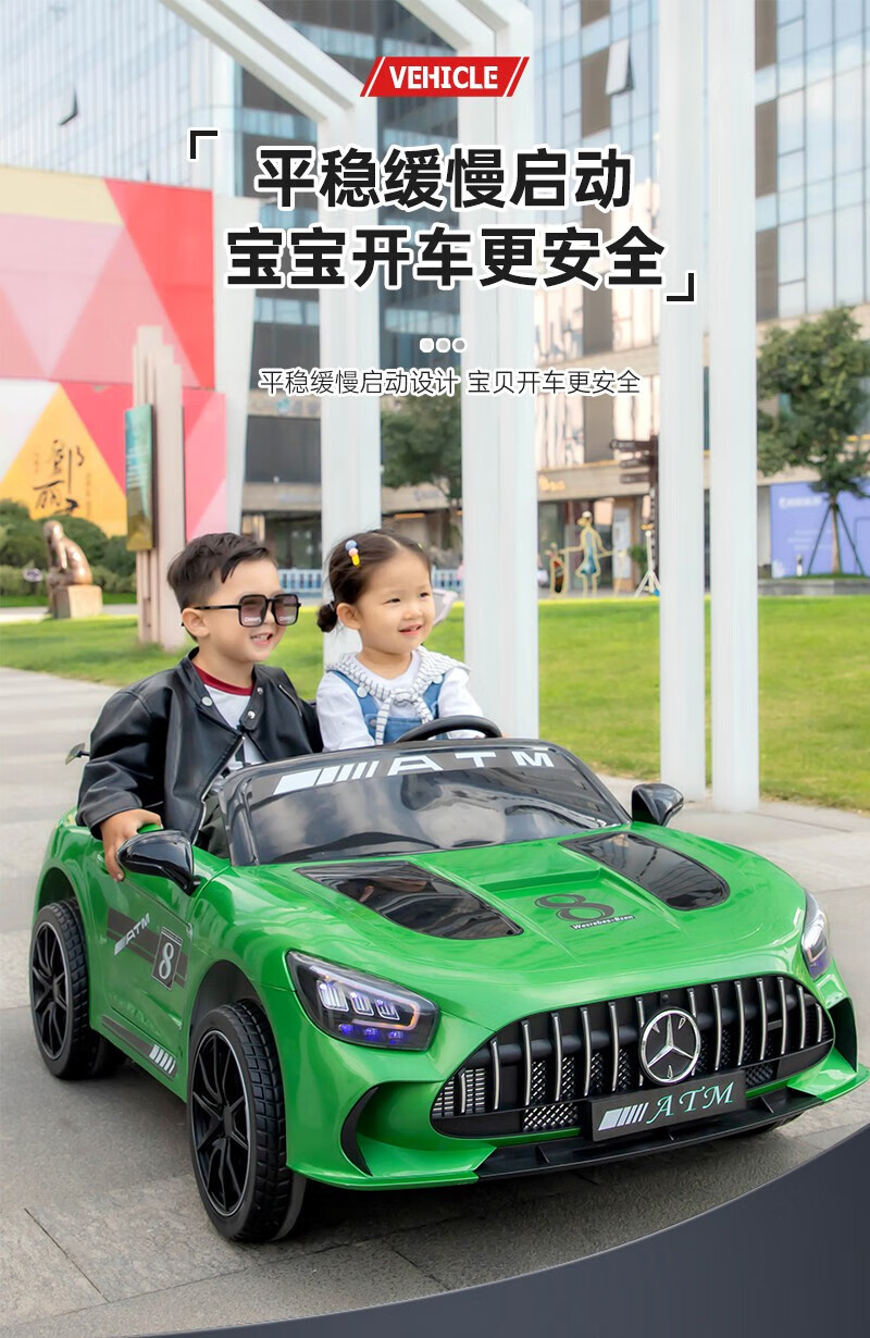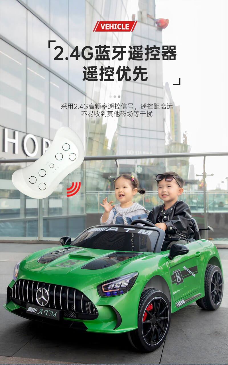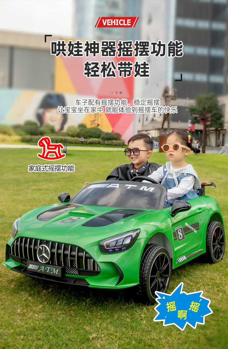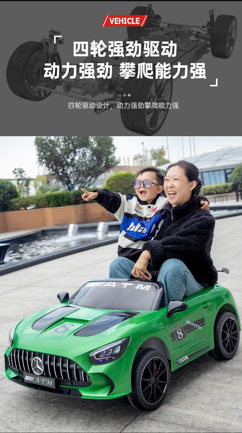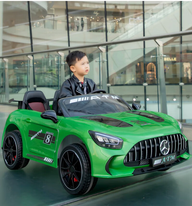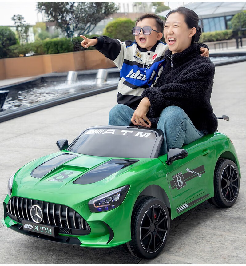 WORK BABY Mercedes-Benz children's electric car four-wheel remote control seating double toy stroller children's New Year's birthday gift, painted green, early music education, mobile phone Bluetooth swing, four-wheel drive 12V11 Chaowei battery, leather seat, foam wheel