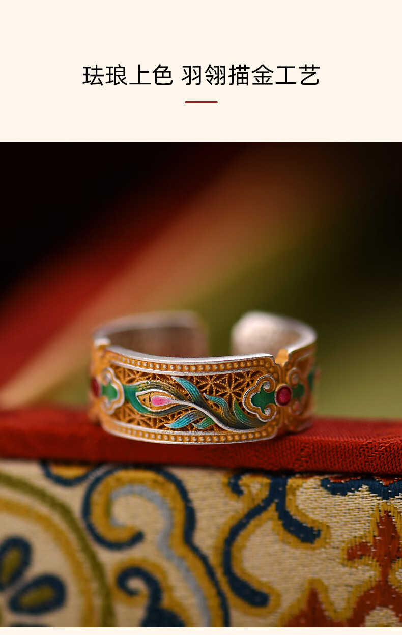 Luotai old silversmith 9999 pure silver enamel ring women's style Chinese style light luxury high-end gold phoenix feather feather ring enamel ring (adjustment range 10-16#)