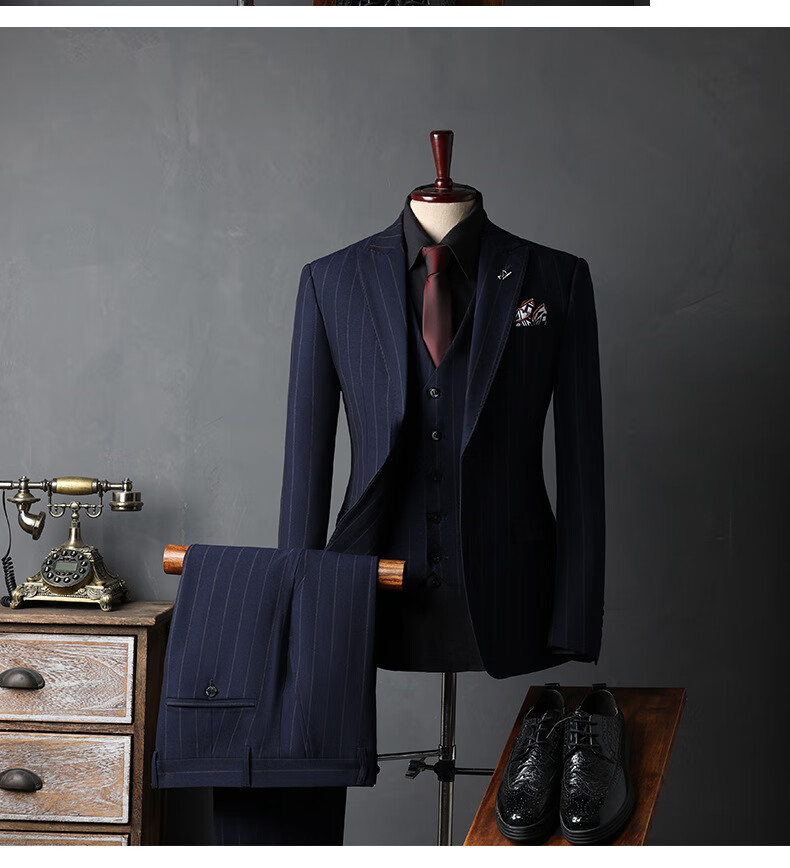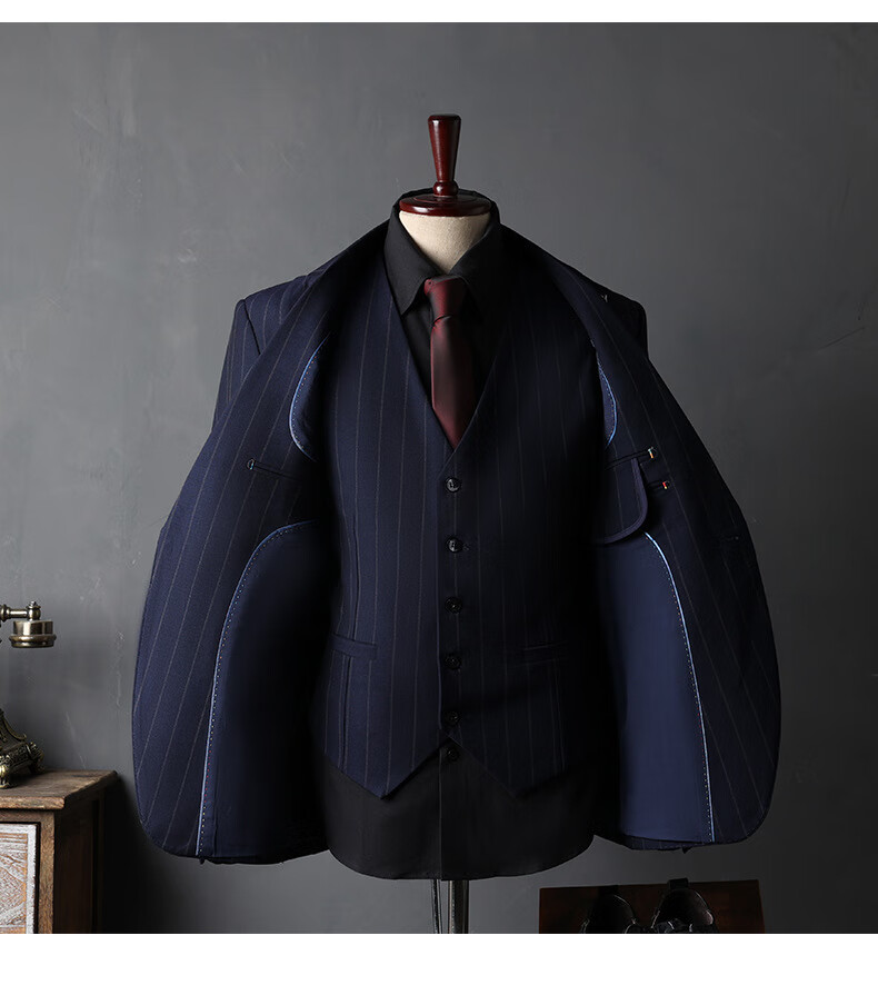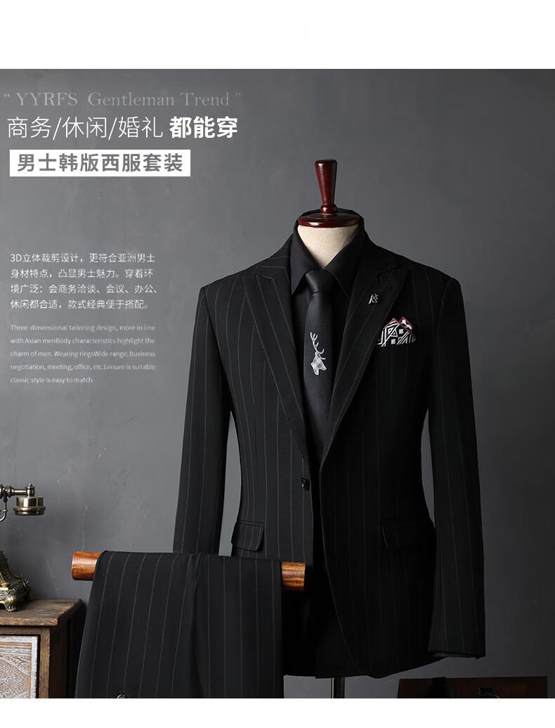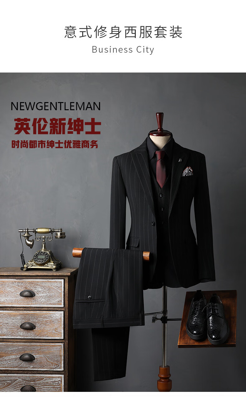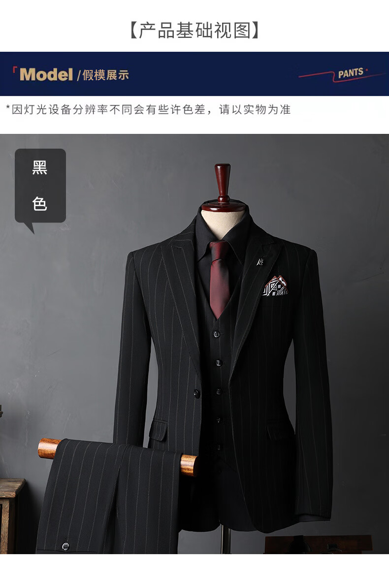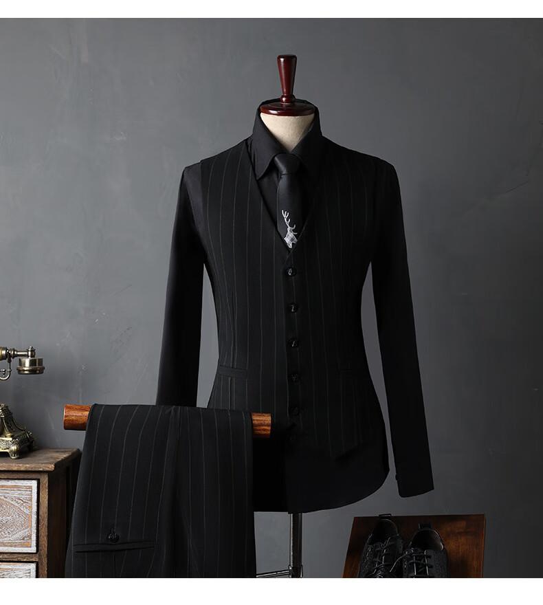 Woodpecker (TUCANO) Striped Suit Men's Full Groom's Suit British Style Groomsmen's Clothes Business Formal Wedding Suit Men's Black (Suit+Vest+Trousers) XL 52 (125-135Jin Jin equals 0.5kg)