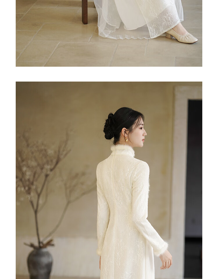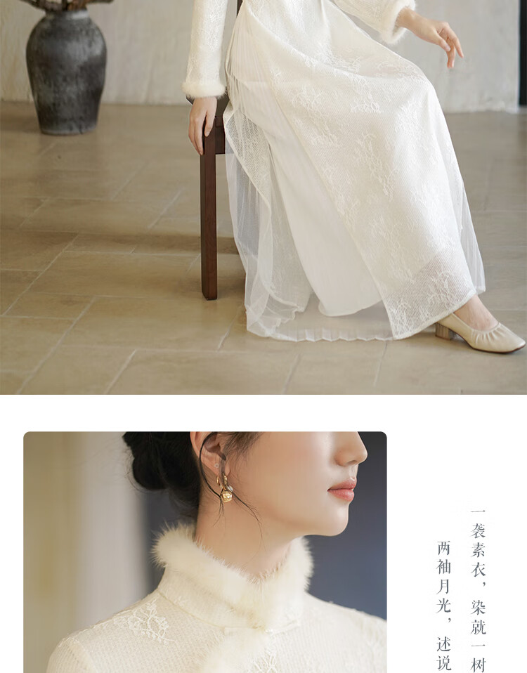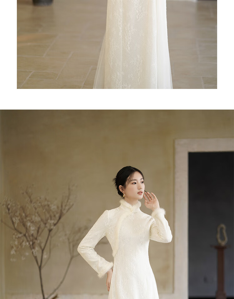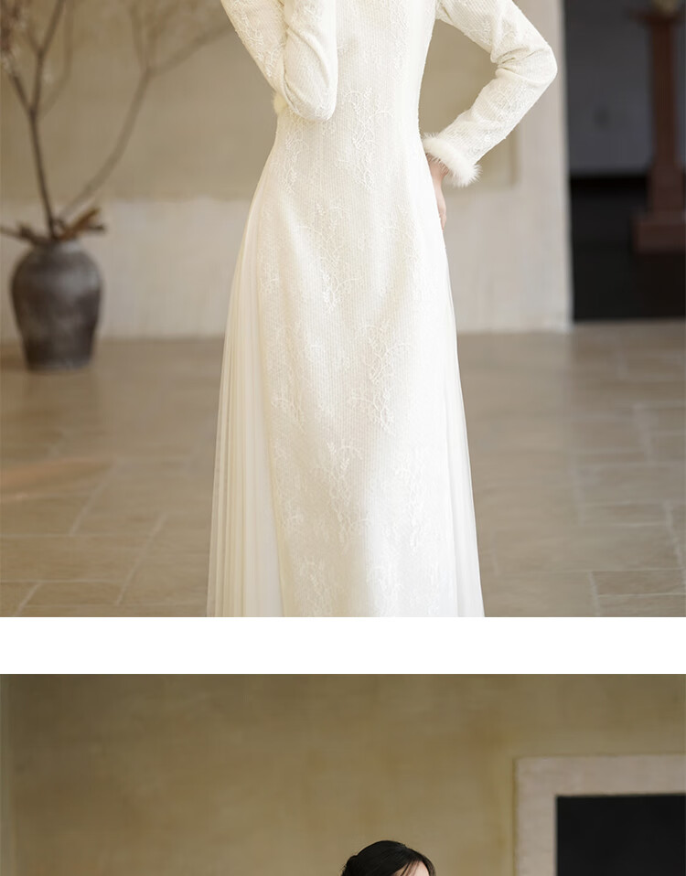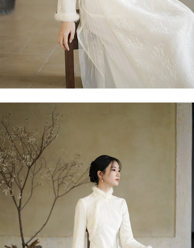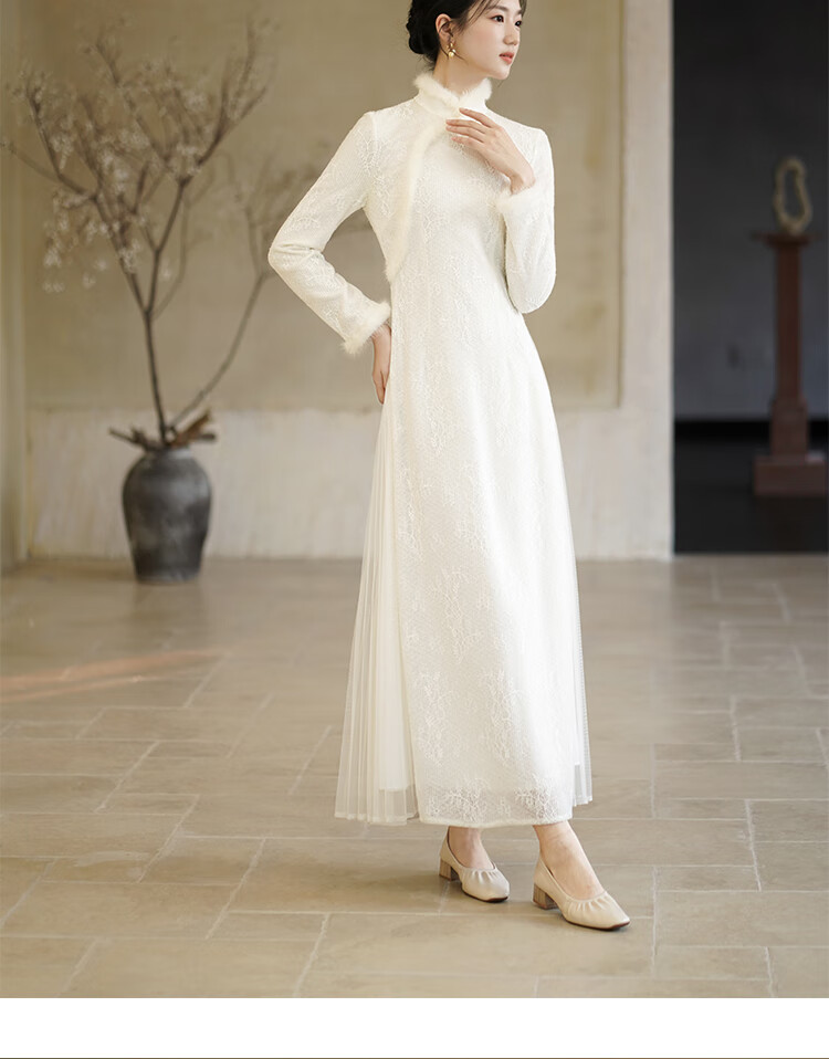 Chuchan Yishi new Chinese style Ao Dai cheongsam for women autumn and winter new white lace mesh knitted temperament national style dress white (length 125) M (ready in stock)