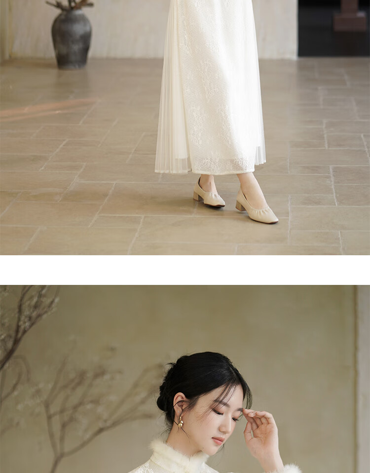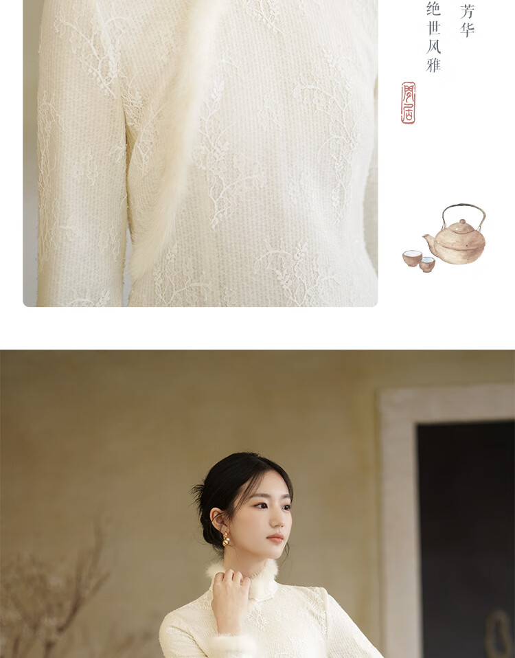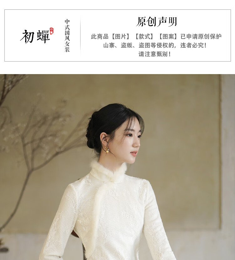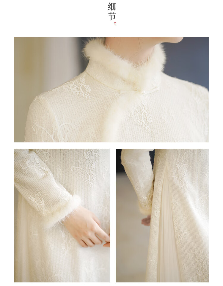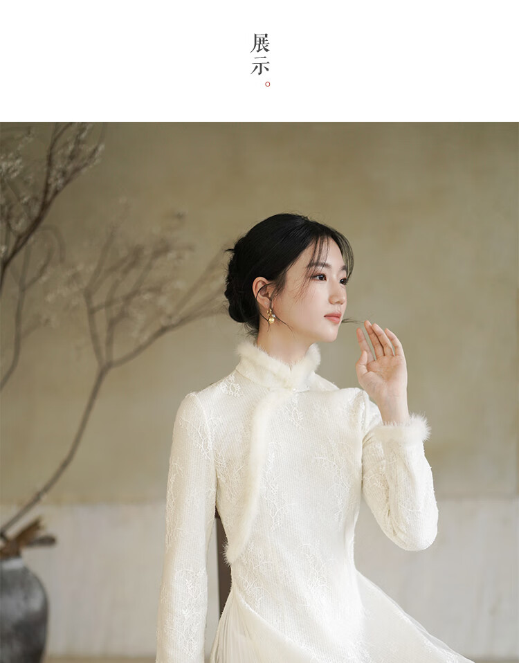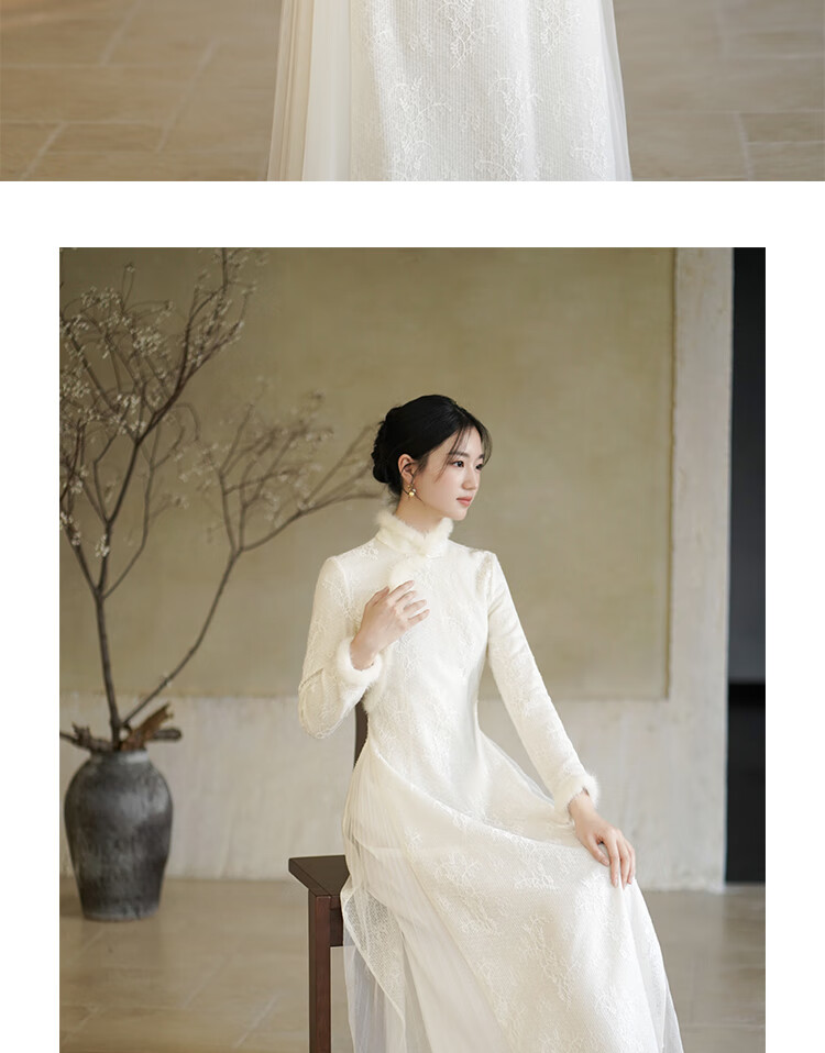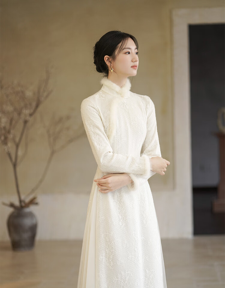 Chuchan Yishi new Chinese style Ao Dai cheongsam for women autumn and winter new white lace mesh knitted temperament national style dress white (length 125) M (ready in stock)