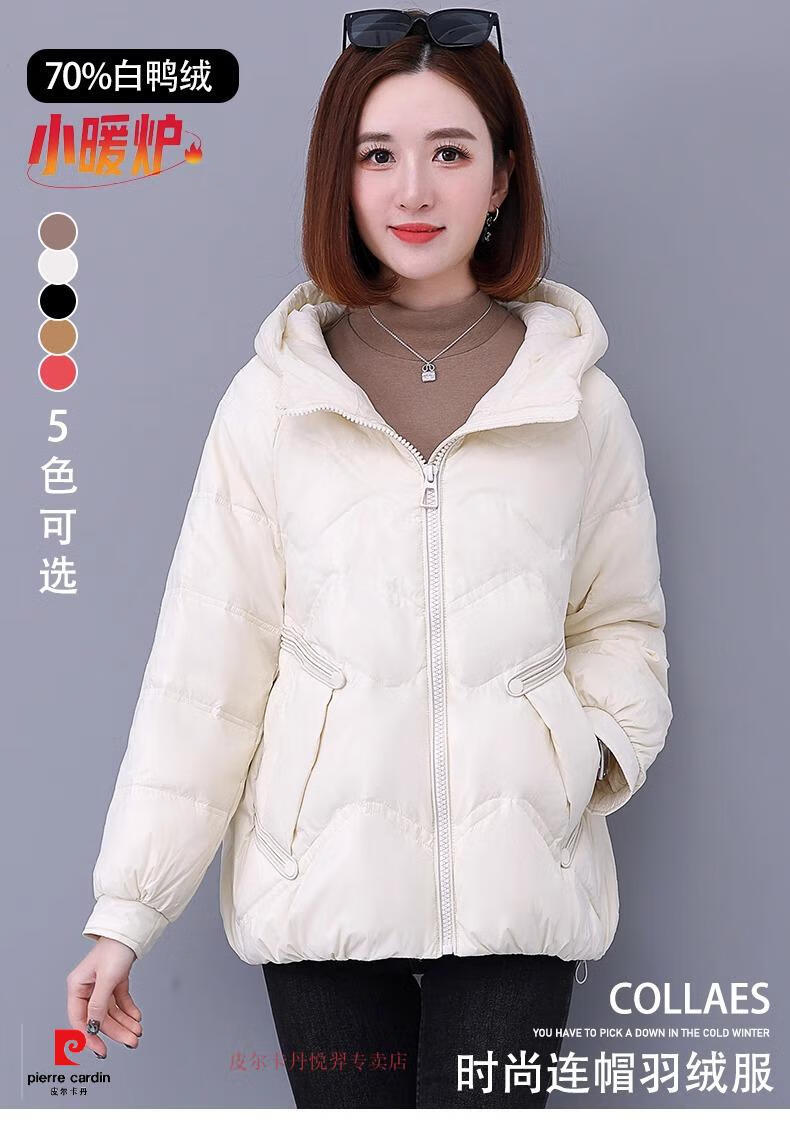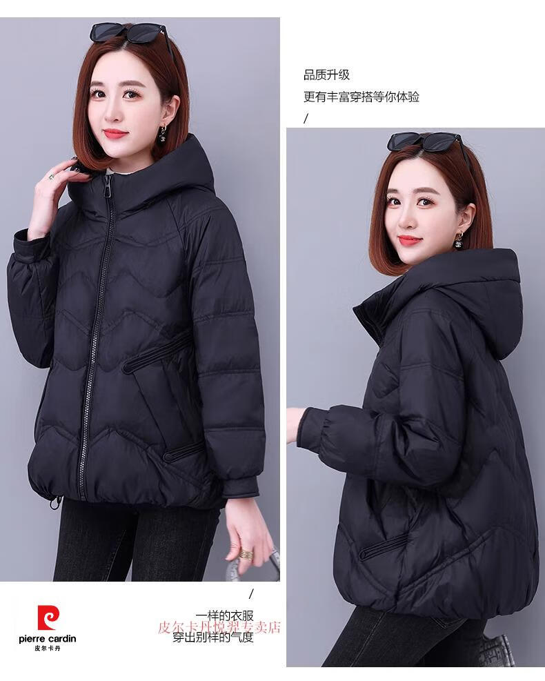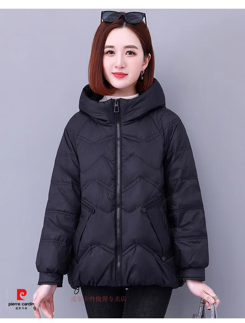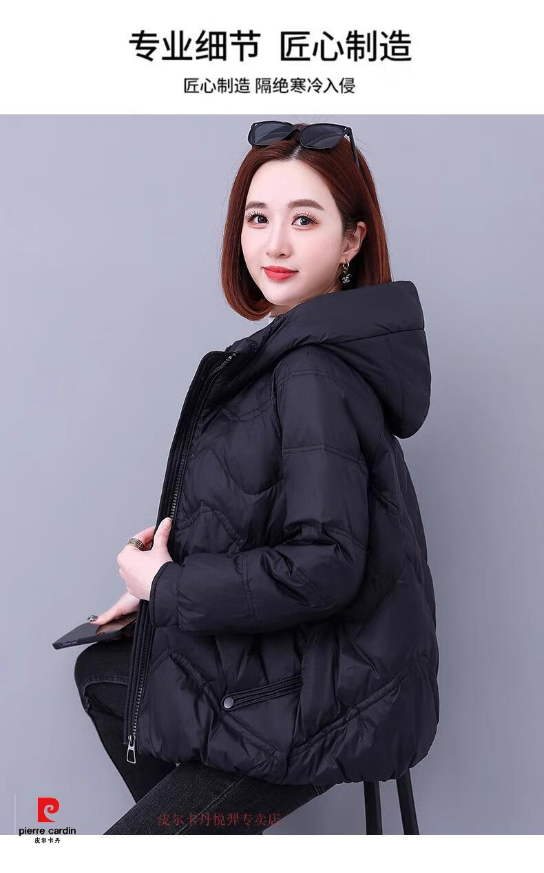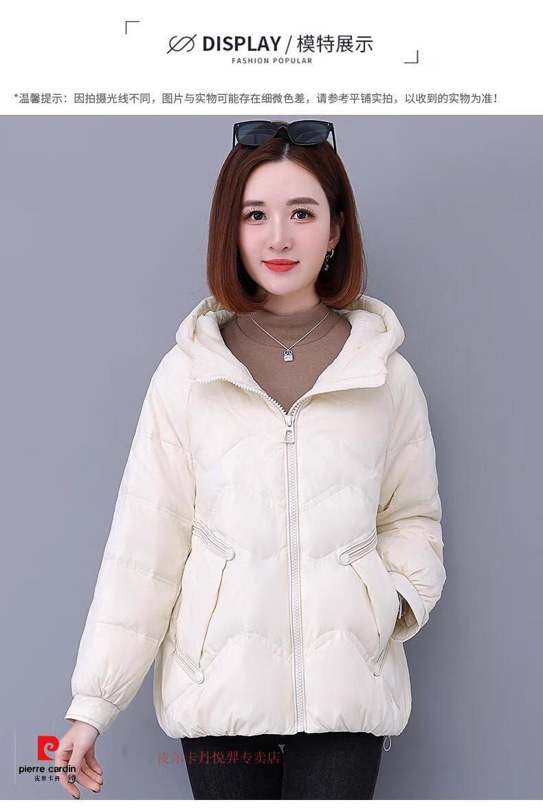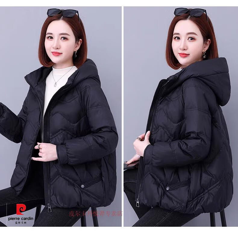 Pierre Cardin Women's Down Jacket Winter 2025 New Short Style Fashionable Age-Reducing White Duck Down Mother's Hooded Lightweight Jacket Black XS 90-120Jin Jin is equal to 0.5 kg