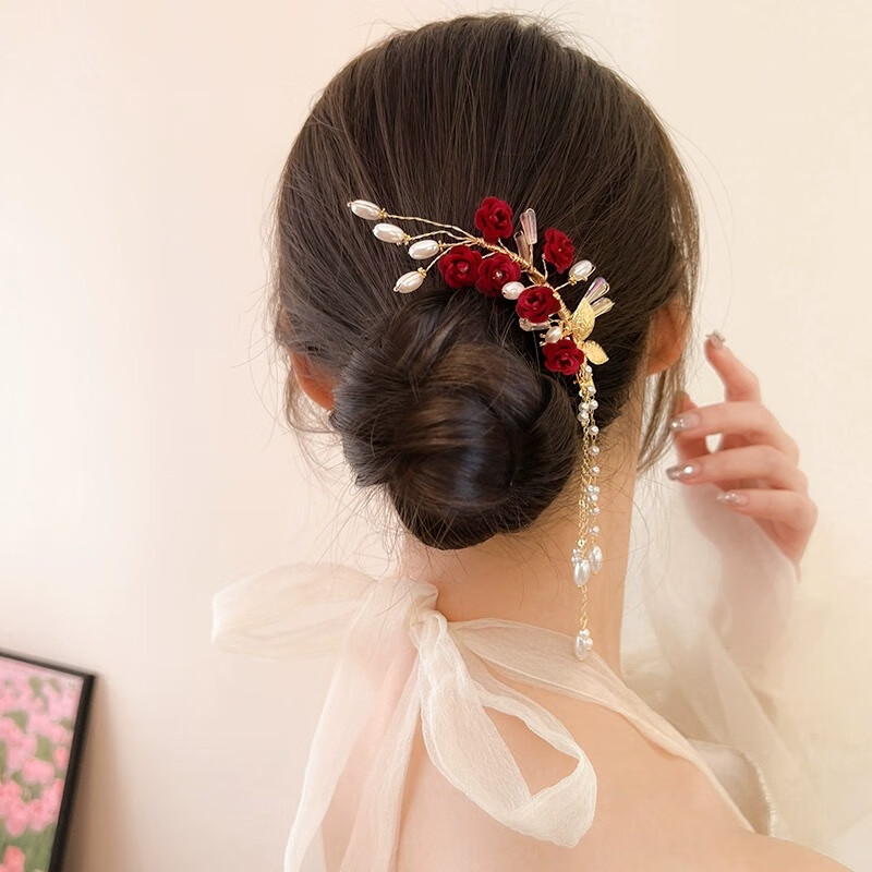 Shengli Wedding Engagement Headwear Horse Face Skirt Toast Wear Red Hairpin Hairpin Female Bridal Accessories Cheongsam New Chinese Style Hair Accessory Flocked Rose Lace Clip (tassel style)