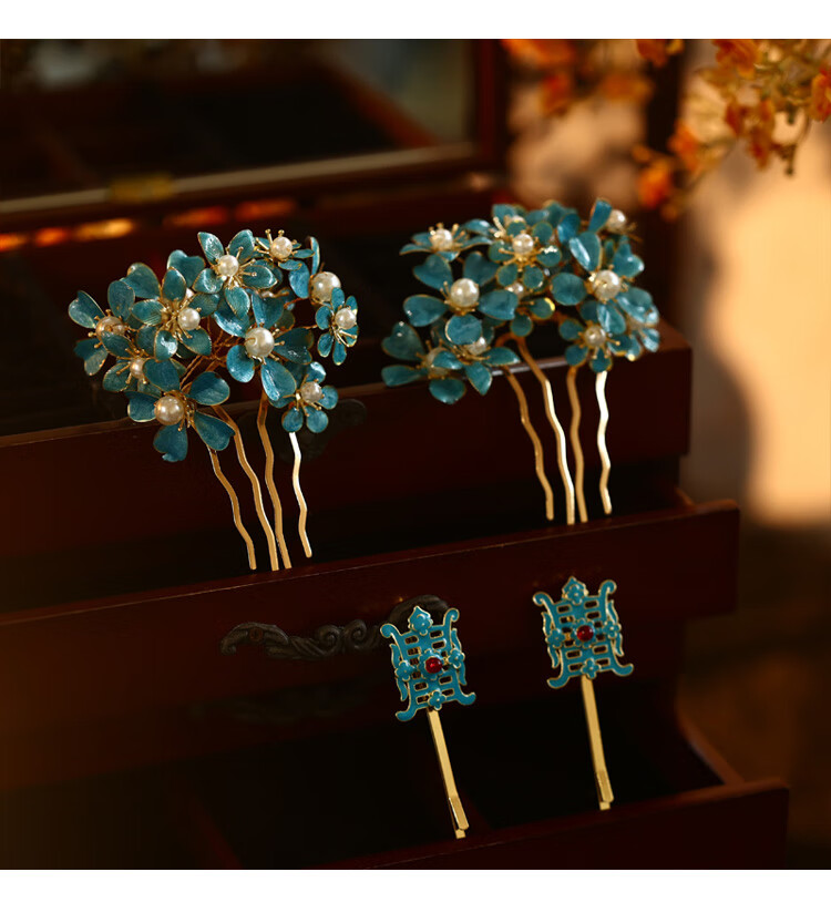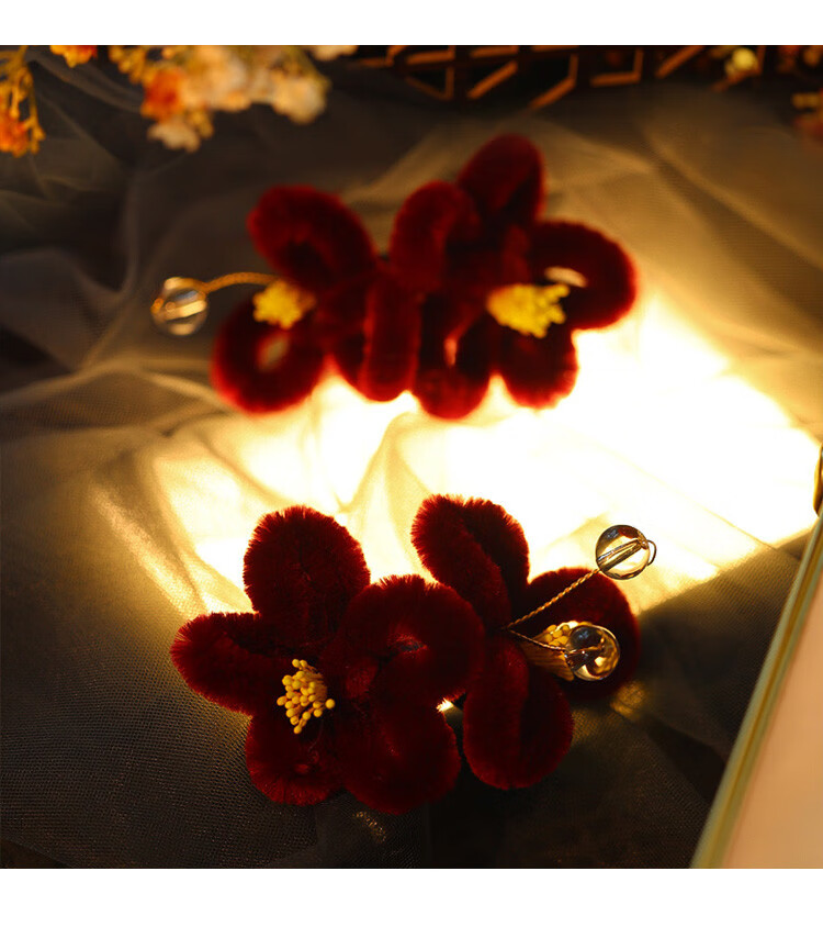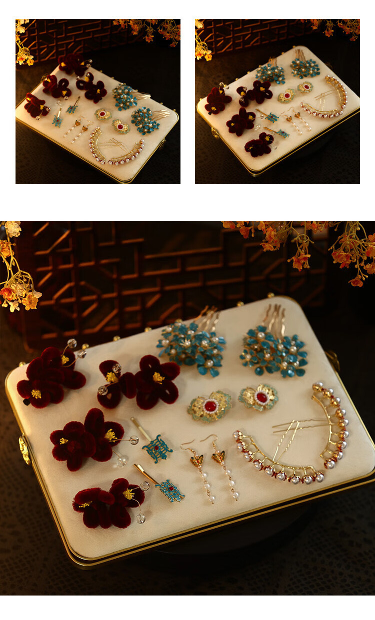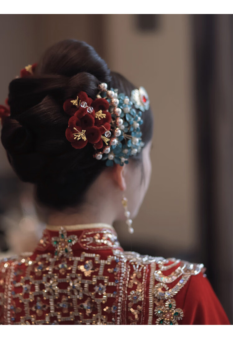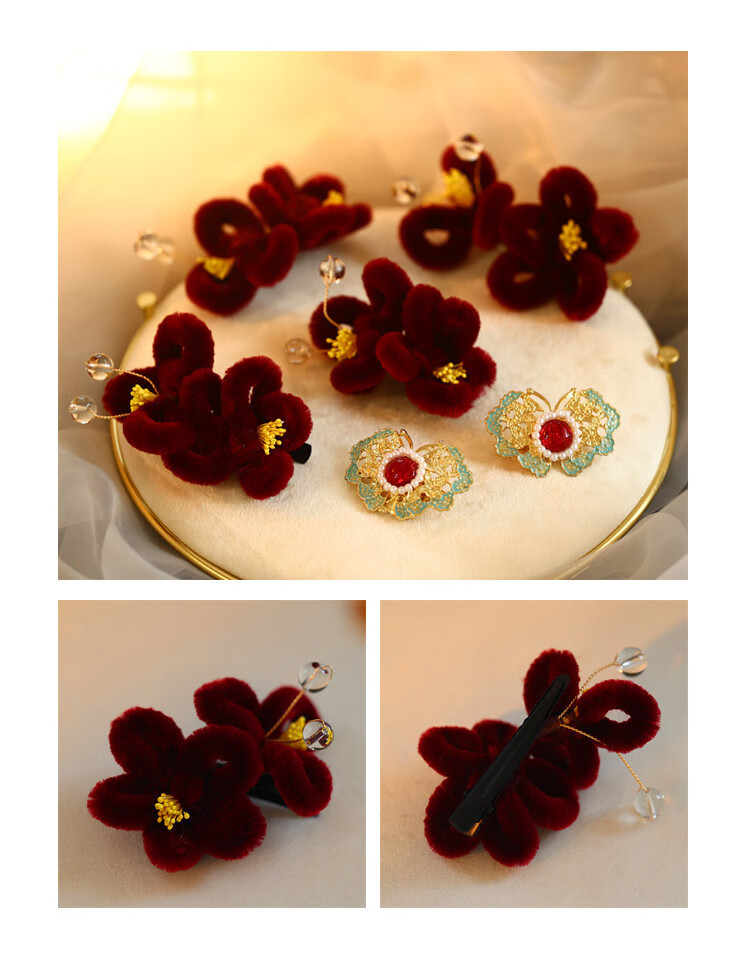 Shengli Chinese antique hair accessories handmade velvet flower small set embellished multi-purpose Xiuhe clothing ancient costume hair accessories bridal headdress 4 velvet flowers + a pair of butterfly hairpins 6-piece set