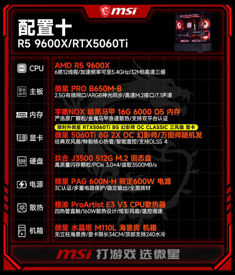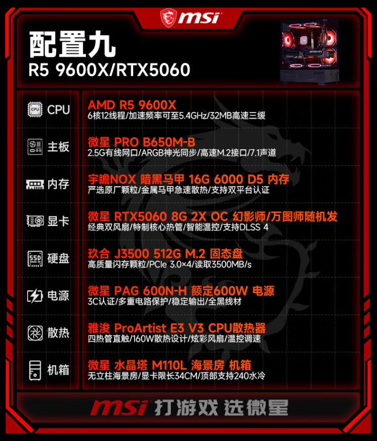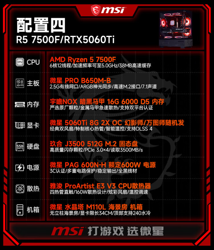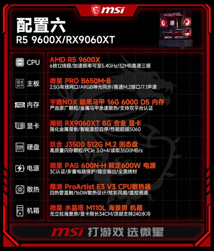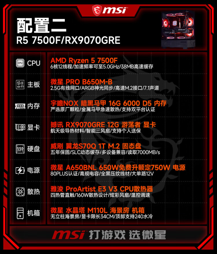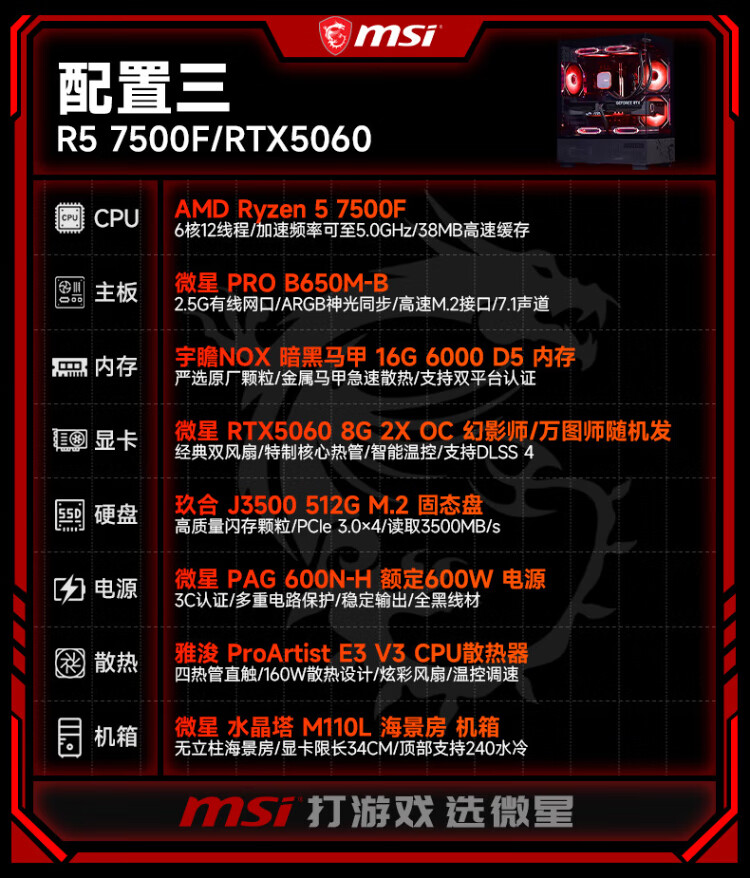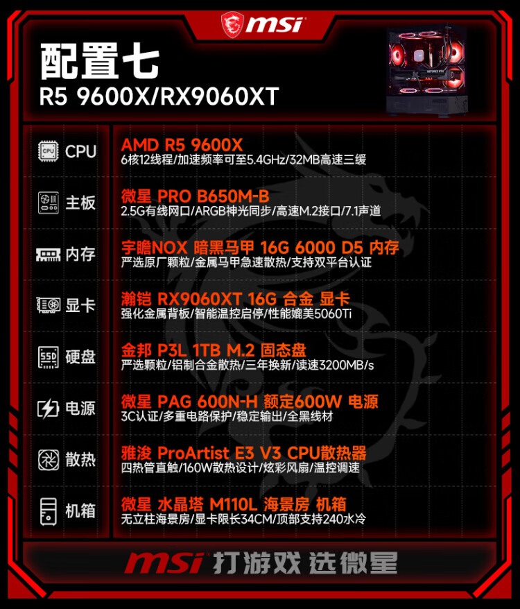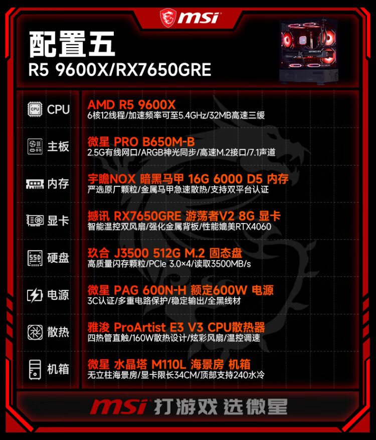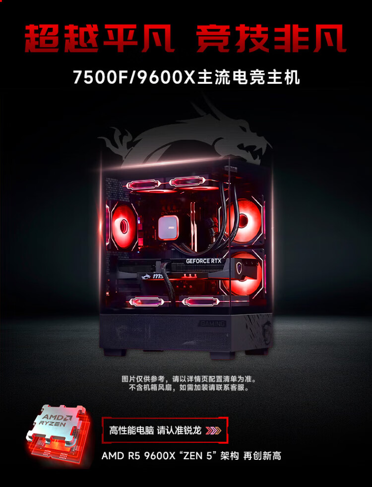 MSI AMD Ryzen 7500F/9600X/7650GRE/9060XT/5060Ti desktop assembly machine game e-sports Delta mobile computer host DIY complete machine sea view room configuration five 9600X+RX7650GRE