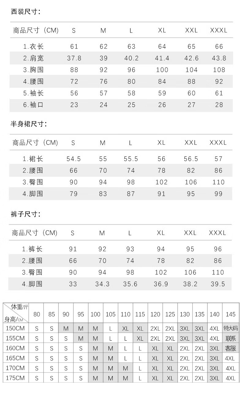 China (cm) 160-165/84-86 165-170 / 88-90 167-172 / 92-96 168-173 / 98-102 170-176 / 106-110