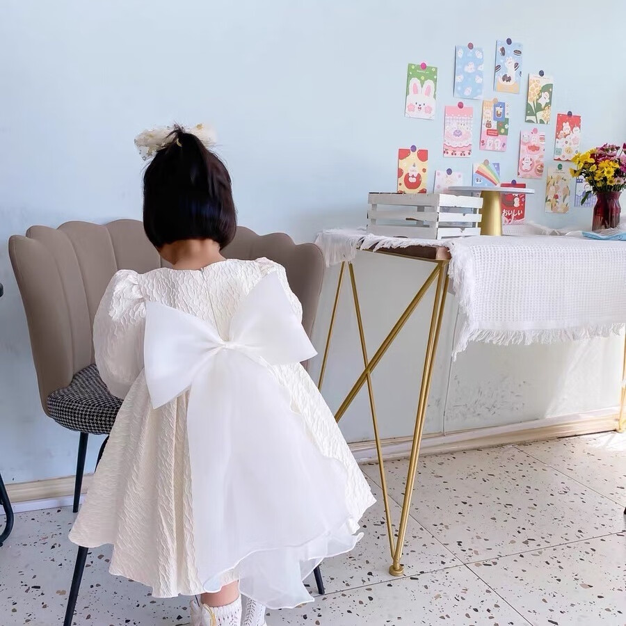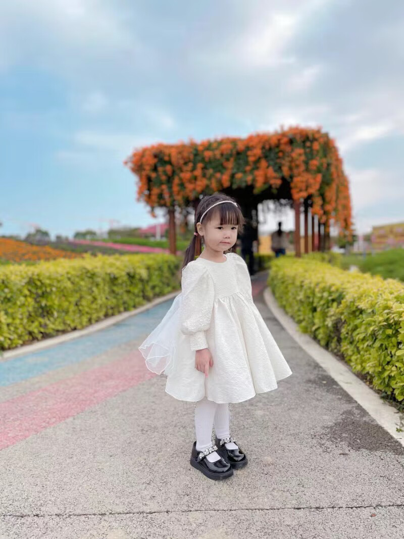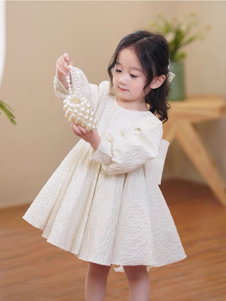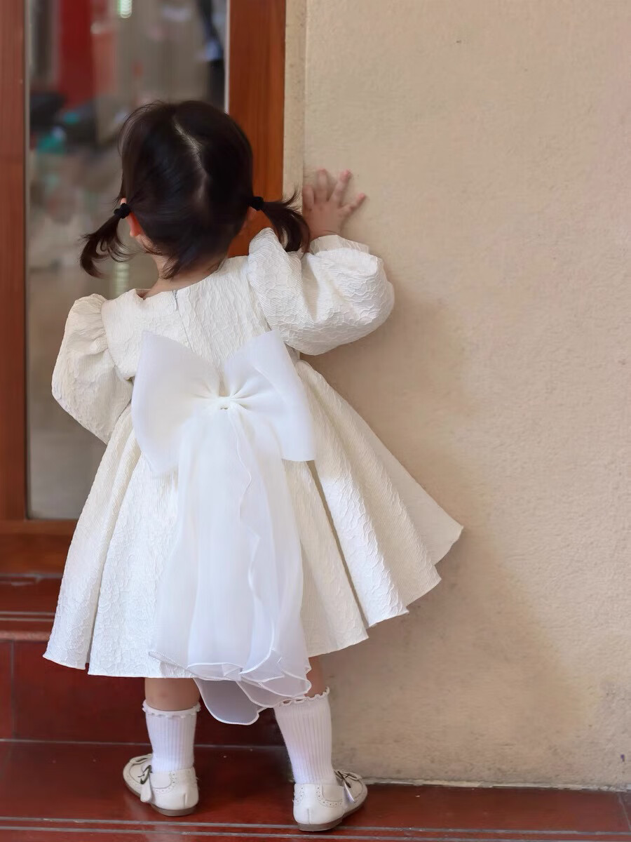 Nian Lulan Princess Dress Girls 2024 Spring and Autumn Korean Flower Girl White Dress One Year Old Dress Baby Girl Summer White Long Sleeves with Pearl Headband 90
