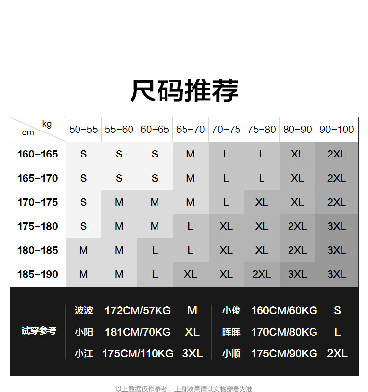 China (cm) 165 / 88-90 170 / 96-98 175 / 108-110 180 / 118-122 185 / 126-130