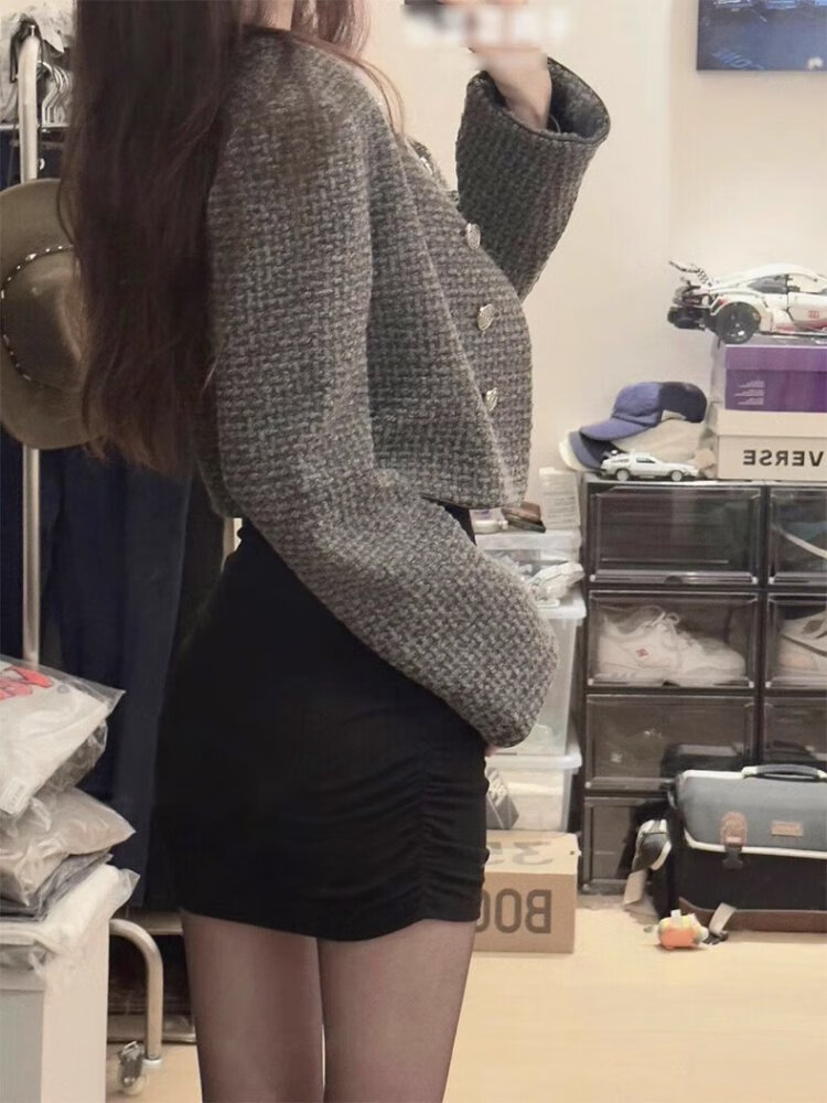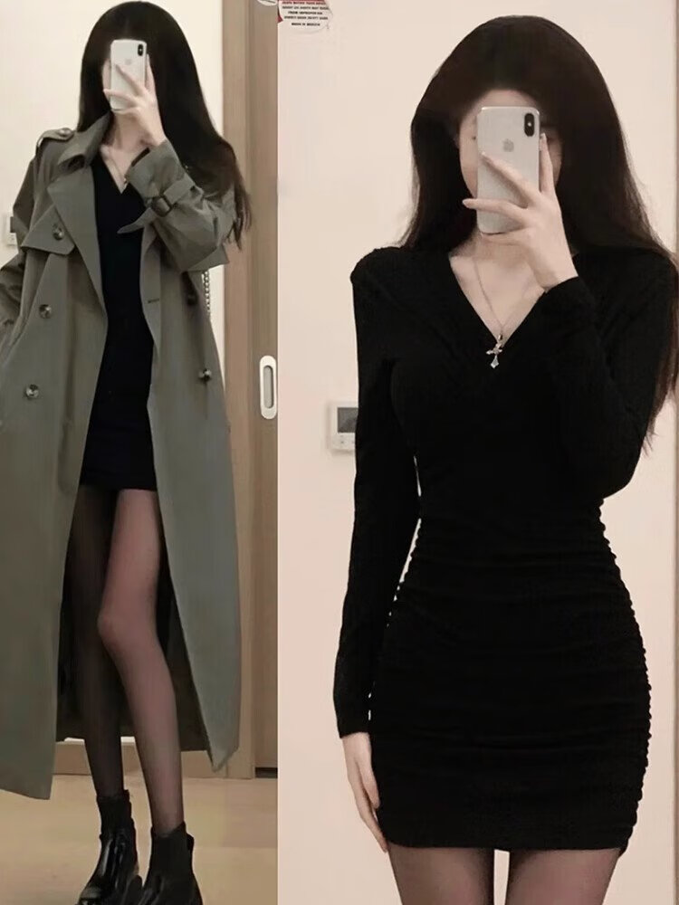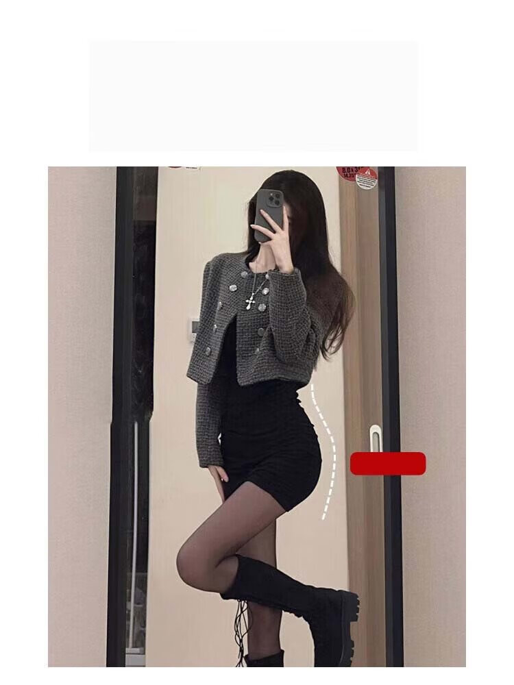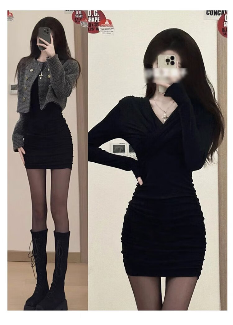 In the glimmer, the little mother's butt-covering dress is for women in early autumn, with a windbreaker underneath, a tight black short skirt, a slim fit and a sexy suit, black hot girl bottoming skirt, black L