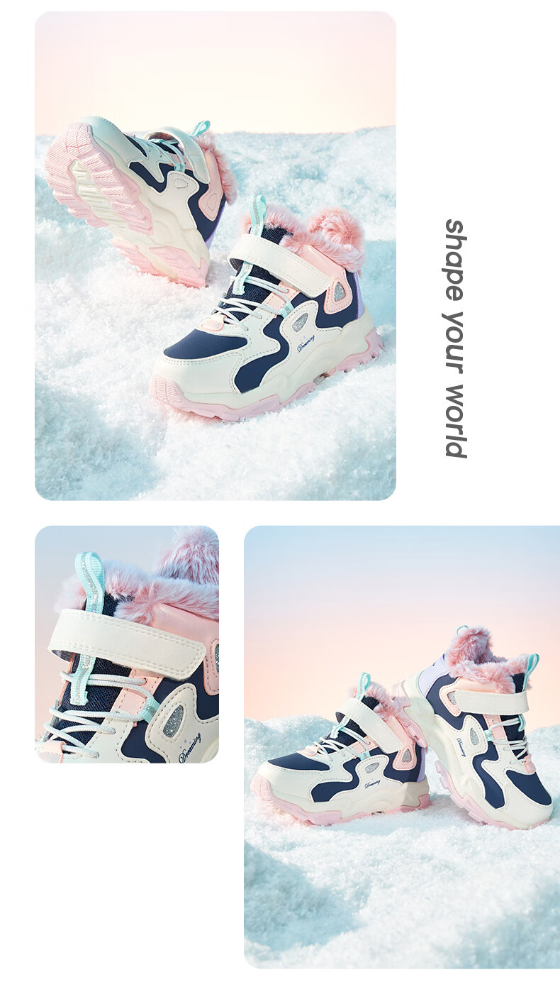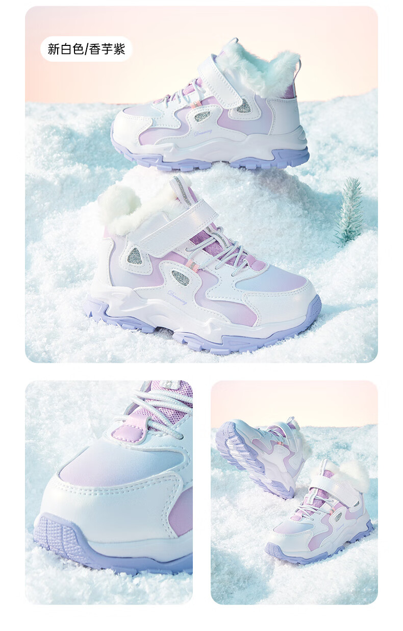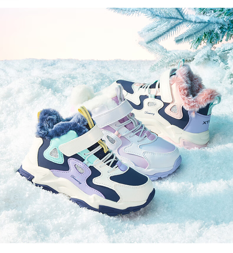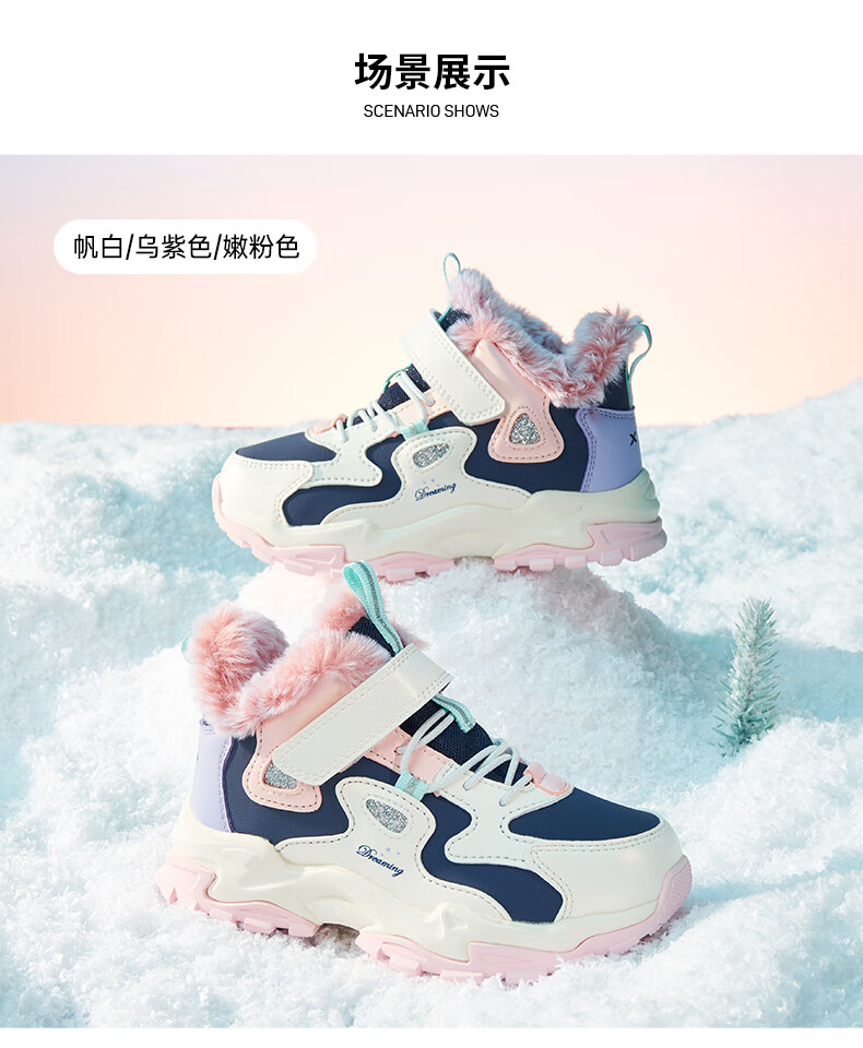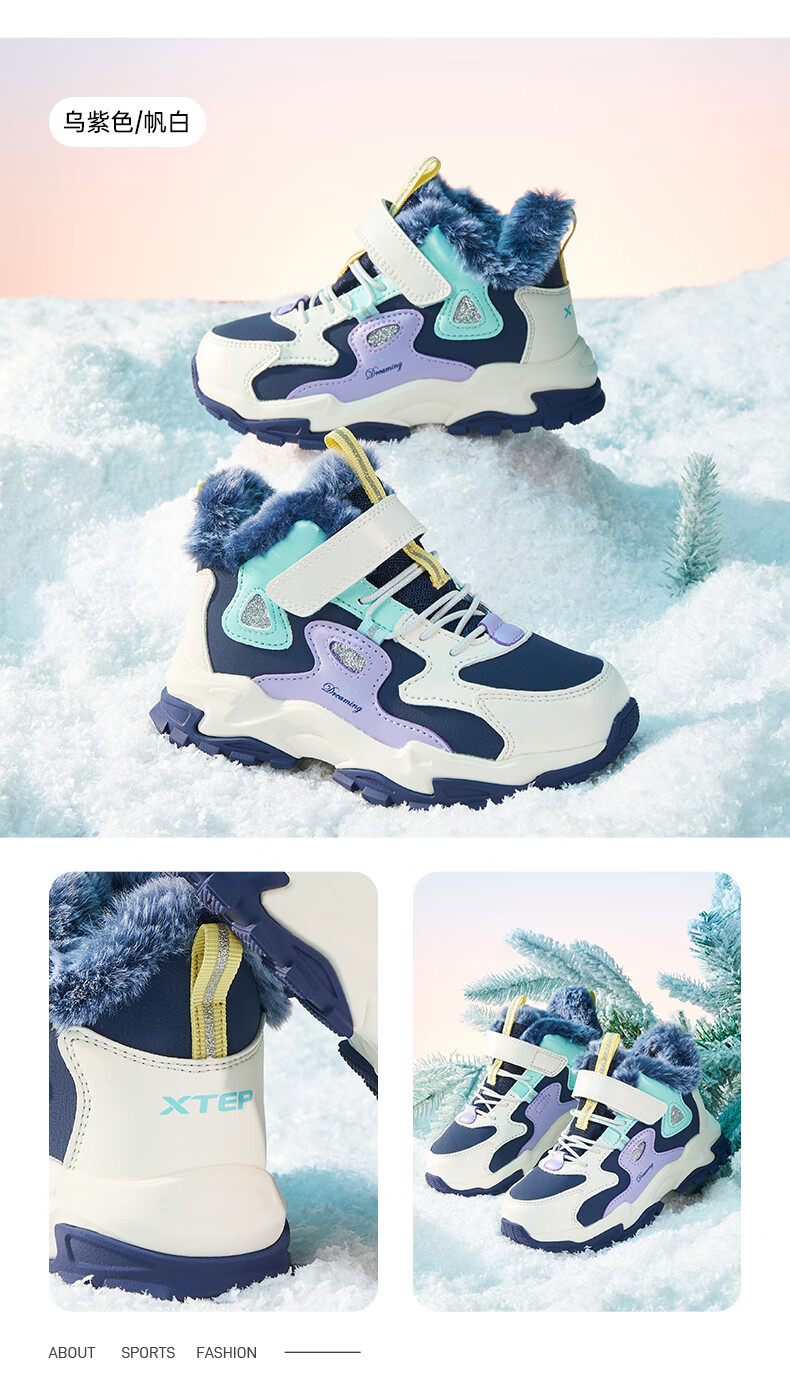 Xtep Children's Shoes Leather Windproof Warm Velvet Cotton Shoes Girls Velcro Contrast Color Anti-Slip Children's Shoes New White/Taro Purple 29