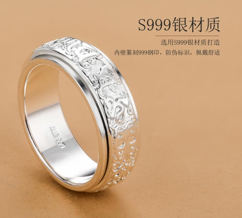 DL 1998 Fat Donglai same style Pixiu ring can rotate six-character mantra 999 silver men's national trend single rotating index finger ring No. 26, finger circumference is about 66MM