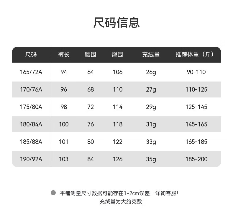 China (cm) 165 / 88-90 170 / 96-98 175 / 108-110 180 / 118-122 185 / 126-130