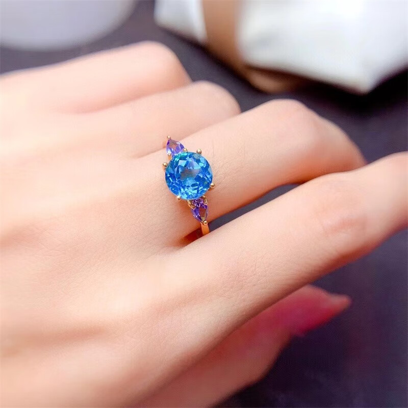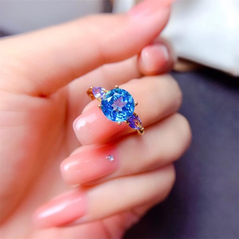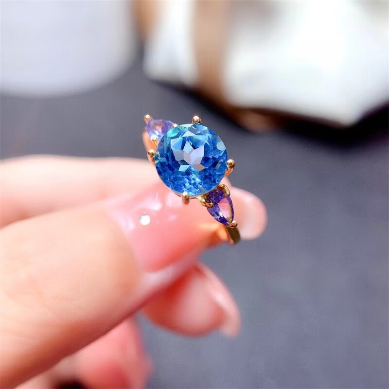 Shanguan natural Swiss blue topaz ring for women 925 silver light luxury fashion niche sapphire ring for girlfriend Mo natural white gold topaz + tanzanite ring