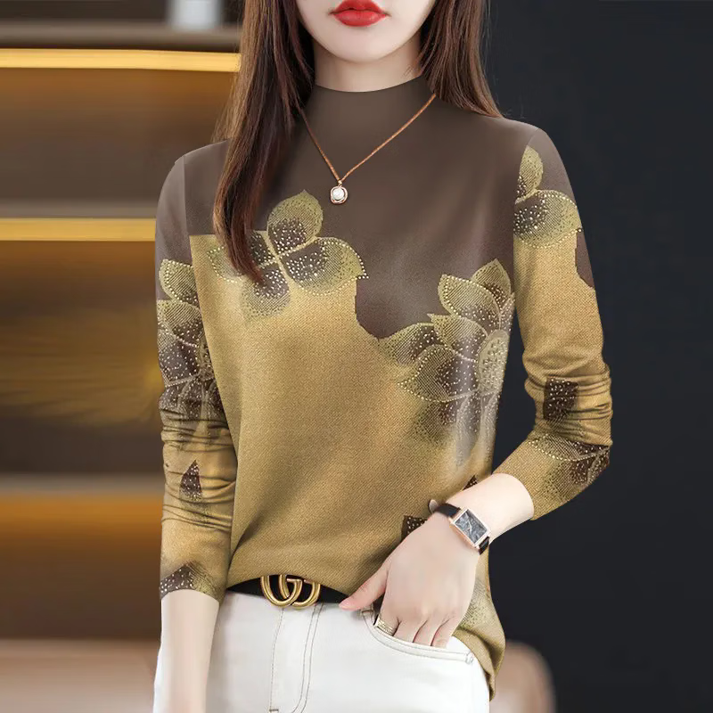 Yu Yixiang half turtleneck bottoming shirt for mothers, women's spring and autumn long-sleeved 2025 new high-end printed belly-covering T-shirt women's tops khaki yellow positioning flower 2XL recommended 125-140Jin Jin equals 0.5 kg