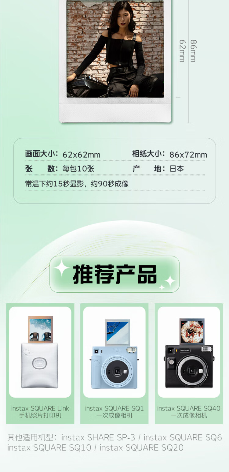 Fuji (FUJIFILM) one-time imaging photo paper square film SQ1/SQ 40/SQ Link/SQ 6/SQ 10/SQ 20/SP-3 instant camera mobile phone photo printer photo square white edge (20 photos) + square black and white (10 photos)