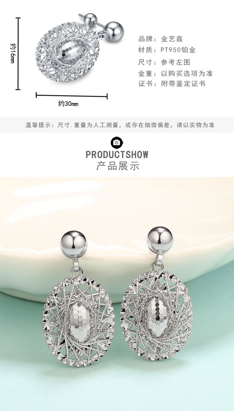 Jin Yixin platinum earrings pt950 genuine platinum earrings earrings earrings popular style platinum fashion pigeon egg earrings for women weighing about 12.5 grams a pair high about 30mm wide about 16mm