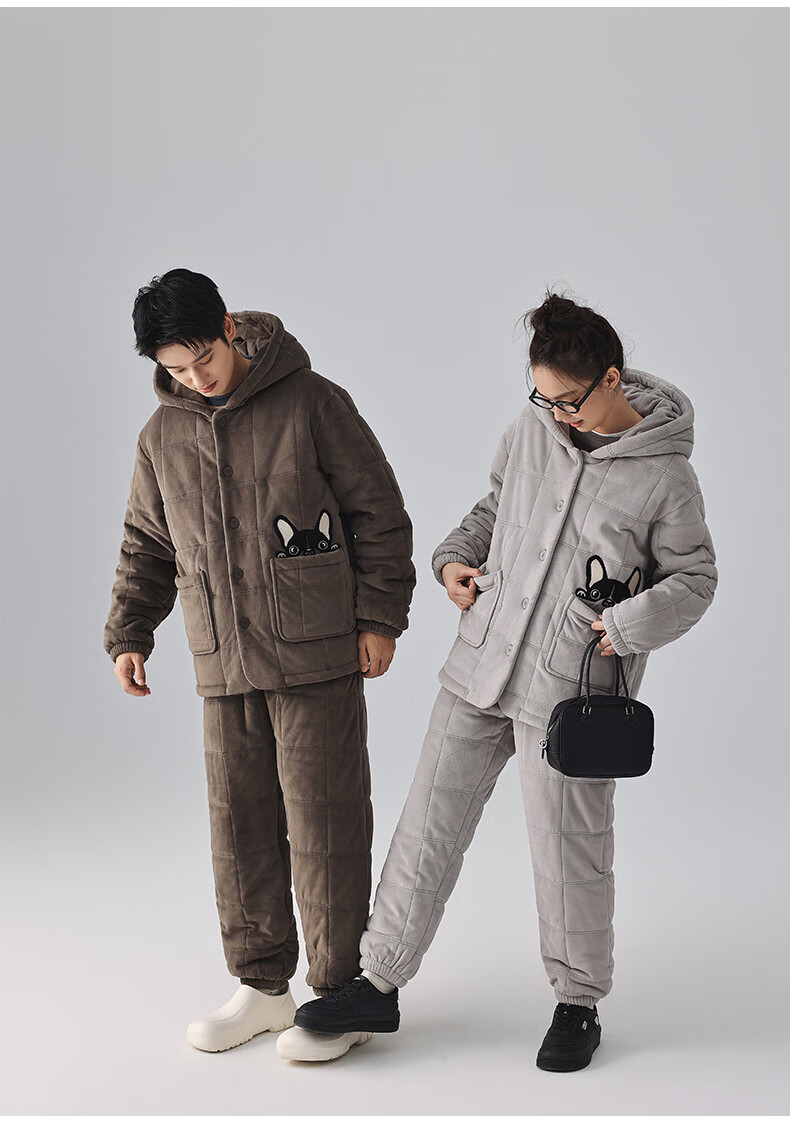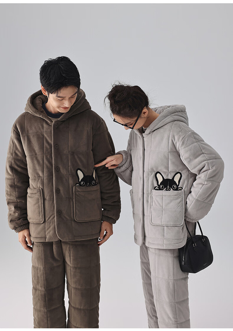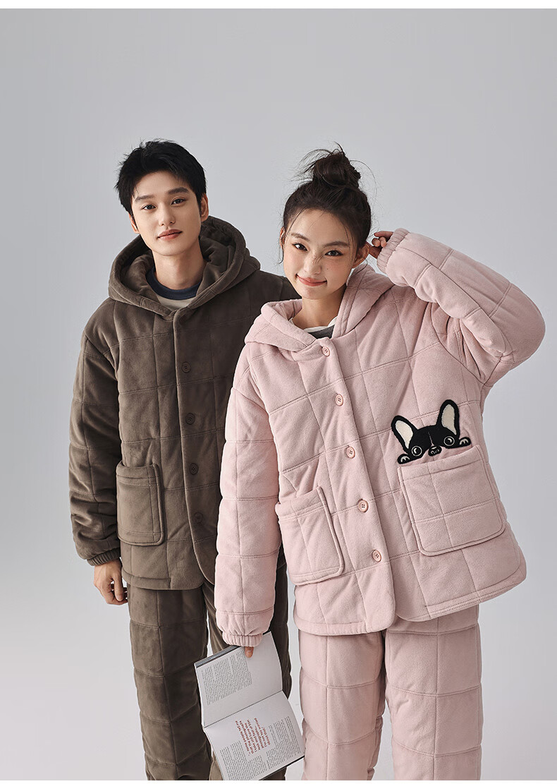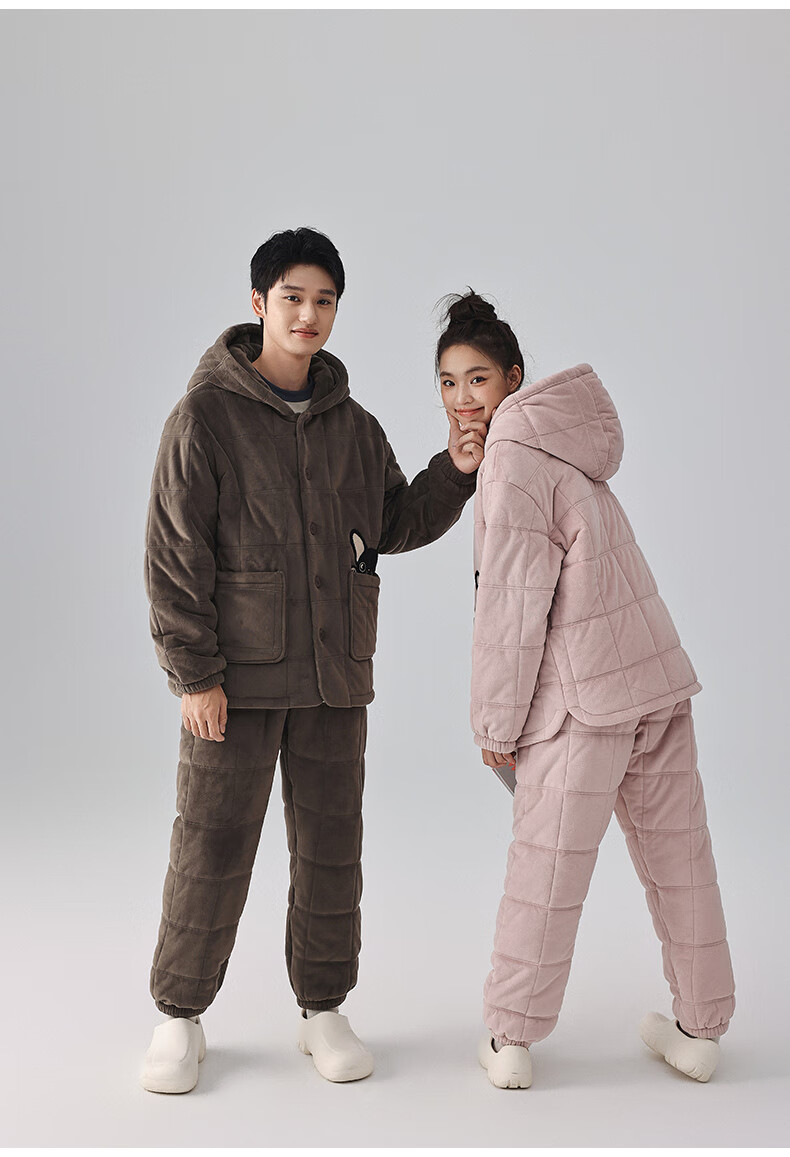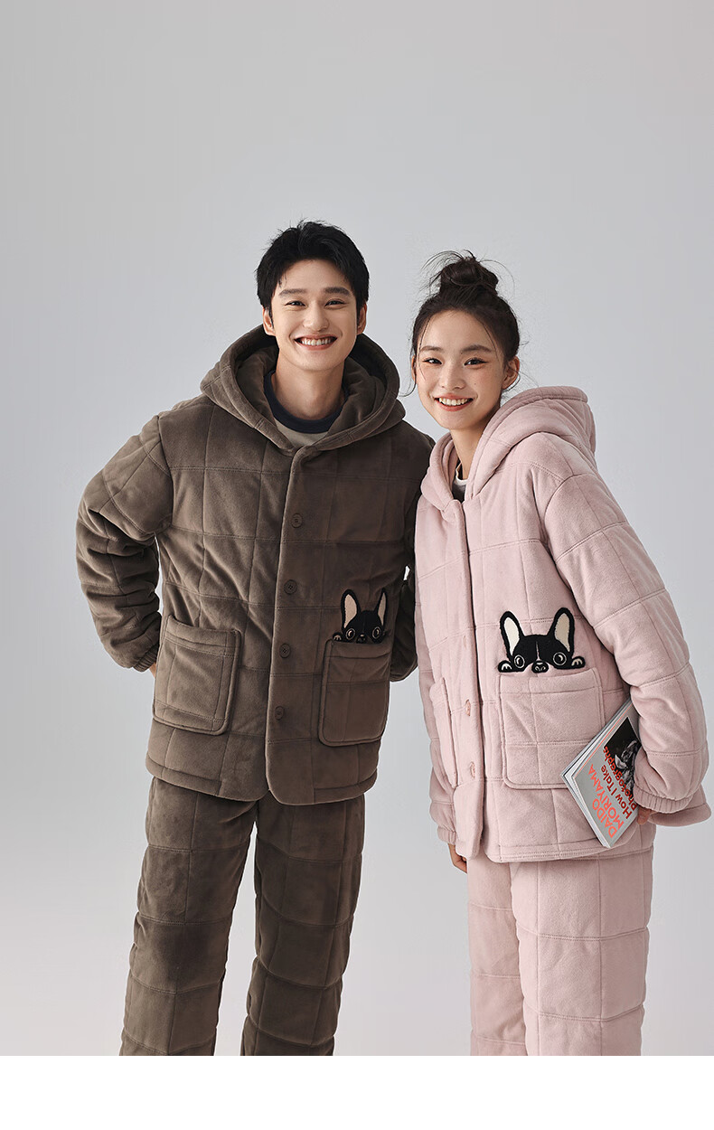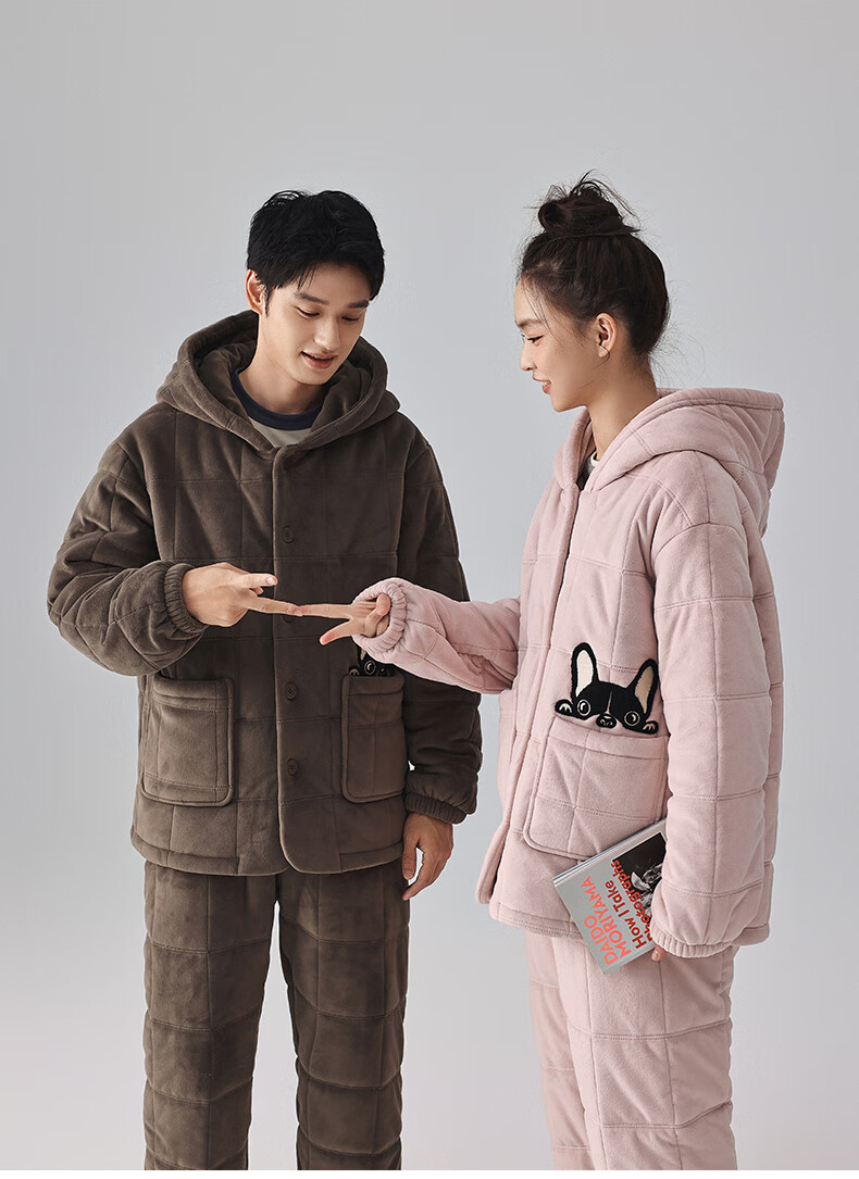 Kissing Cat Hooded Island Velvet Quilted Couple Pajamas Women's Winter Suit Three Layers Thickened Men's Home Clothes Outerwear 7032 Tea Brown Men L