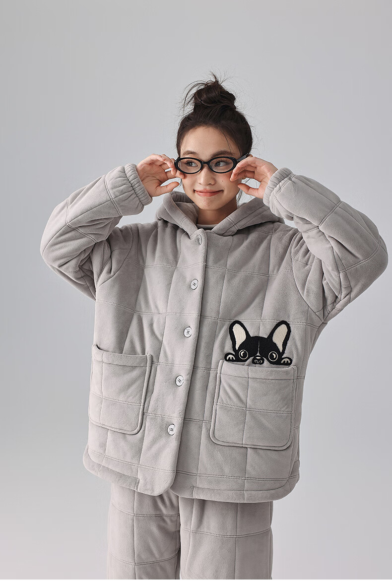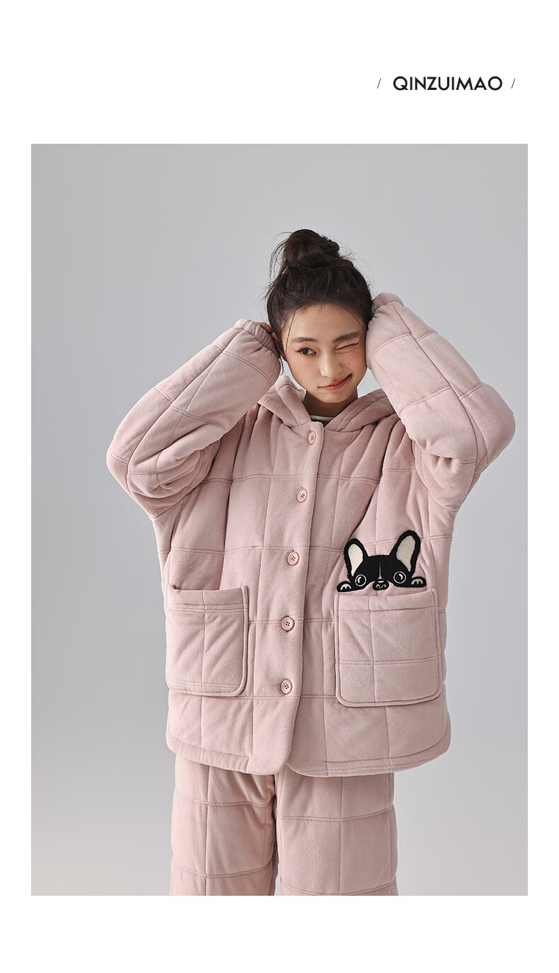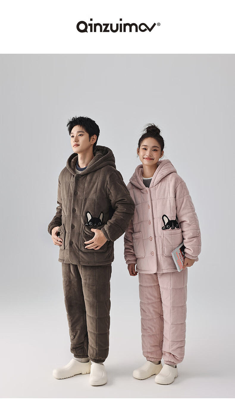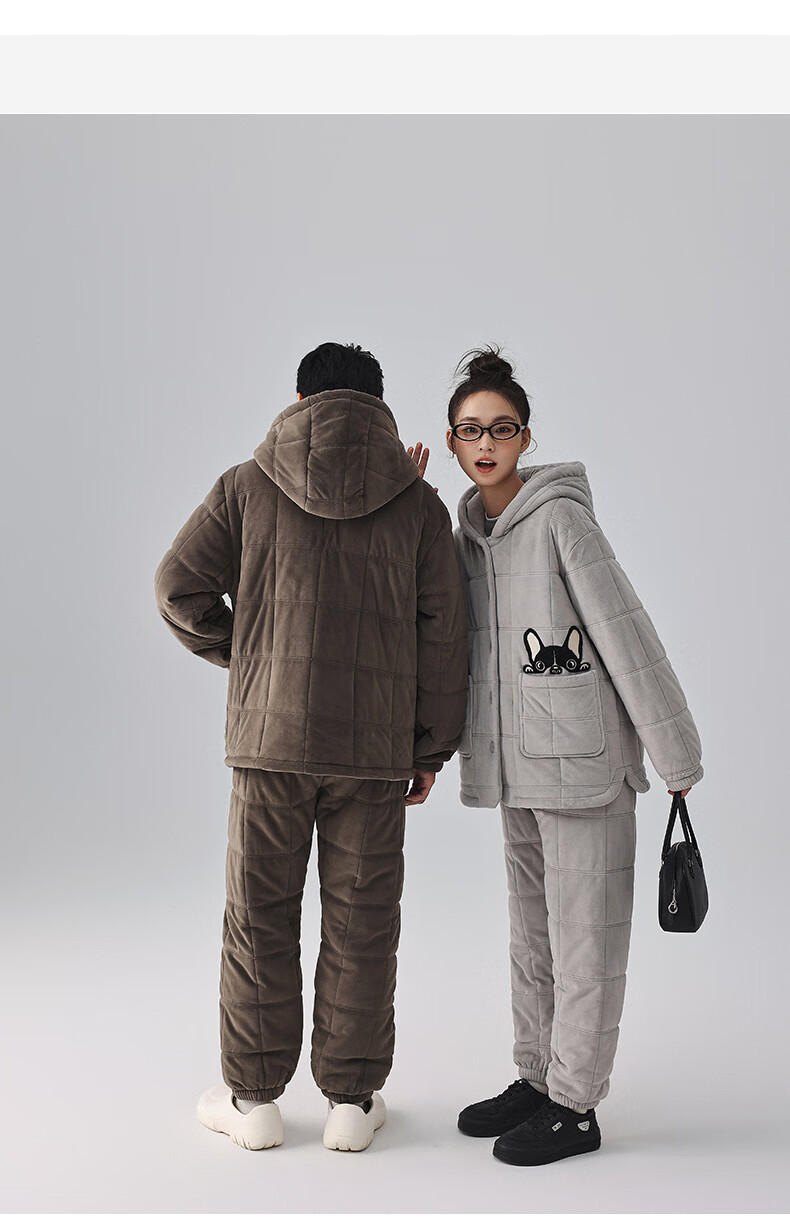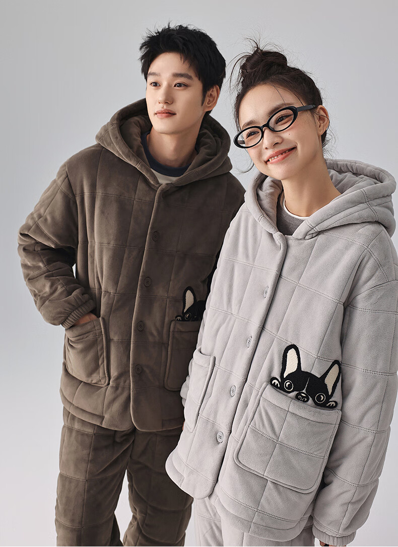 Kissing Cat Hooded Island Velvet Quilted Couple Pajamas Women's Winter Suit Three Layers Thickened Men's Home Clothes Outerwear 7032 Tea Brown Men L