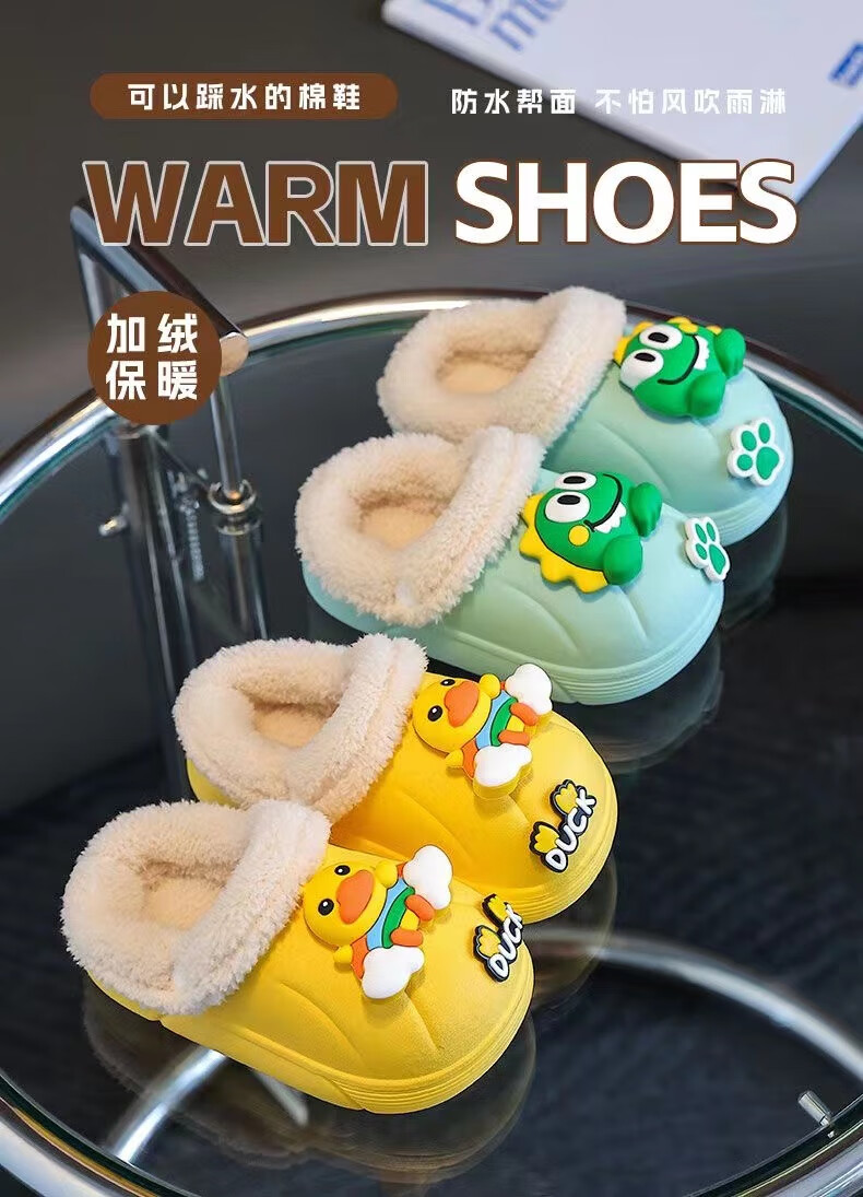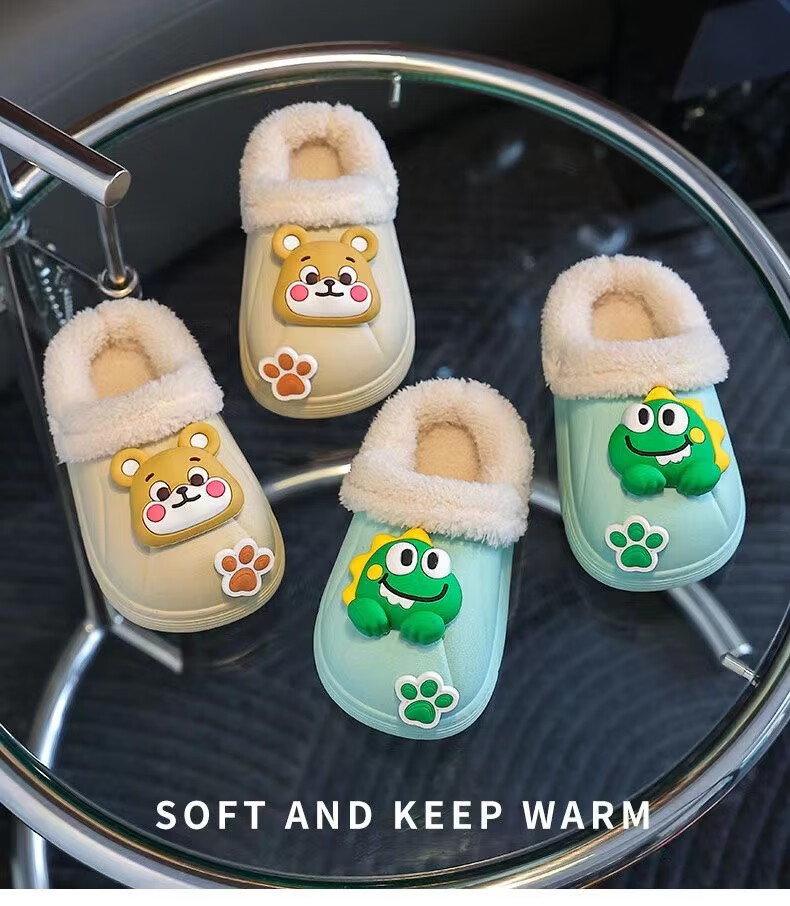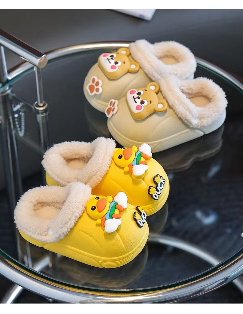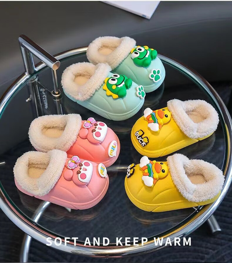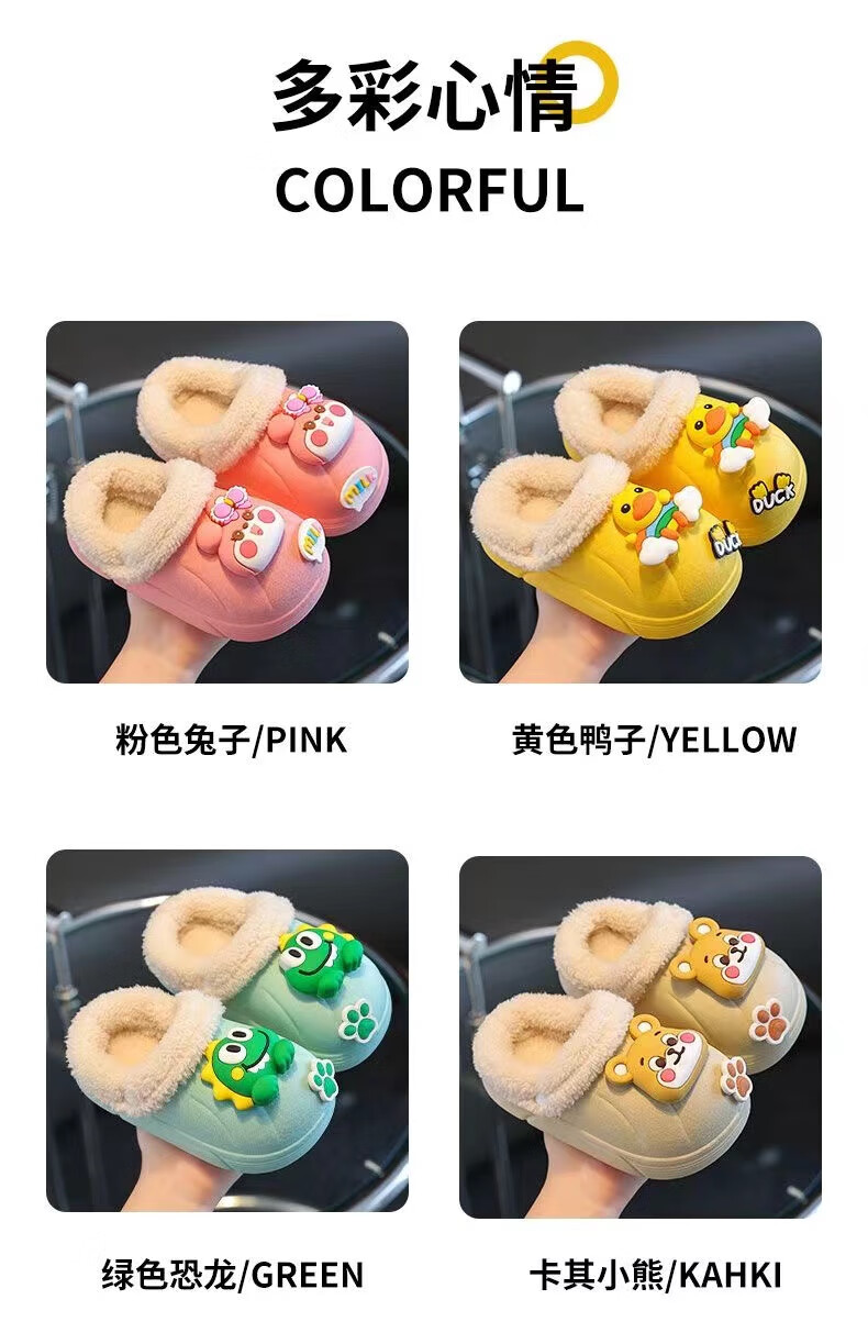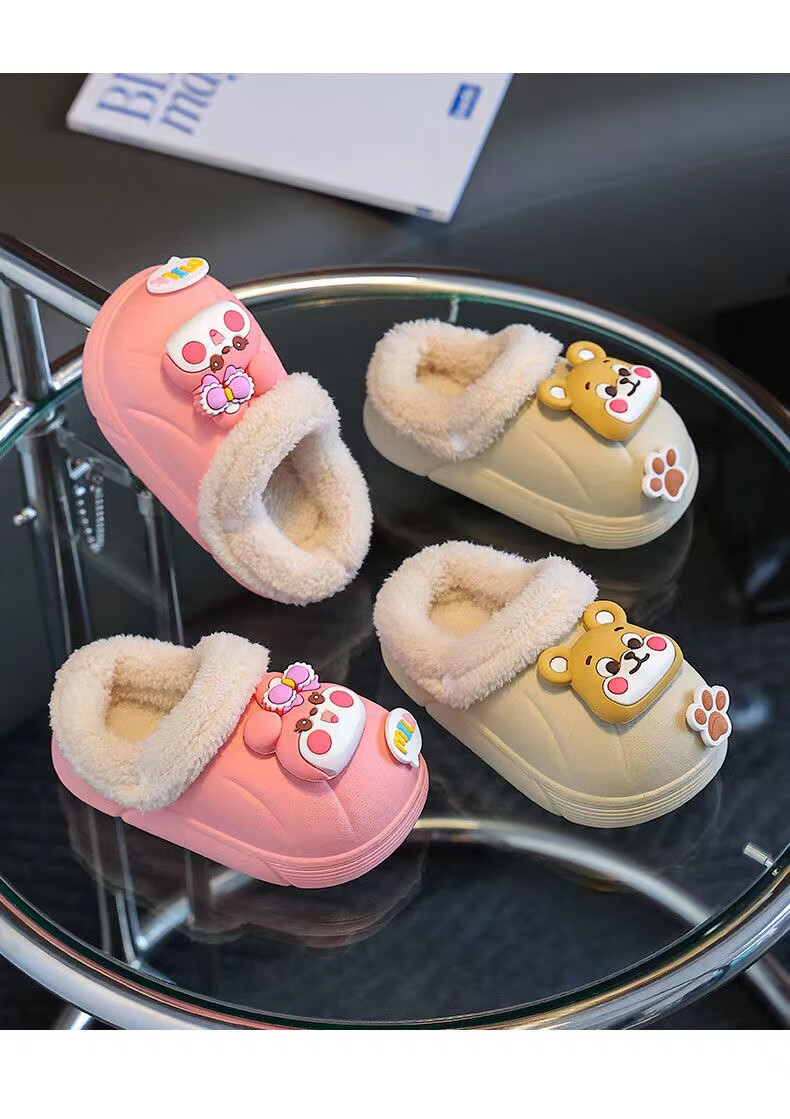 Children's cotton slippers with velvet and thickened removable foot covers in winter, waterproof and non-slip, cute cotton slippers for children and men, rose red, Strawberry Bear, 26.5, inner length 16cm, size too small
