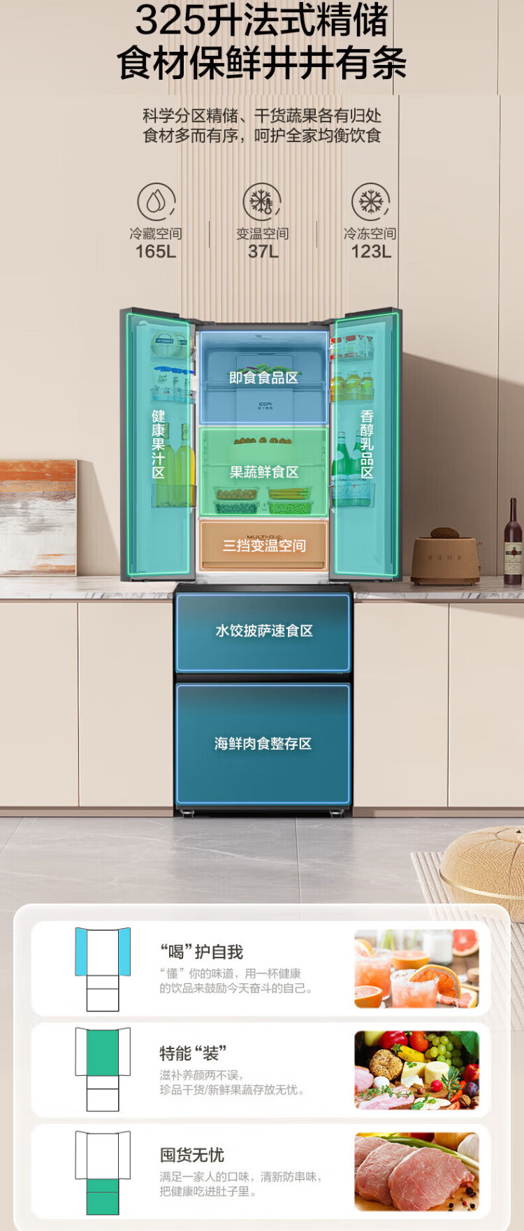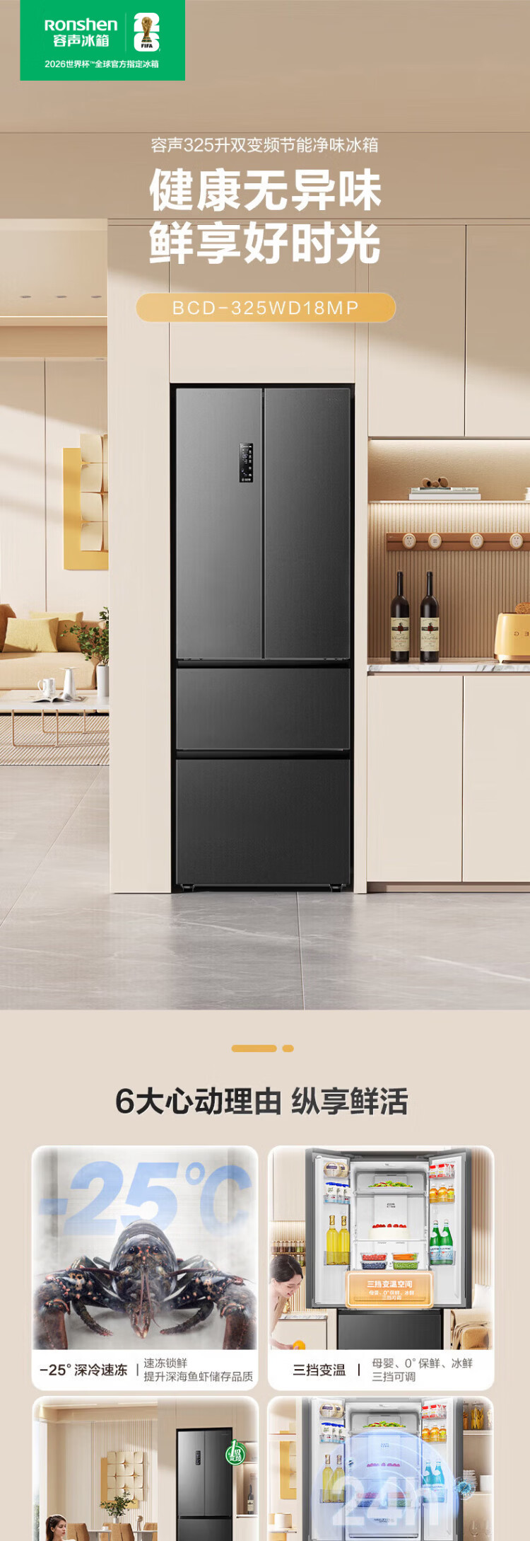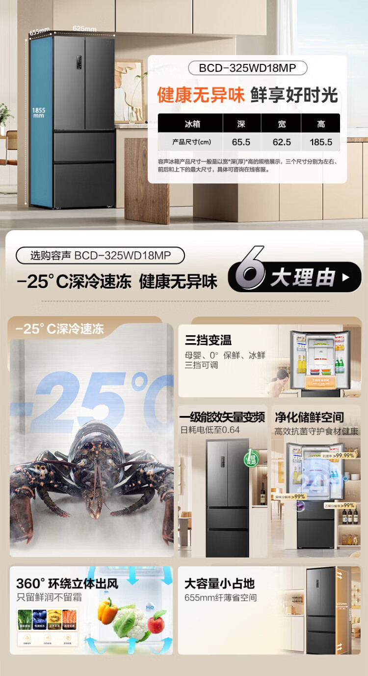 Rongsheng 325-liter double-cycle French multi-door four-door double-door first-class energy efficiency dual-frequency air-cooled frost-free ultra-thin recessable small-family household refrigerator national subsidy BCD-325WD18MP Mo Yun Gray