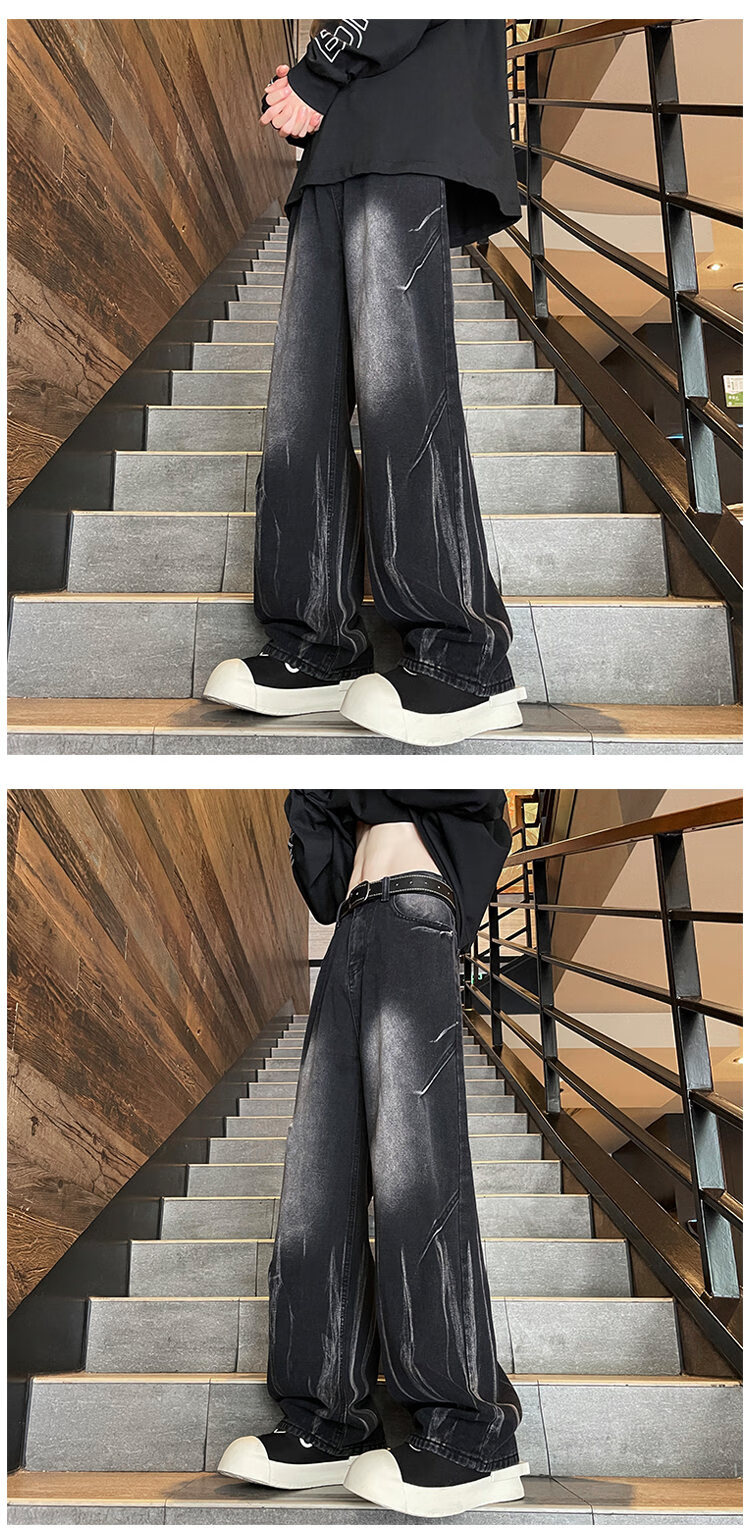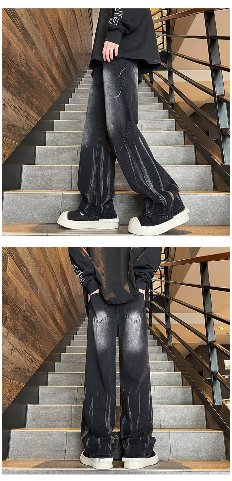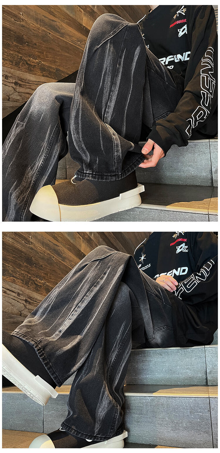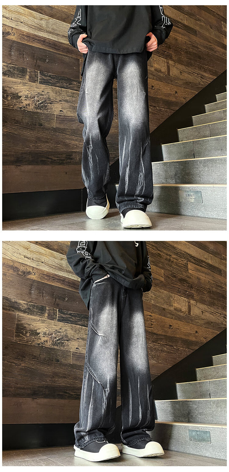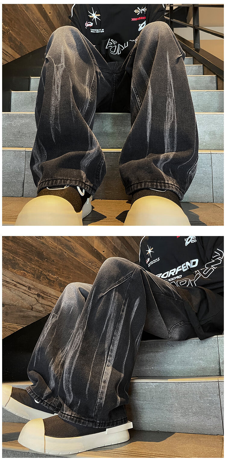 Shelley Jones American retro tie-dye jeans men's autumn and winter velvet washed gradient high street vibe slightly wide-leg pants black velvet L recommended 110-130Jin Jin equals 0.5 kg