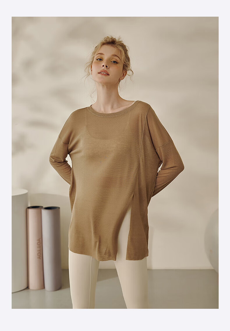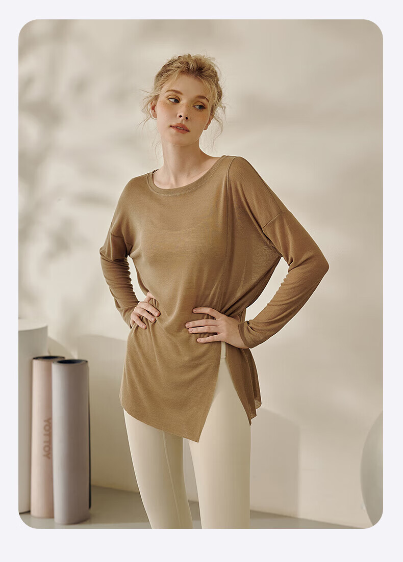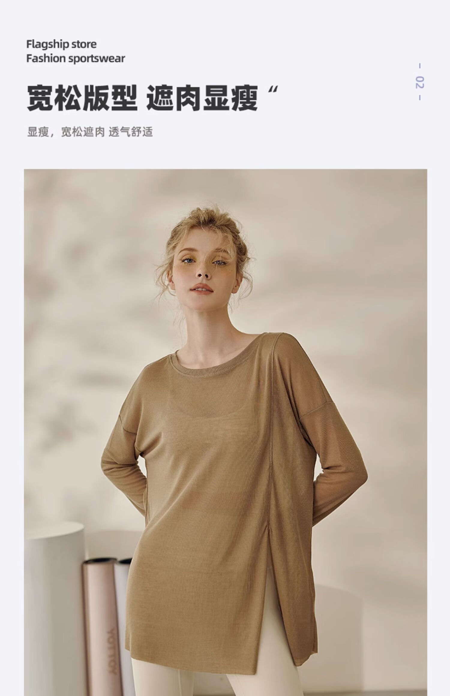 LULUUVTTOH loose sports top women's breathable running Pilates training fitness cover-up long hip-covering yoga wear long-sleeved khaki brown L/XL