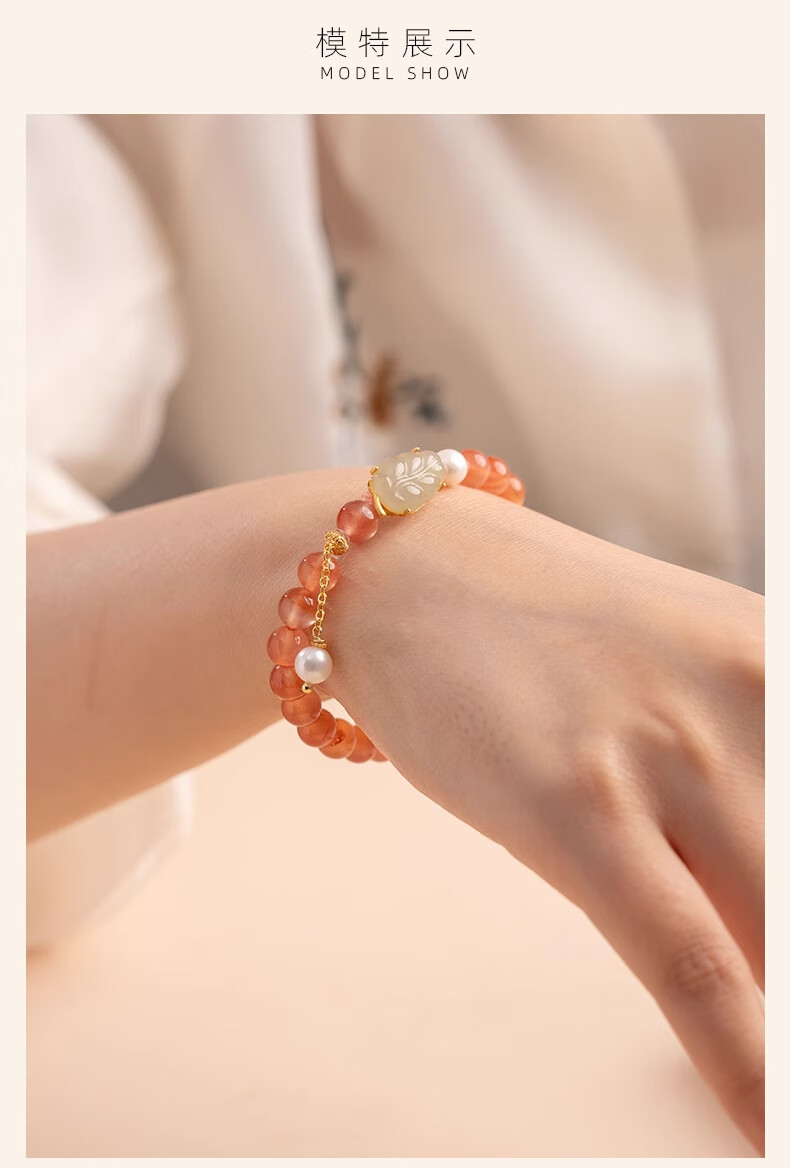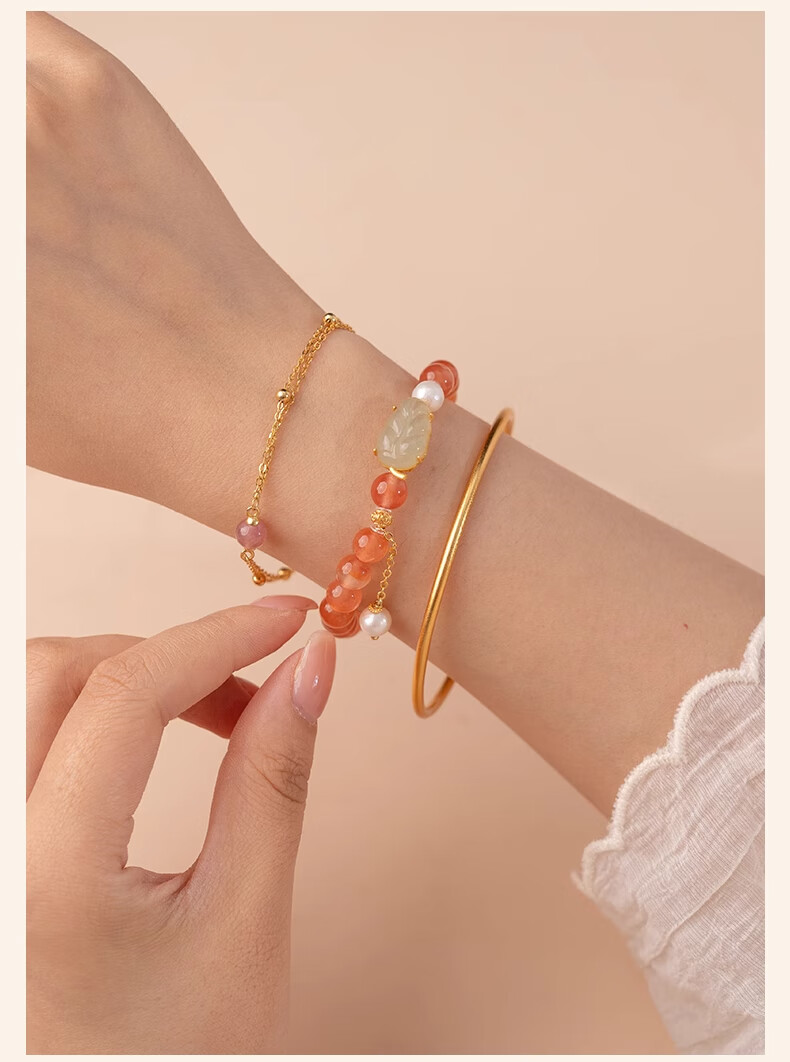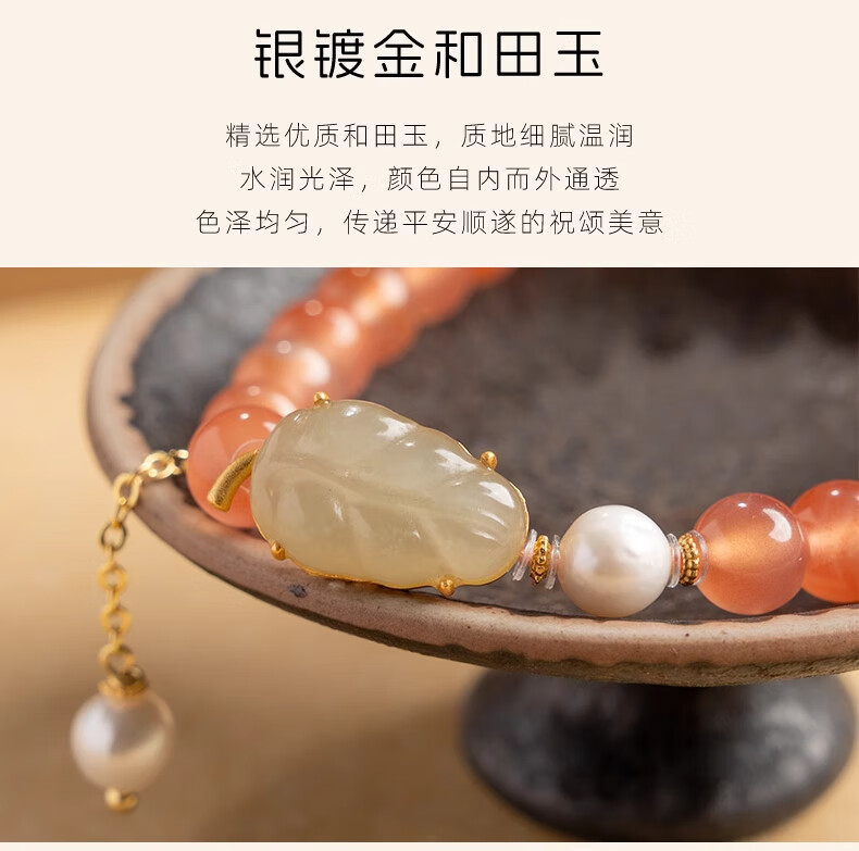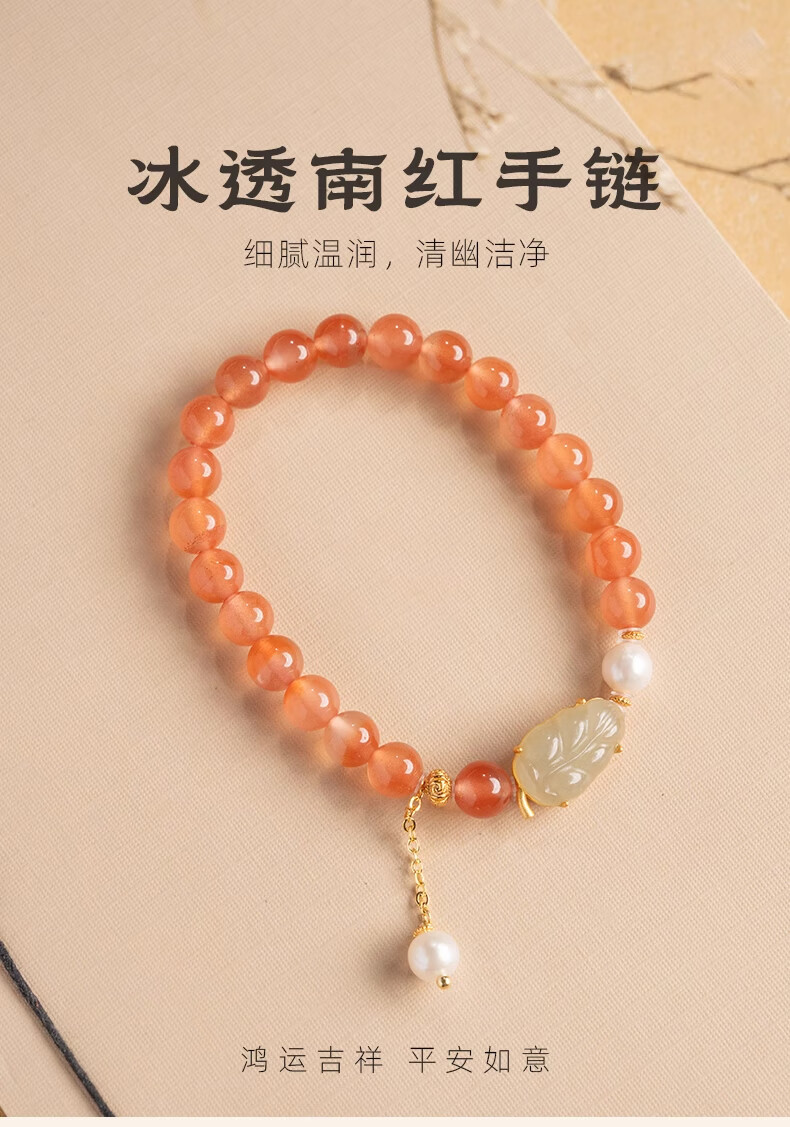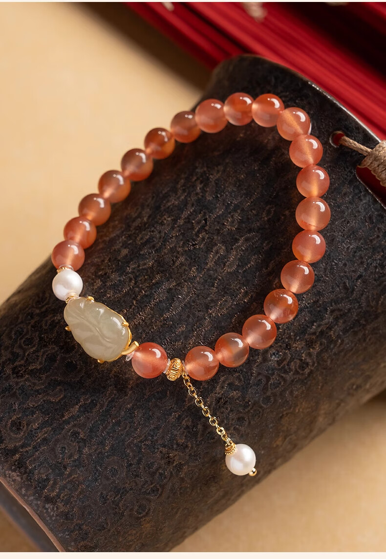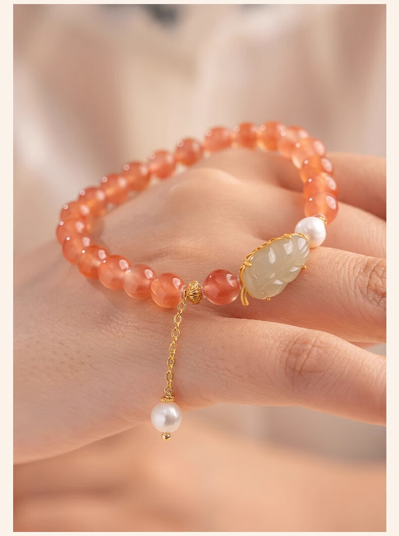 Bao Xin Fanrui BOSFRU Ice-Through Nanhong Bracelet Women's Natural Genuine Hetian Jade Leaf Beaded Bracelet for Mom to Play Light Luxury Jewelry Hotan Jade Leaf Ice-Thru Nanhong Bracelet Bracelet Length 14cm