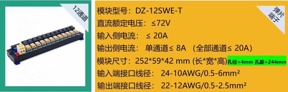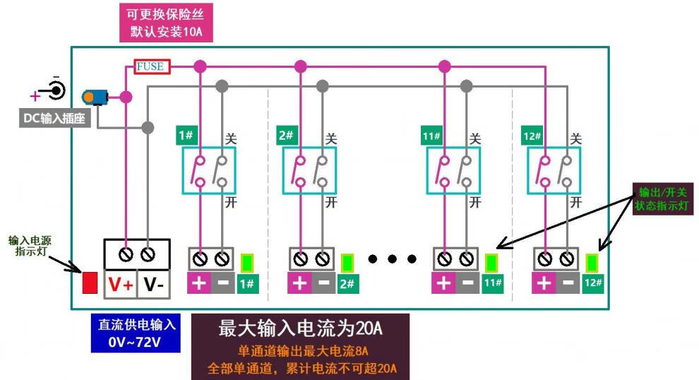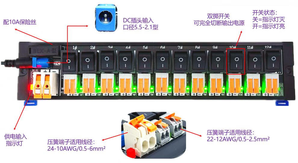2/3/4/6/8/12 channels DC switch distribution module fuse with switch indicator light for each channel 12 channels spring terminal