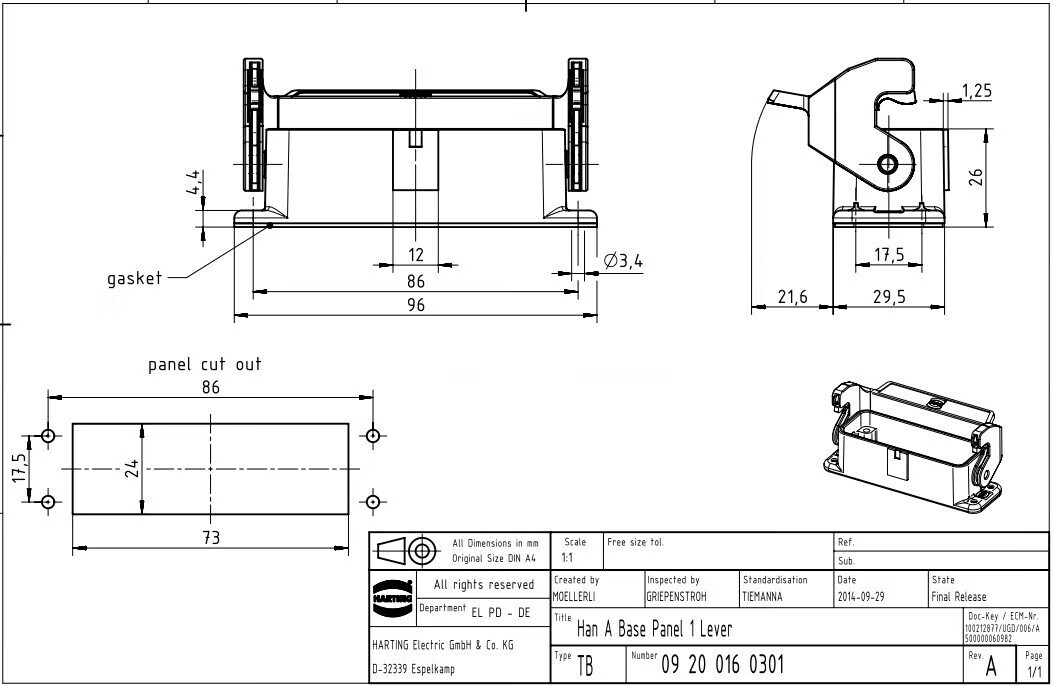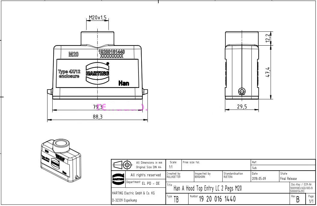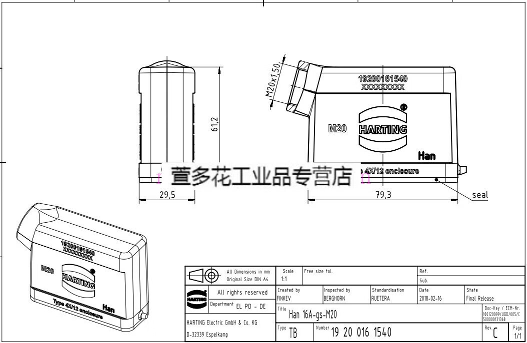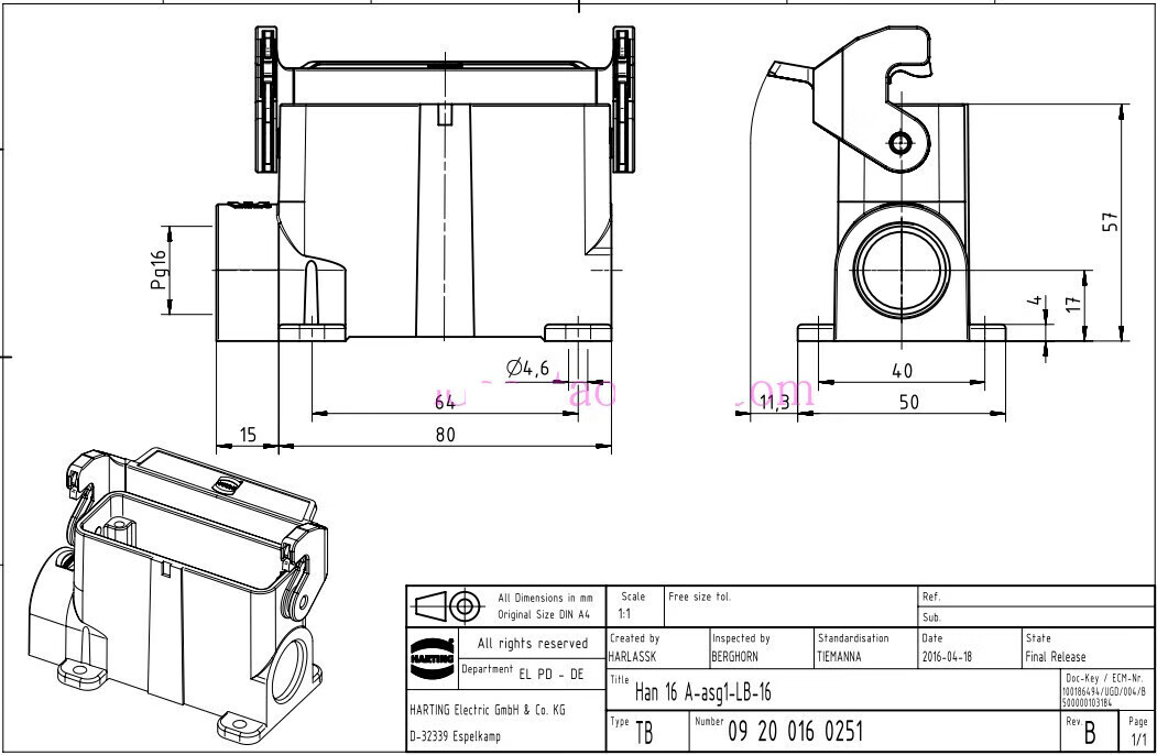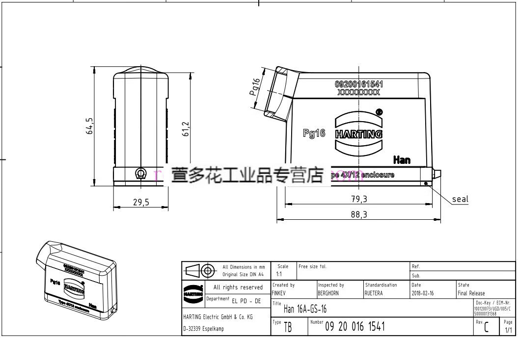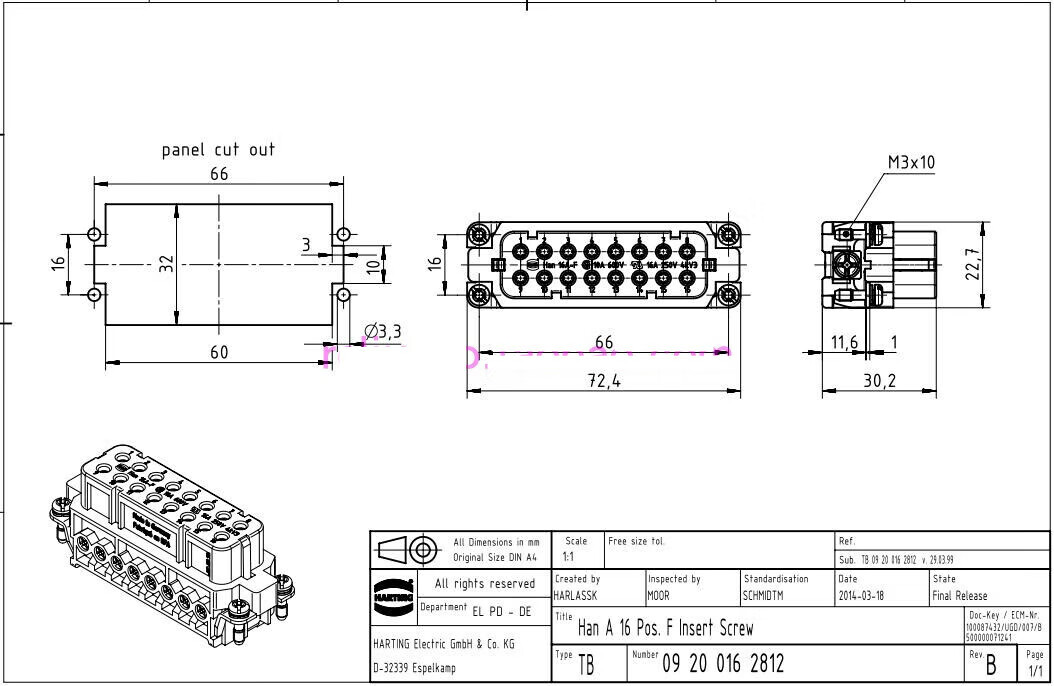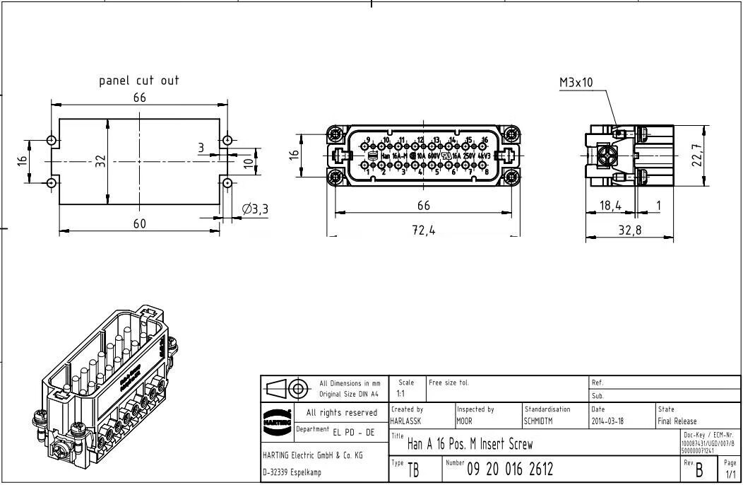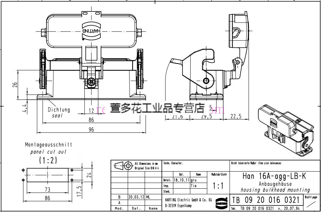 Customized HARTING connector 09200162612 male core plug HAN-16A-M precision small P16A/250V 19200161540 upper shell side hole