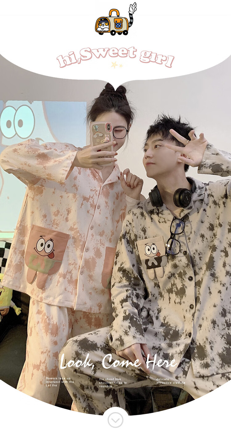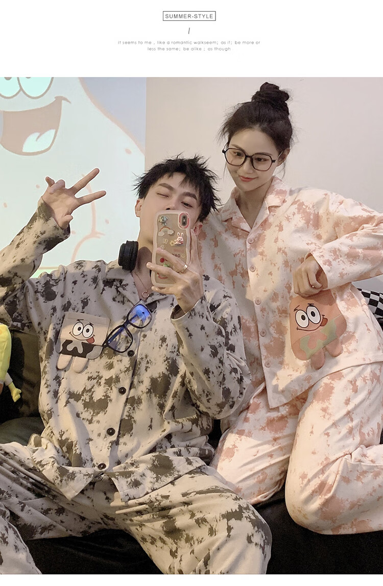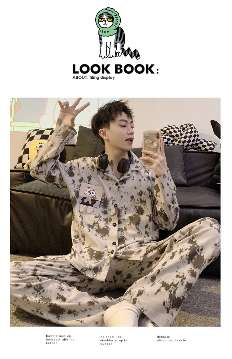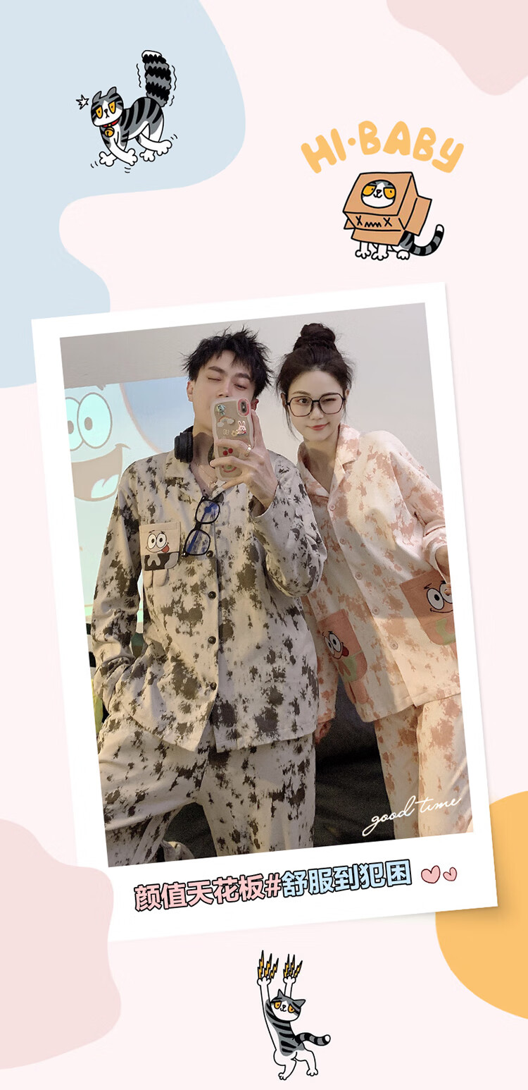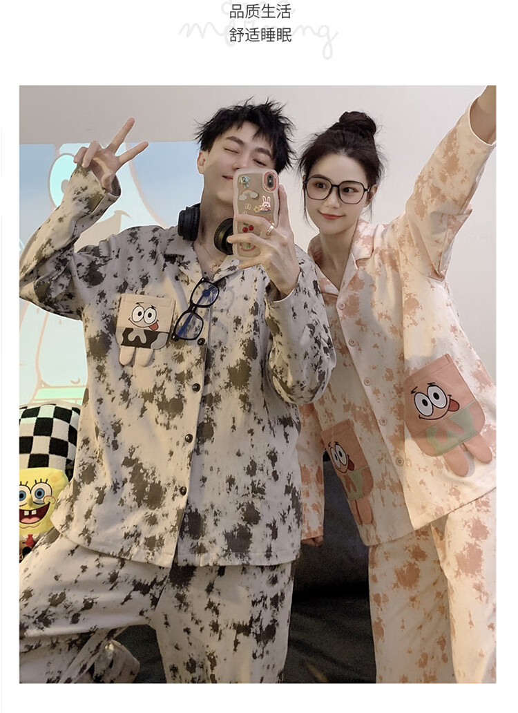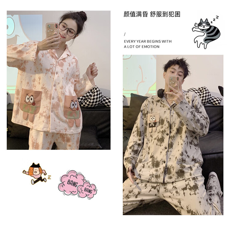 Mobeihai star couple pajamas spring and autumn long-sleeved pure cotton cartoon Japanese ins style men's and women's home wear two-piece set TM-2278 Black Stitch L male