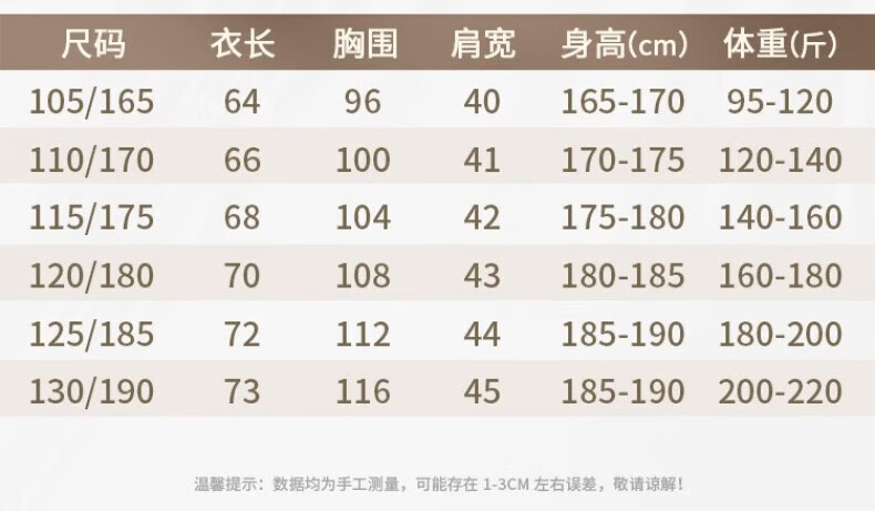 China (cm) 165 / 88-90 170 / 96-98 175 / 108-110 180 / 118-122 185 / 126-130