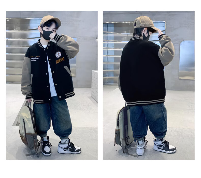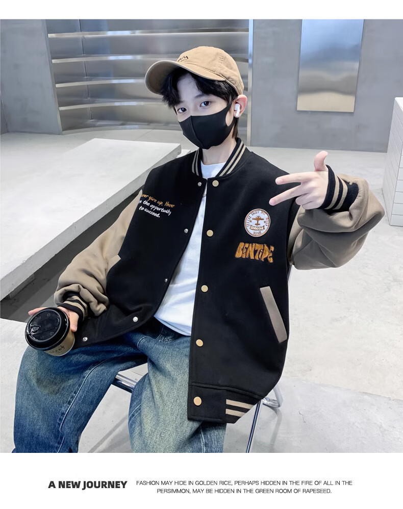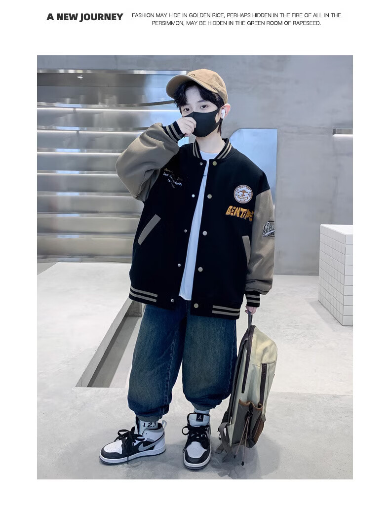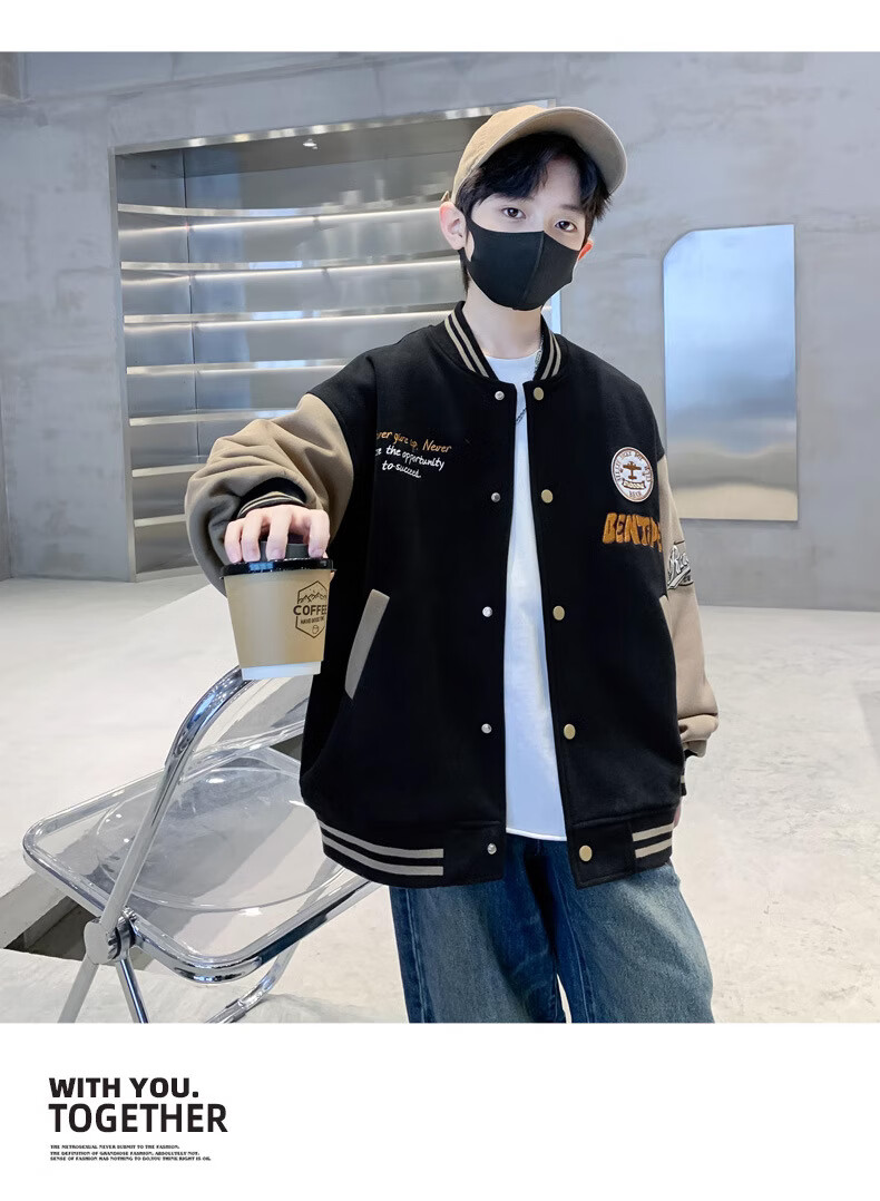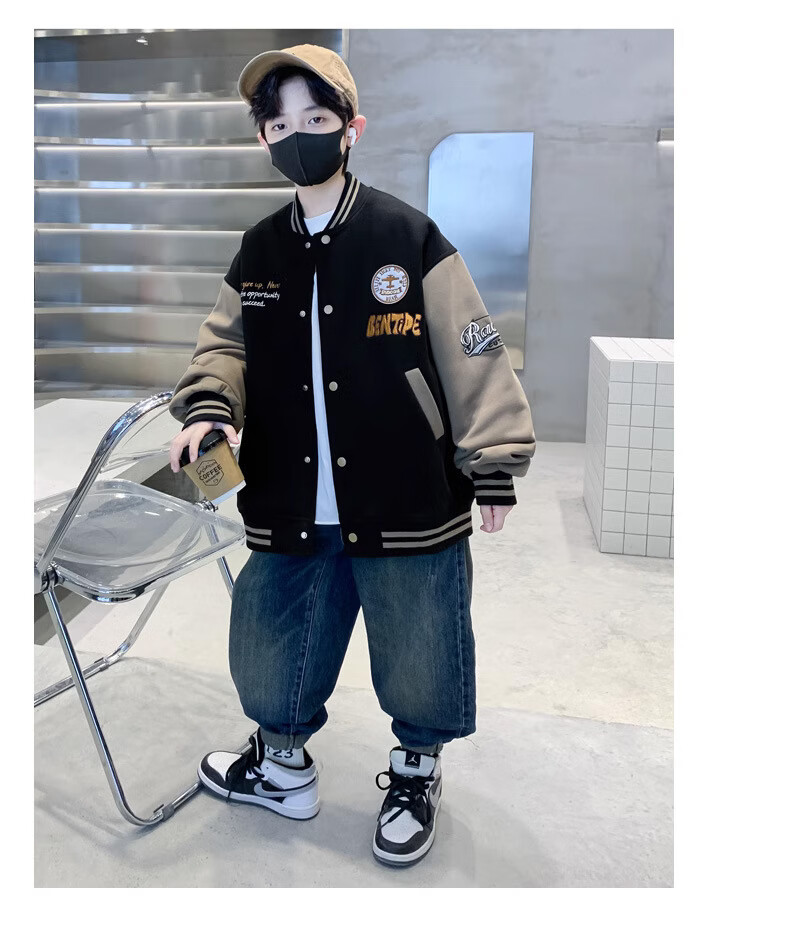 Children's coat baseball jacket thick velvet boys spring autumn winter 2024 new medium and large children's clothing boy jacket top wj-01-black-velvet thickened 160