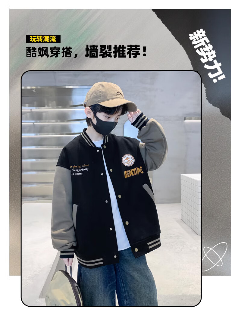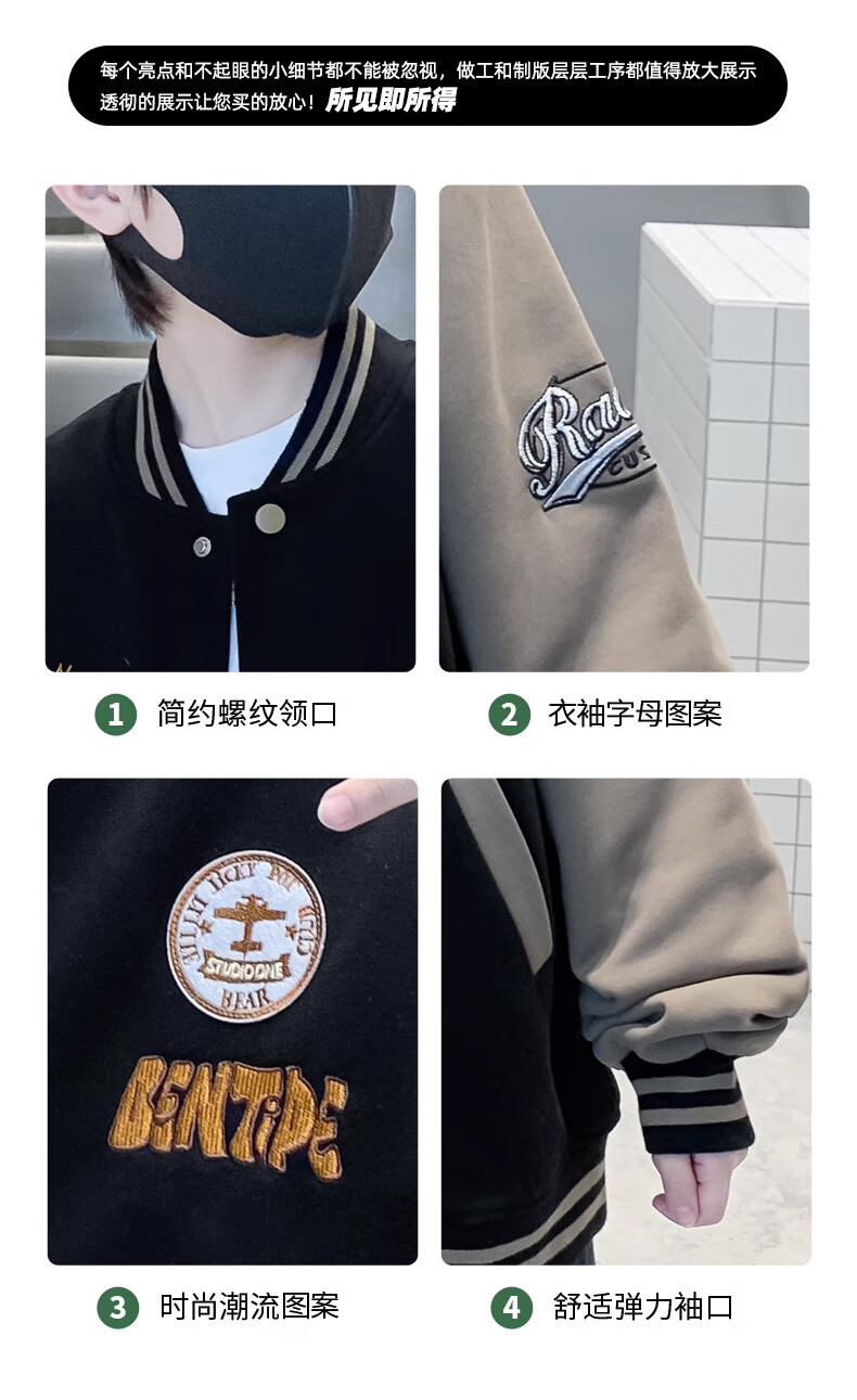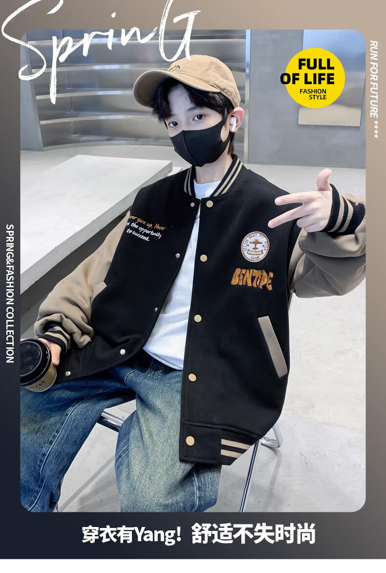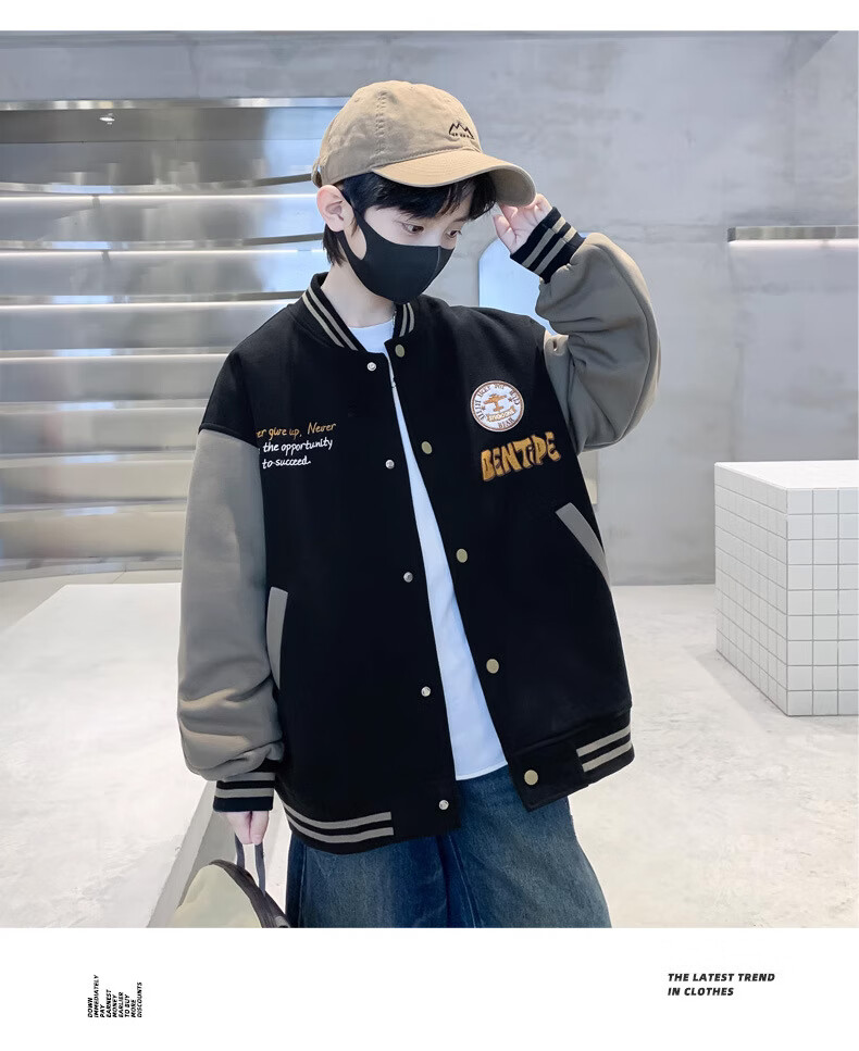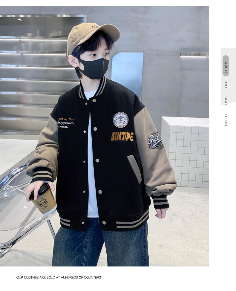 Children's coat baseball jacket thick velvet boys spring autumn winter 2024 new medium and large children's clothing boy jacket top wj-01-black-velvet thickened 160