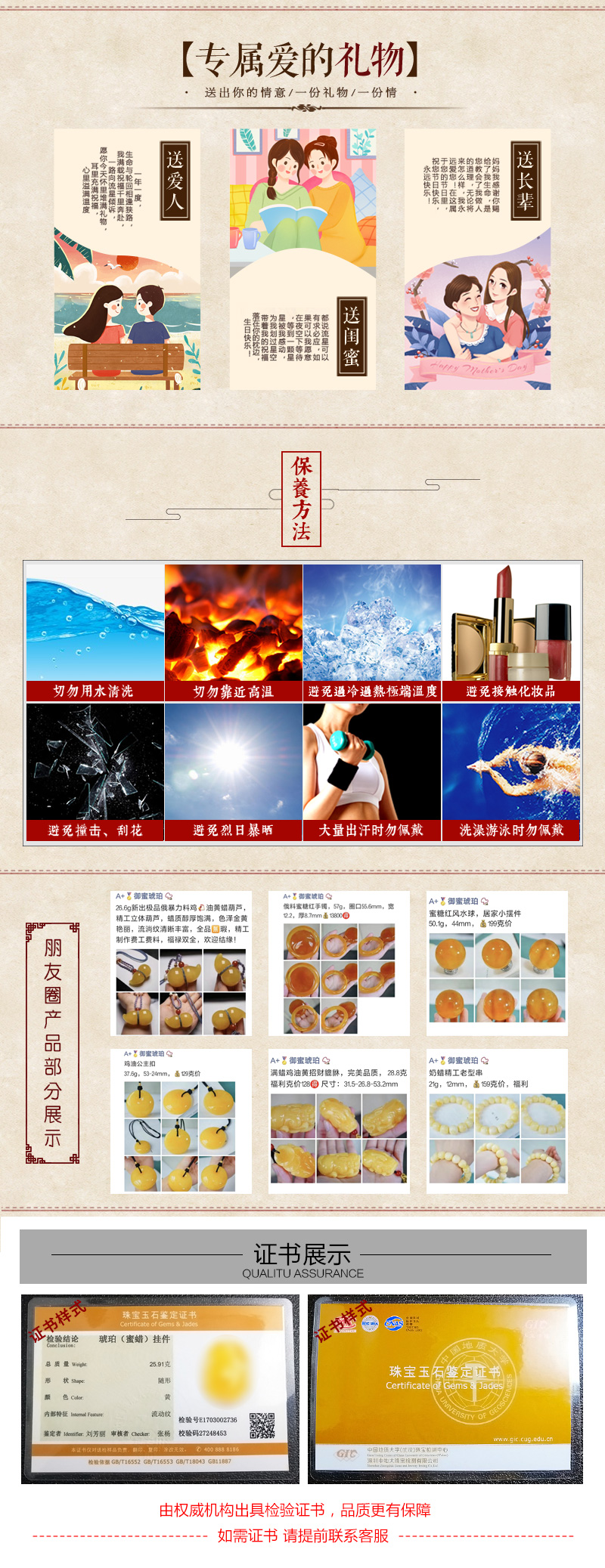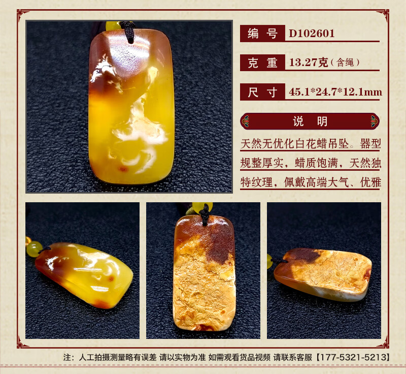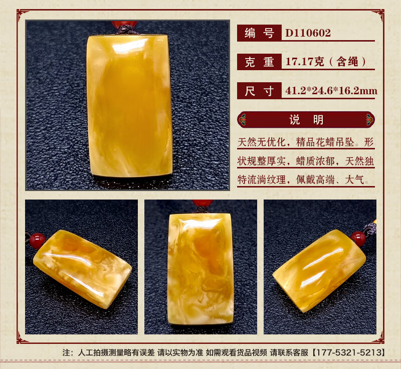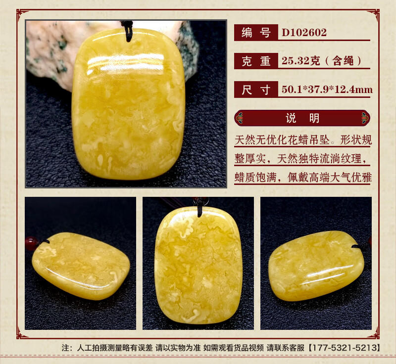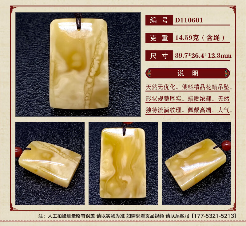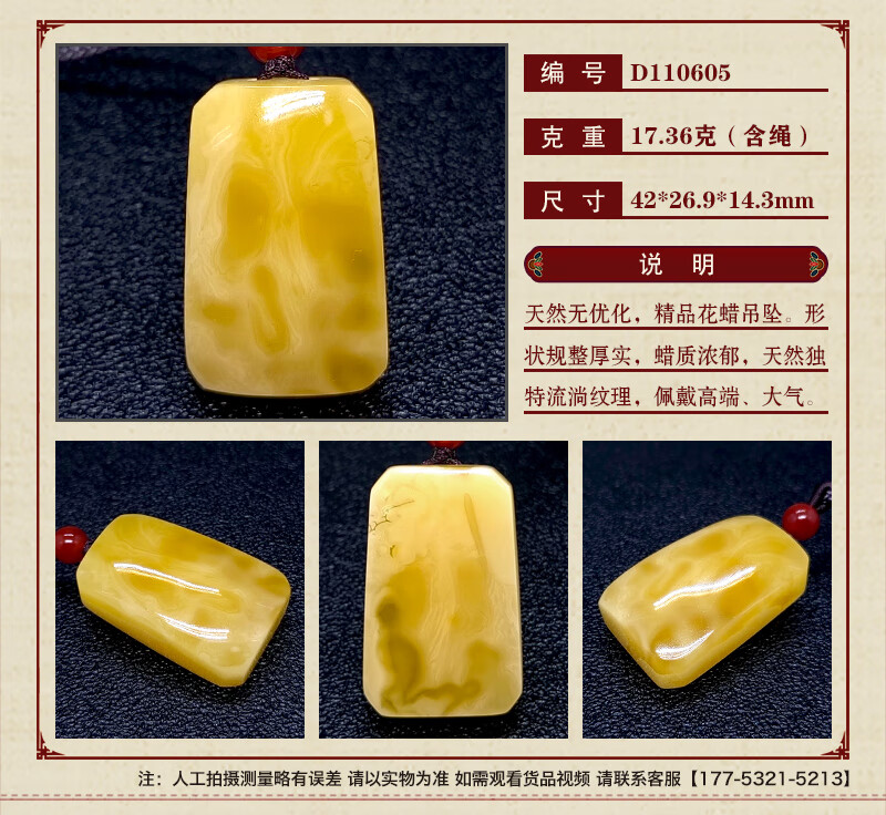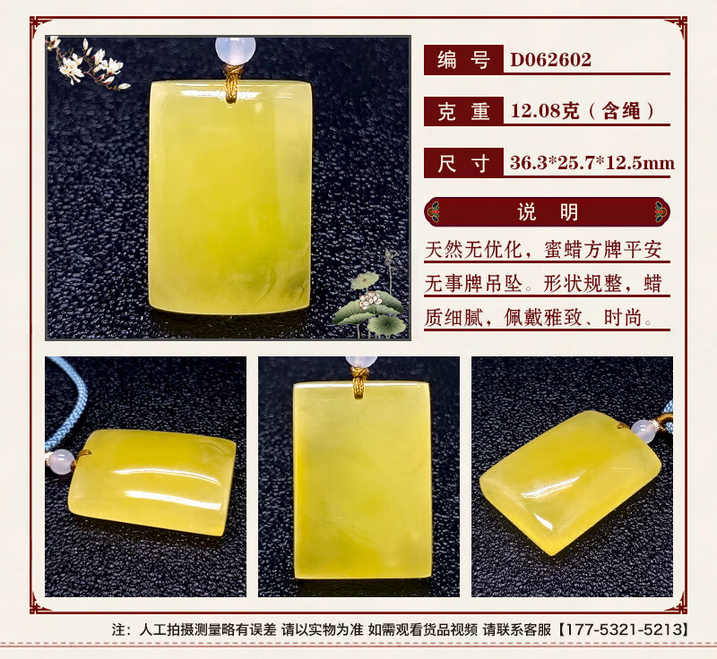 Royal Honey Natural Amber Beeswax Pendant Ping An Wu Shi Brand Flower Wax Square Brand Cut Handle Piece Raw Mineral Unoptimized Men and Women Model D110605 17.36g (with National Inspection Certificate)