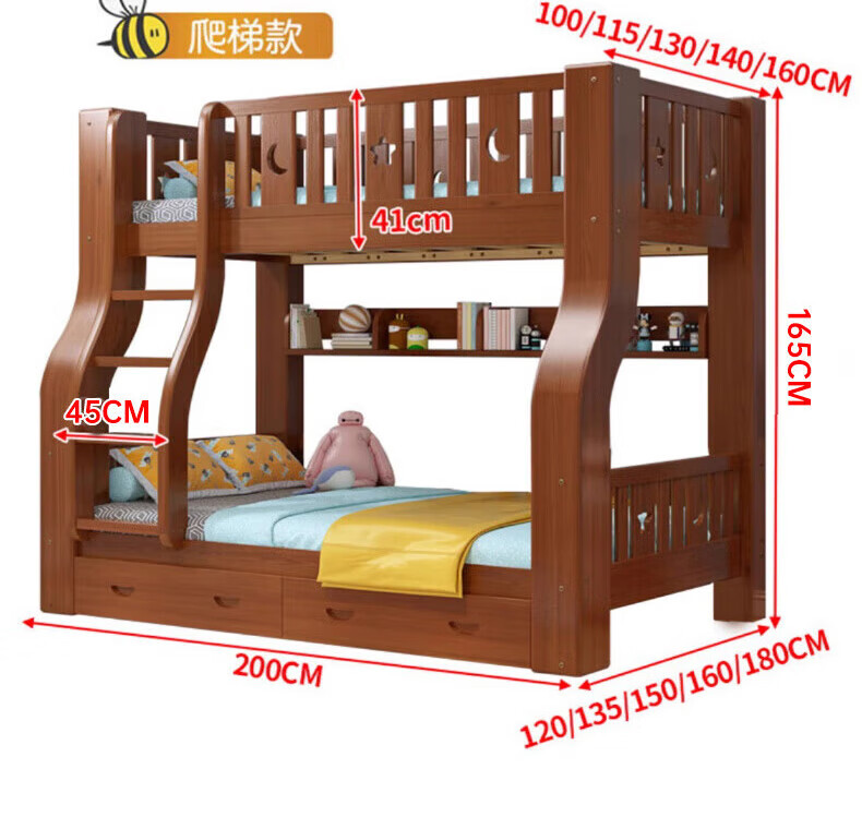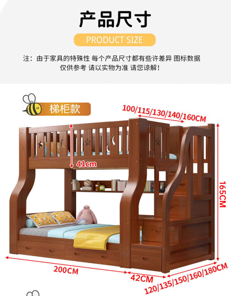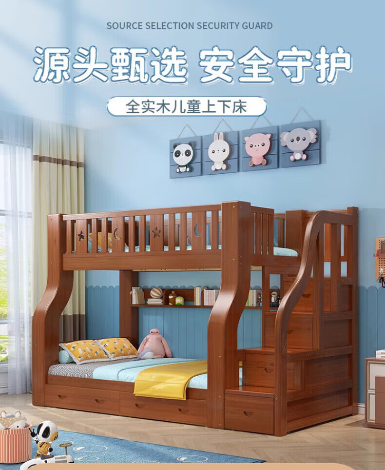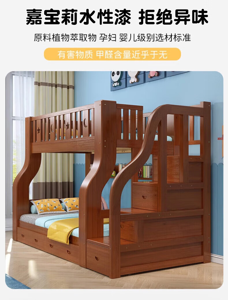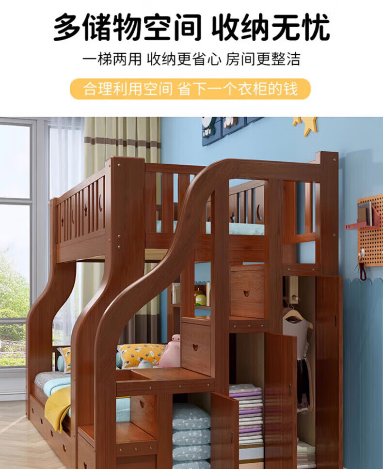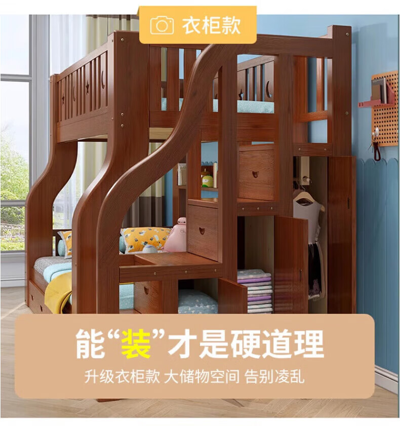 Chenyueju One-day fast delivery walnut wood upper and lower floors all solid wood children's bunk bed, high and low double-decker bunk bed, ladder cabinet type, upper bunk width 1.3 meters, bottom bunk width 1.5 meters