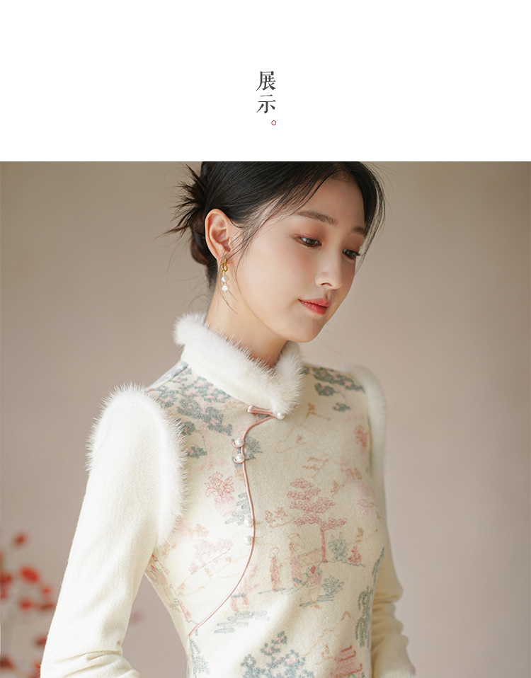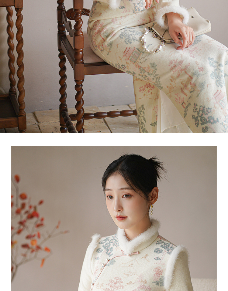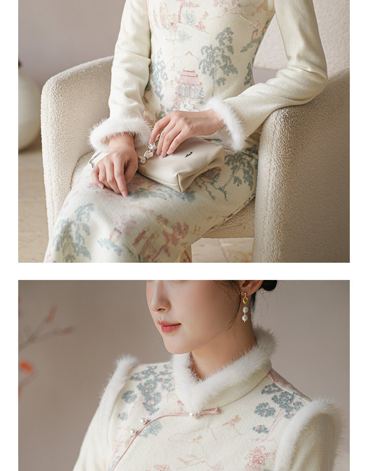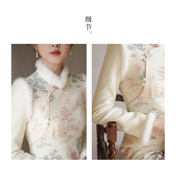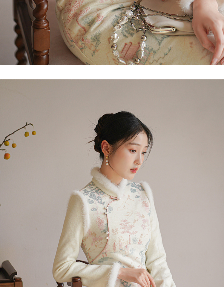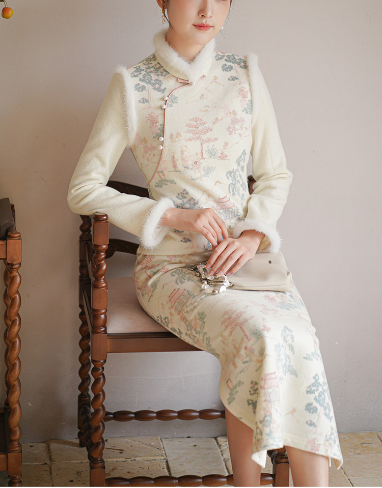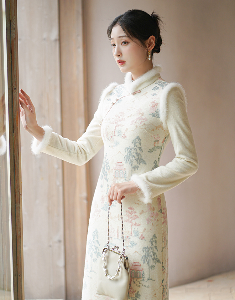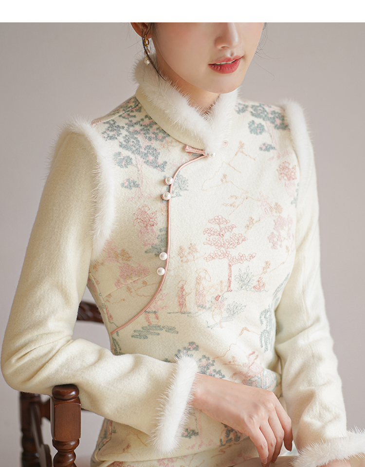 Chuchan Clothing New Chinese Dress Women's Autumn and Winter New Waist Embroidered Mink Fur Gentle Chinese Style Improved Cheongsam Off-White L (Ready Stock)
